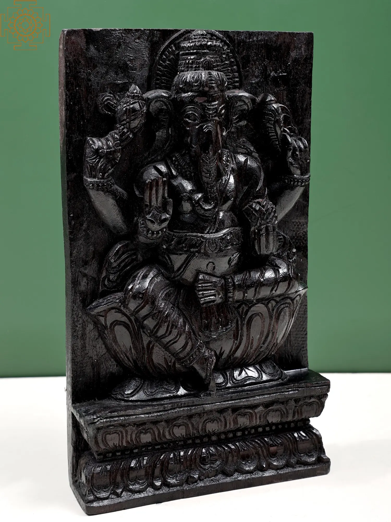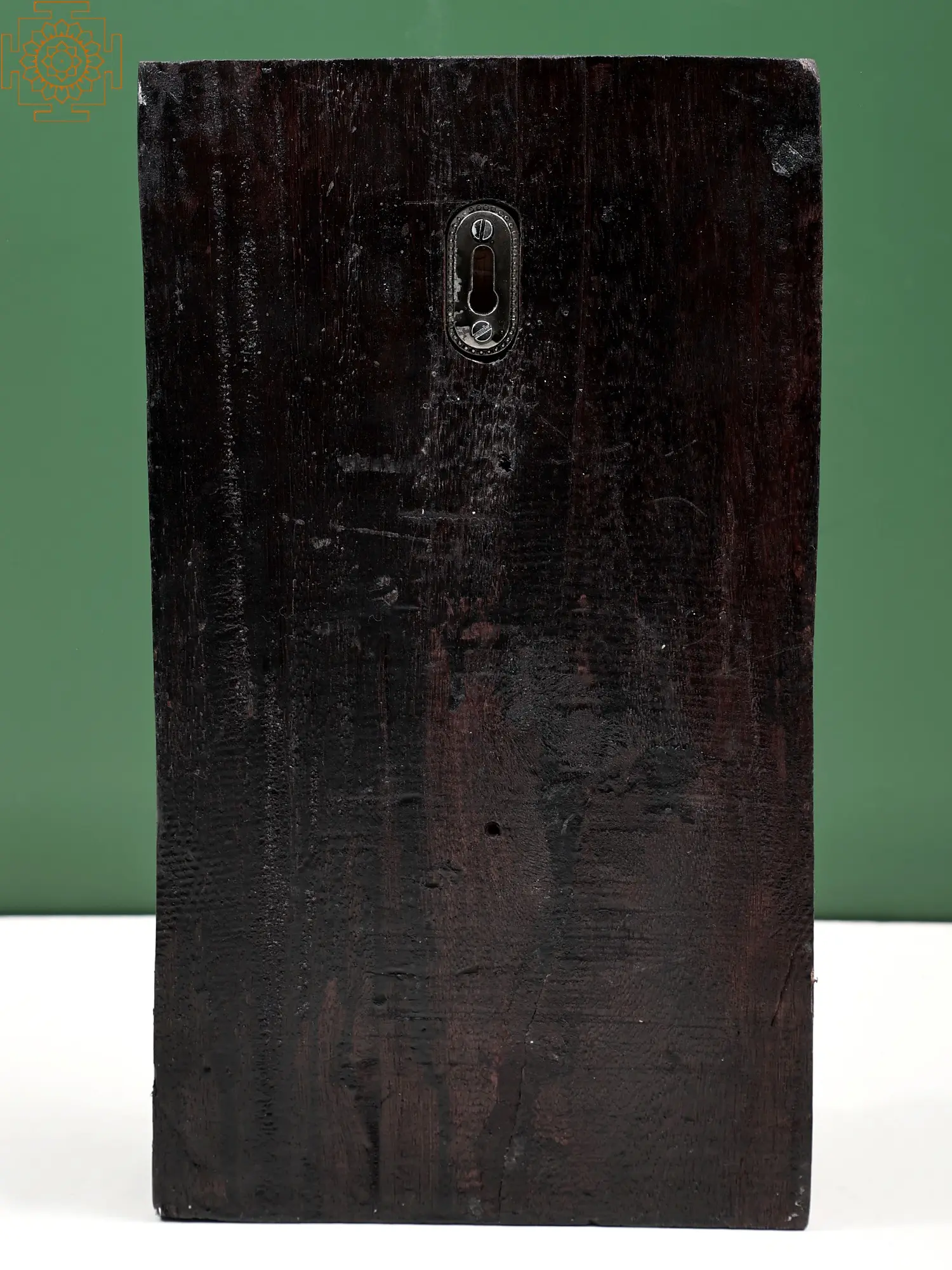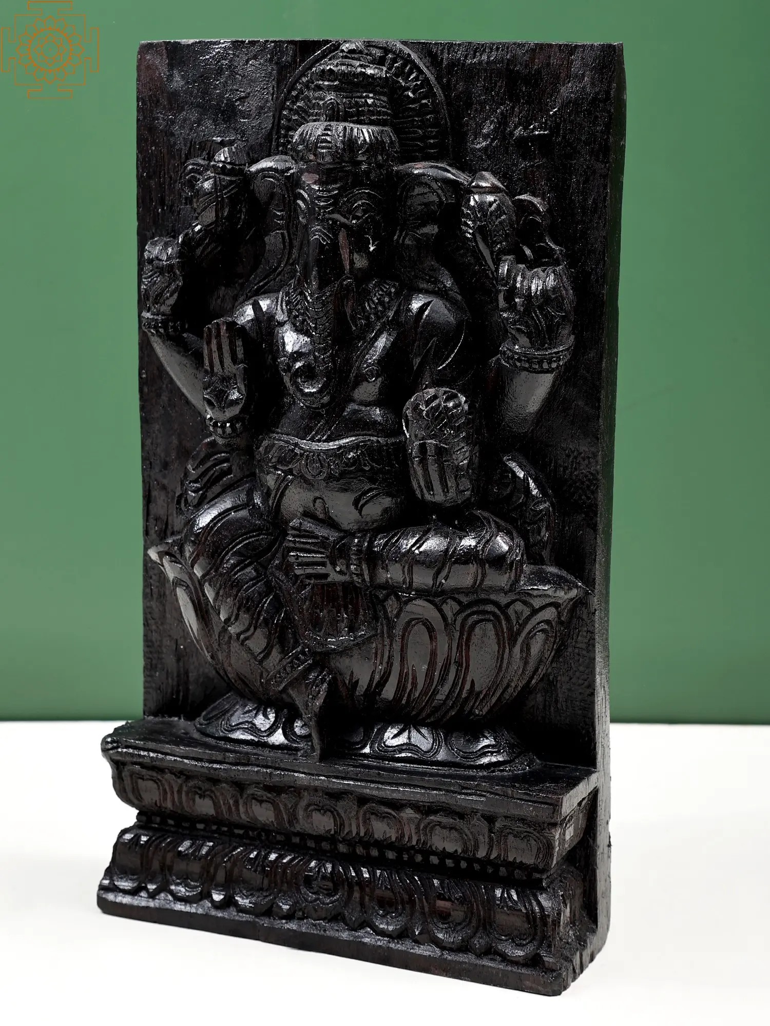 Lord Ganesha, “the harbinger of auspicious beginnings”, seated gracefully upon a lotus throne, captivates the beholder with eternal charm. In his four hands, Ganesha, “also called Avneesh (The Master of the universe)”, wields a goad (Ankusha) and noose (Pasha), symbolising control over desires and worldly attachments. The front right hand extends in the “Abhaya Mudra”, assuring protection to the devotees. Gracing his palm is the sweet Modak, an epitome of celestial bliss. Worshipping this enchanting form, carved in wood, bestows myriad blessings. This work of art embodies the philosophy of transcending impediments, embracing fearlessness, and relishing the nectar of spiritual wisdom, offering solace to those who seek his divine grace.