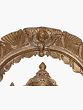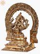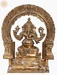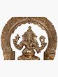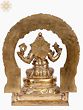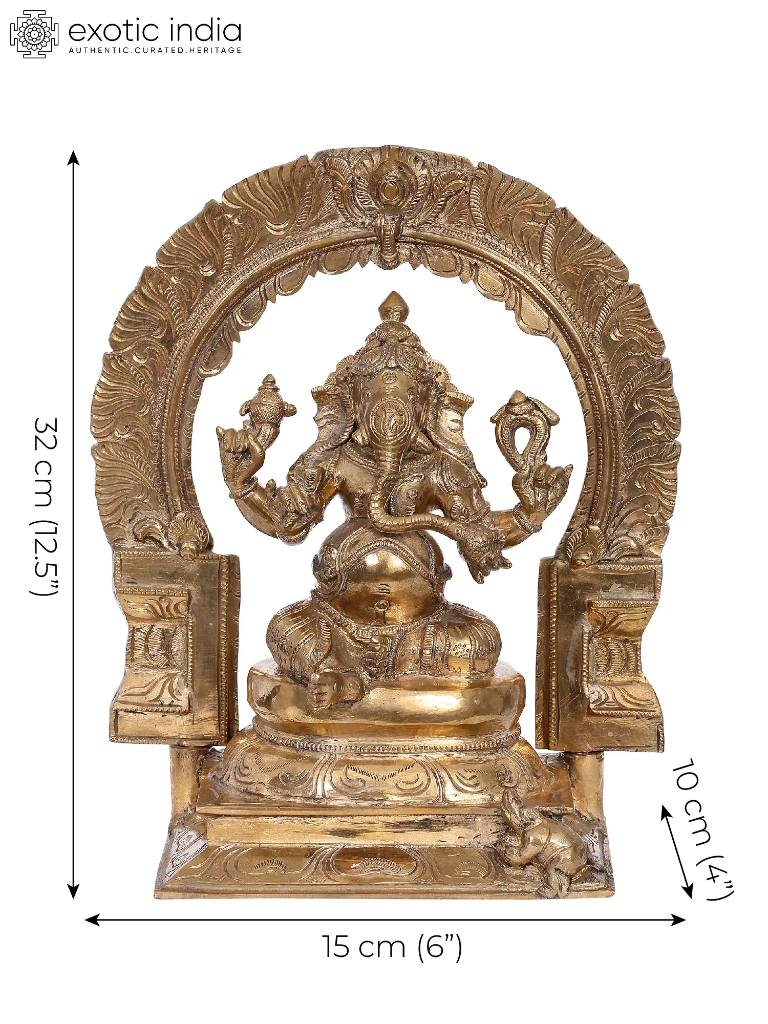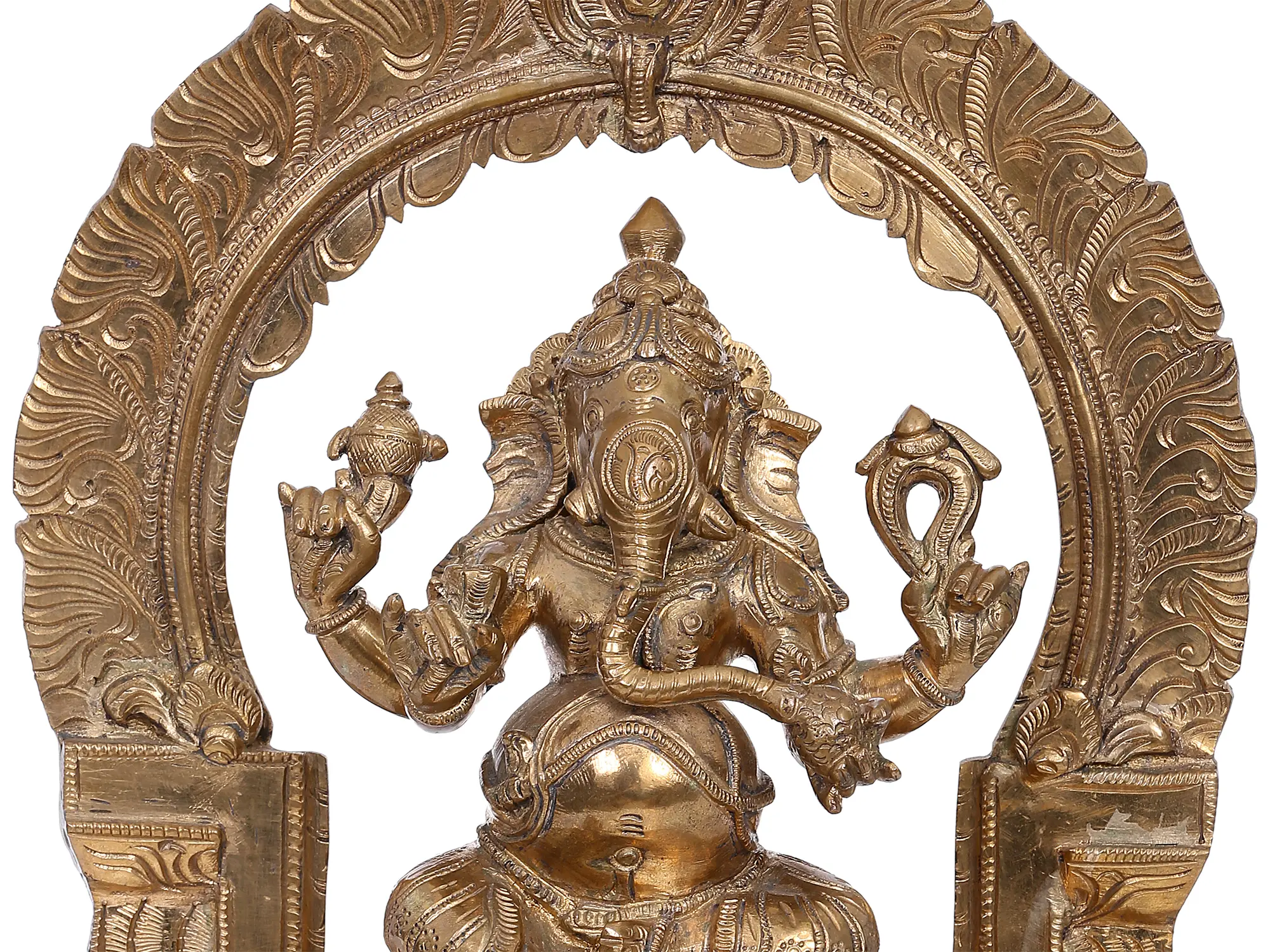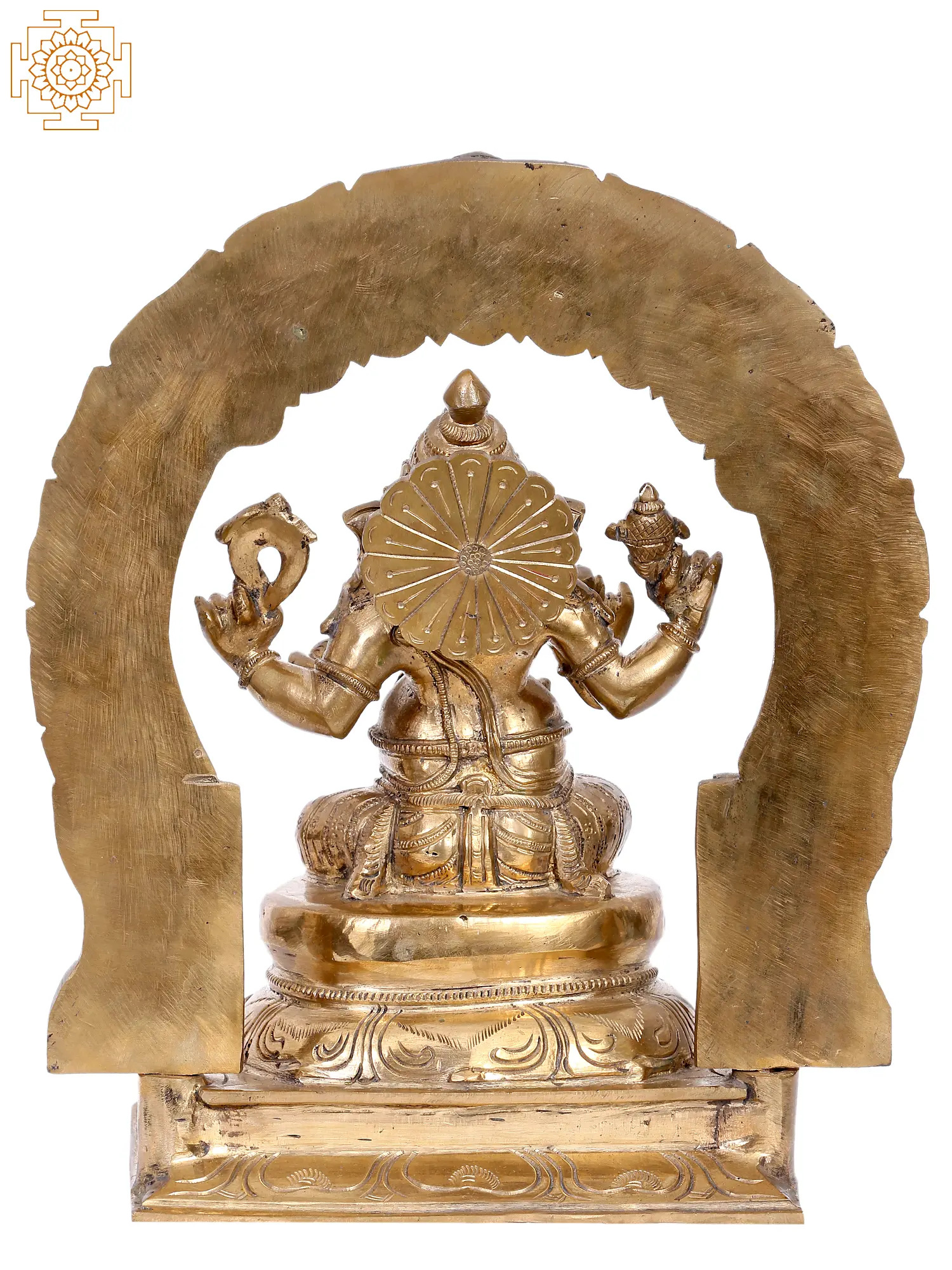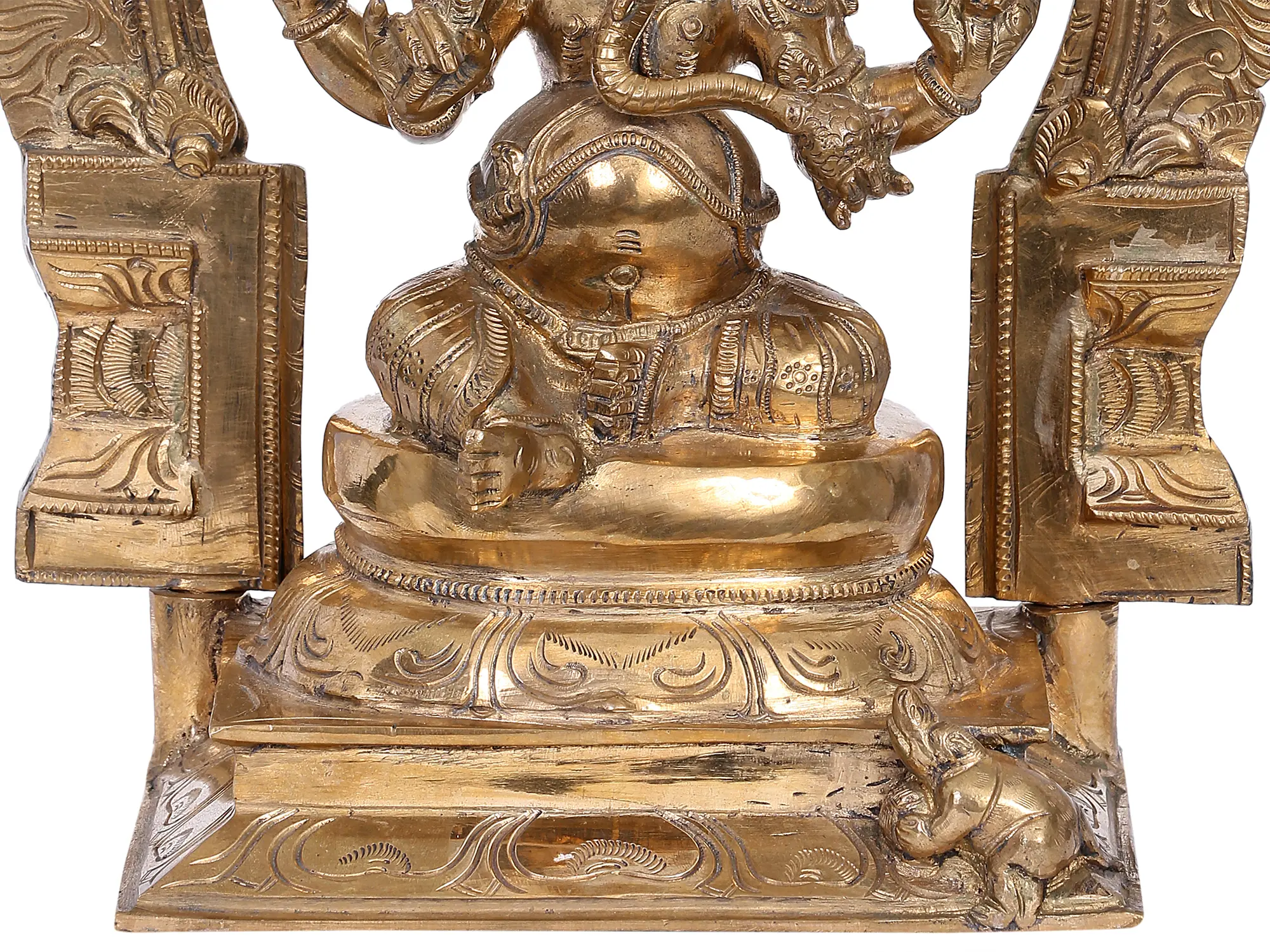 Enthroned on an elaborate throne, emanating divine grandeur with his presence, Lord Ganesha in this Panchaloha murti embodies all splendor and auspiciousness of the three realms. His presence is marked by an imposing aureole attached to his inverted lotus seat, both intricately embellished with fine incised lines.