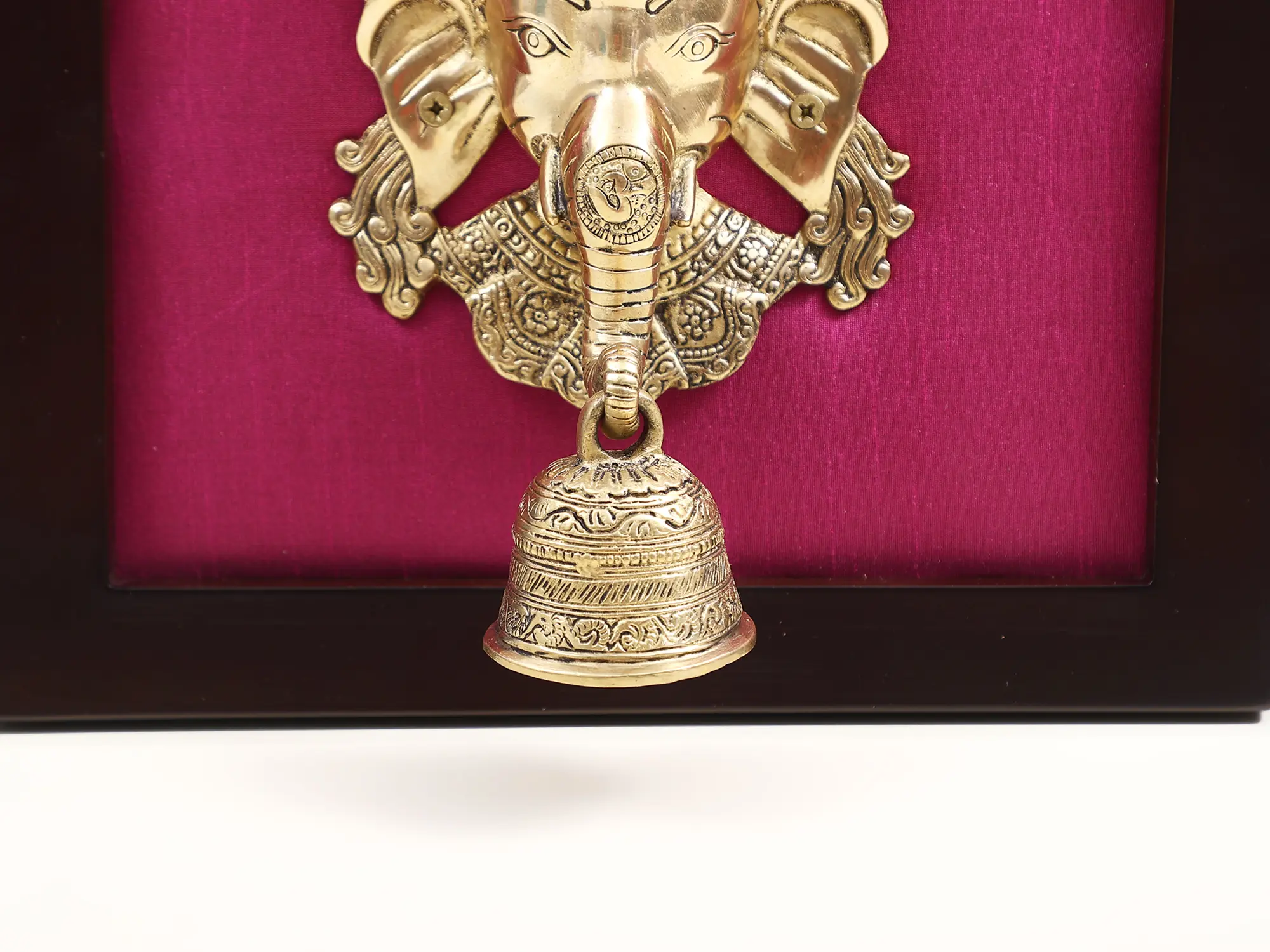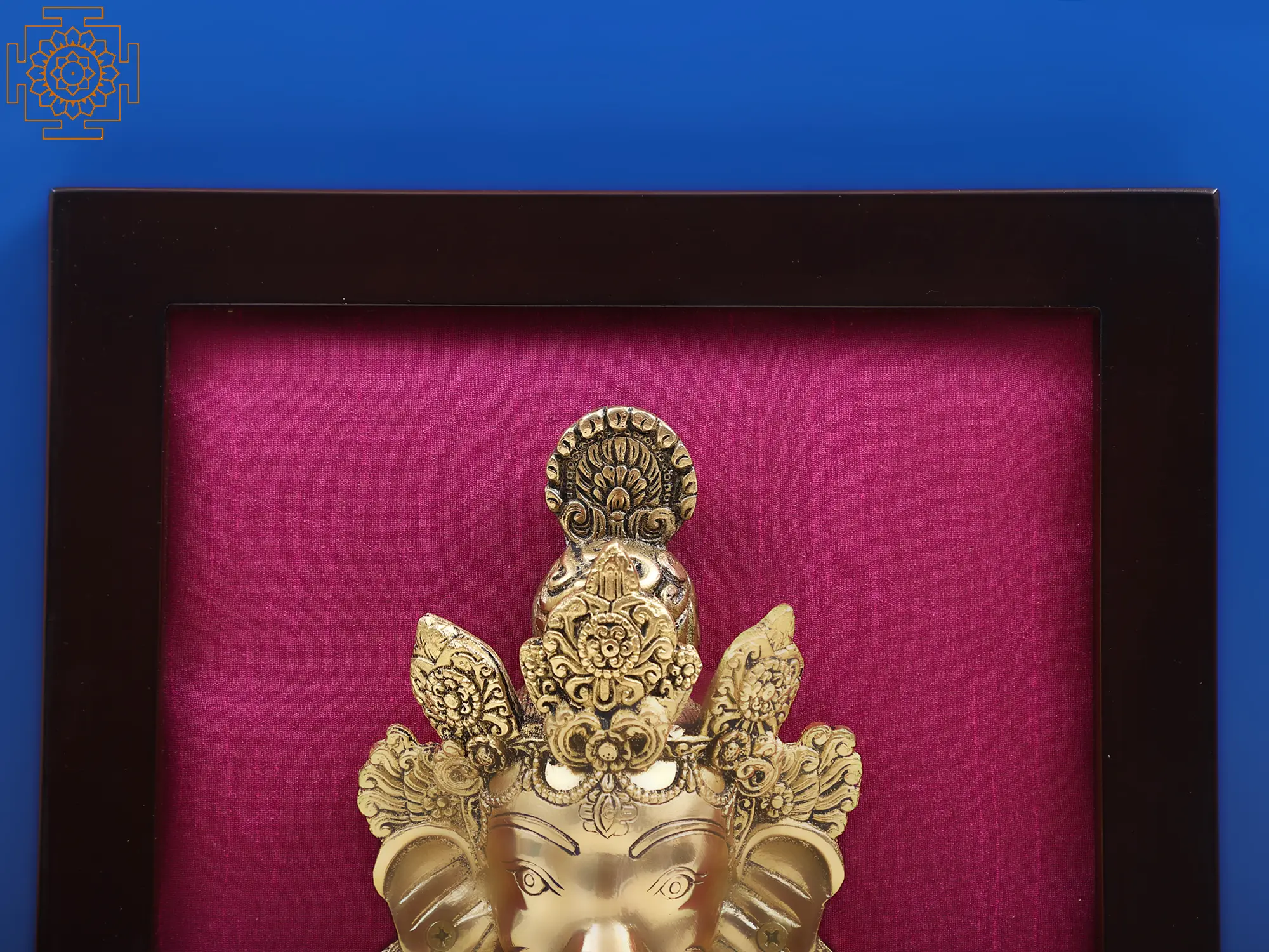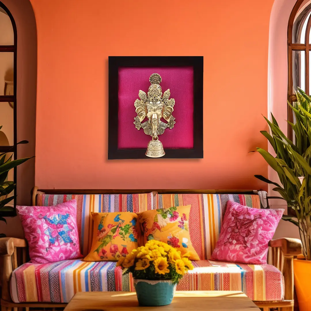 This resplendent brass Ganesha mask is presented within a rich, dark wooden frame, creating a sophisticated juxtaposition of textures and colors. The deep hue of the wood provides a grounding contrast to the golden luster of the brass, while the vibrant, rich fabric backing adds a touch of opulence. The combination of materials – the enduring strength of brass, the natural warmth of wood, and the tactile richness of the fabric – creates a harmonious and visually stunning display. This framed presentation makes it ready to be hung, transforming any wall into a sacred altar or a gallery of divine art. It is a perfect addition to your pooja room, living area, or entryway, serving as a constant reminder of divine guidance and blessings.
