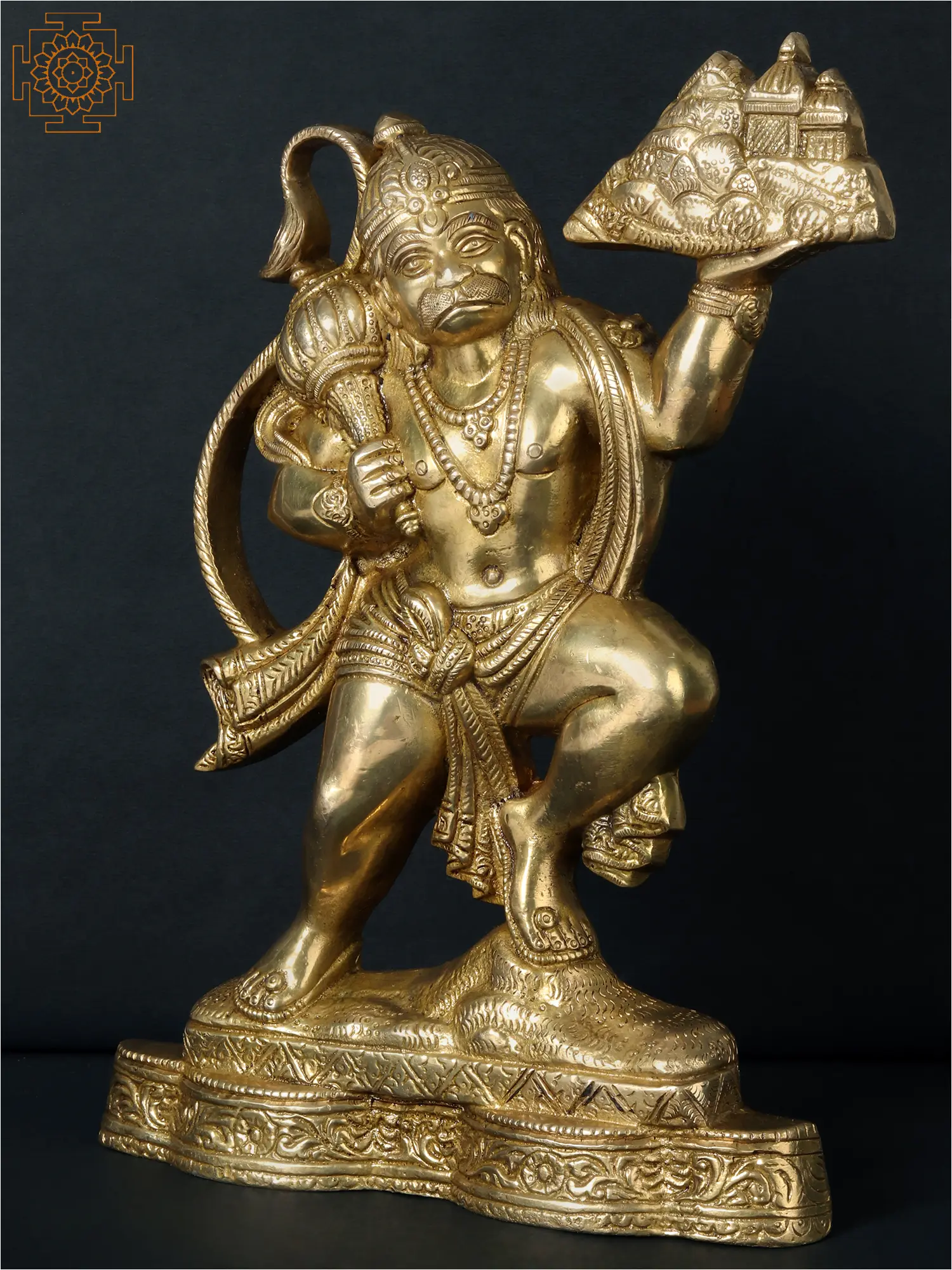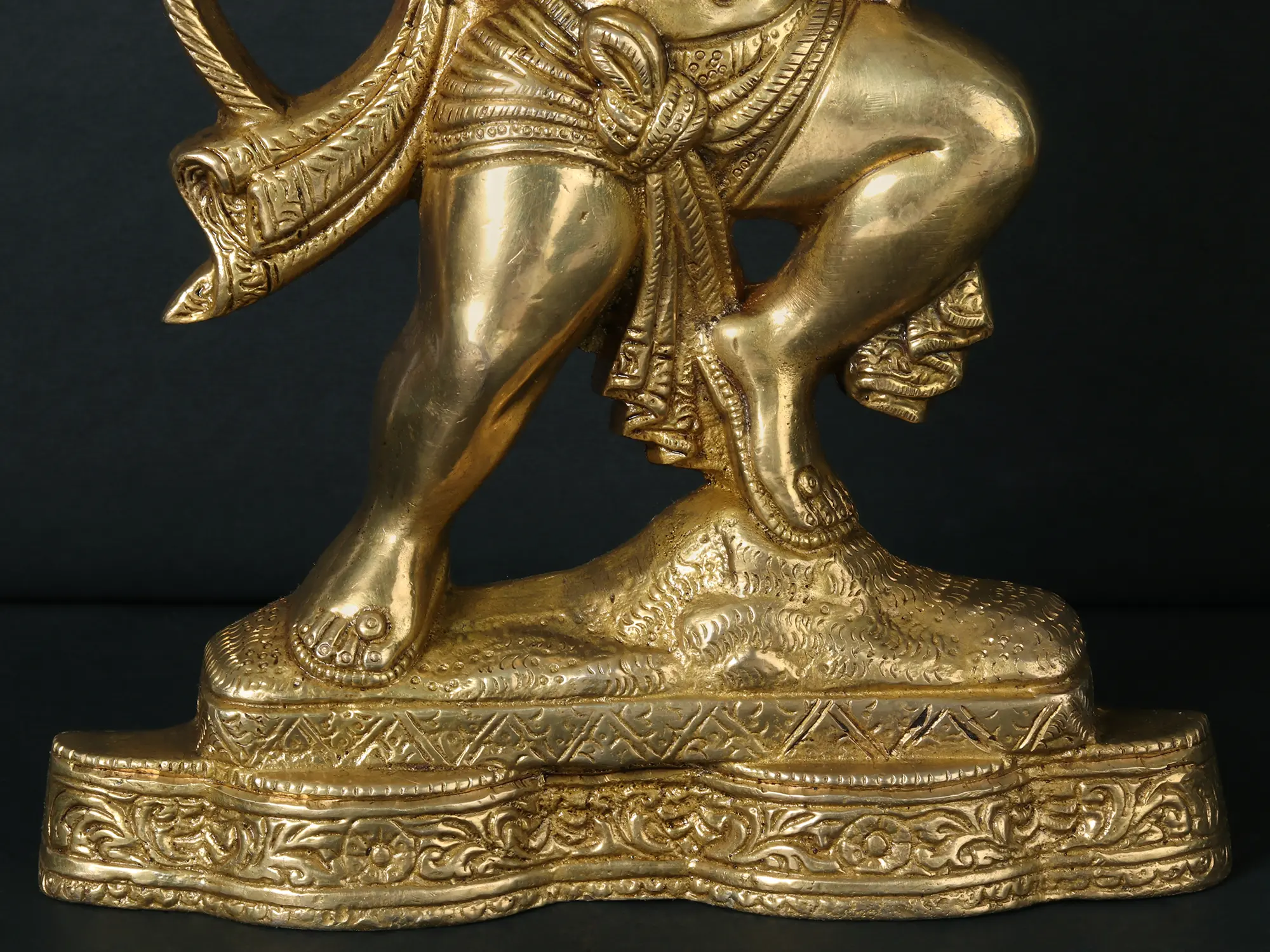 With colossal might, Lord Hanuman, the Ardent Devotee of Lord Rama and One of the Chiranjivis, cradles the life-giving Sanjeevani Mountain upon his sinewy hand, a symbol of boundless compassion. The radiant crown atop his noble brow and flowing robe speak of regal grace, while his fierce mace, perched upon his sturdy shoulder, signifies unwavering protection. In this majestic brass sculpture, Hanuman’s resolute gaze pierces the heavens, ready to soar into the realm of miracles. The act of carrying the Sanjeevani Mountain epitomises selfless service, an eternal reminder that even the loftiest burdens can be borne when love and devotion infuse the heart.