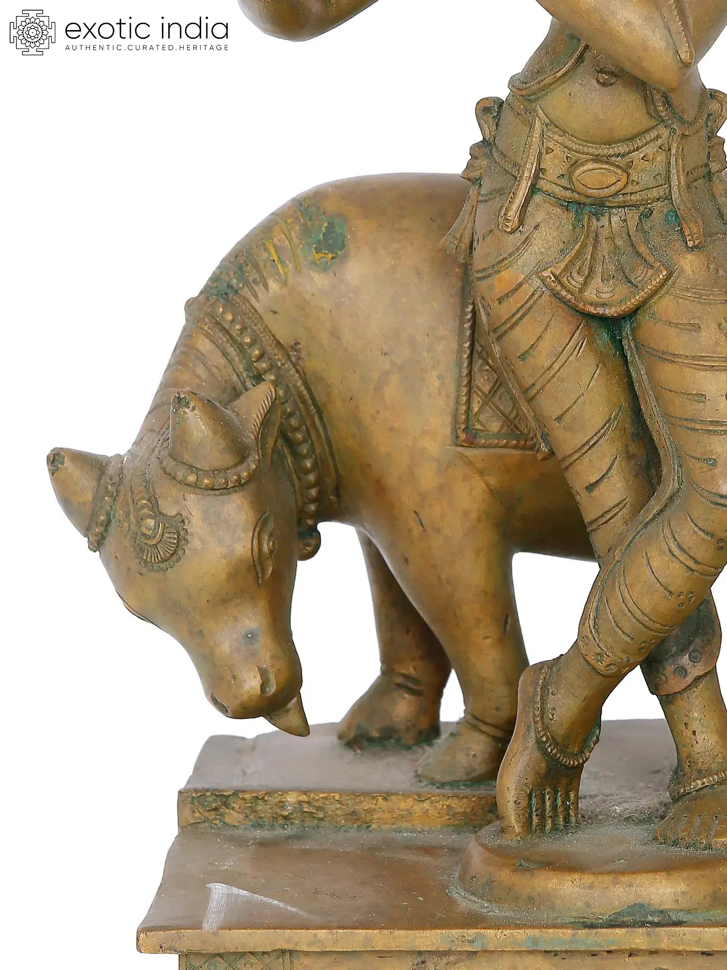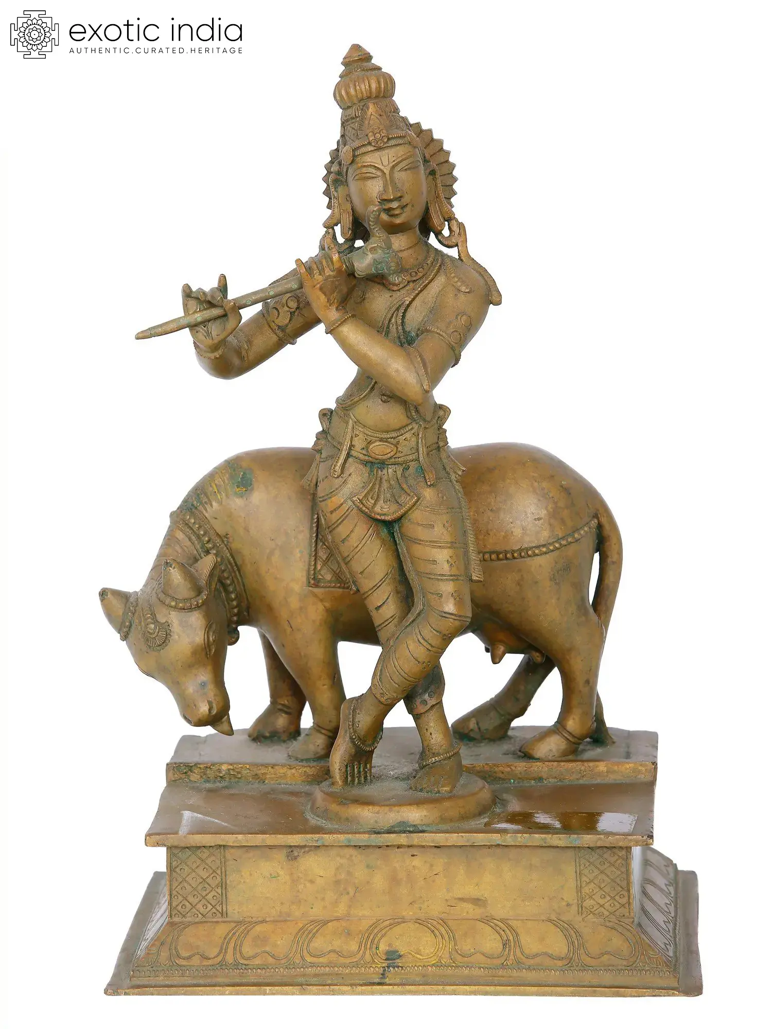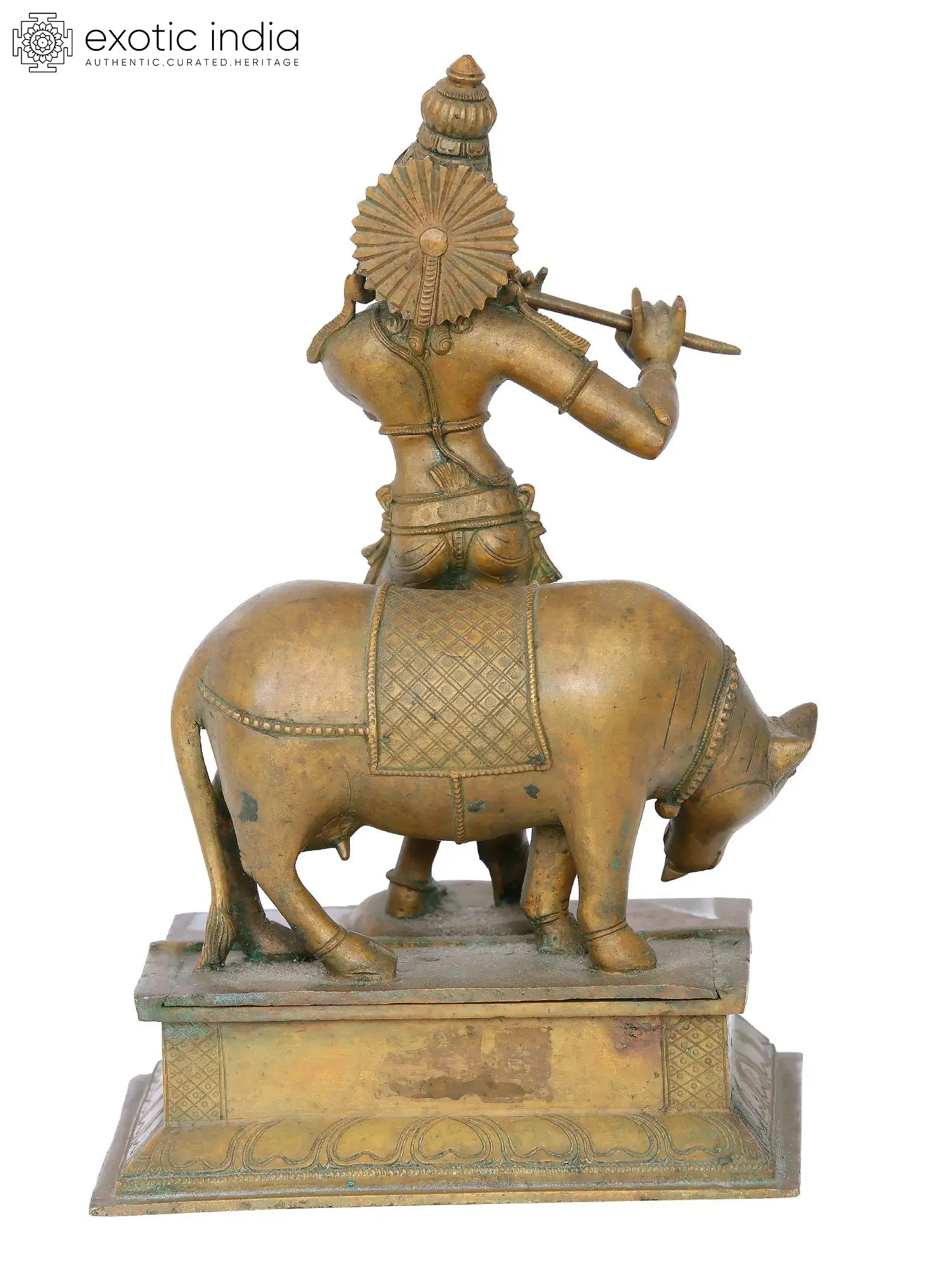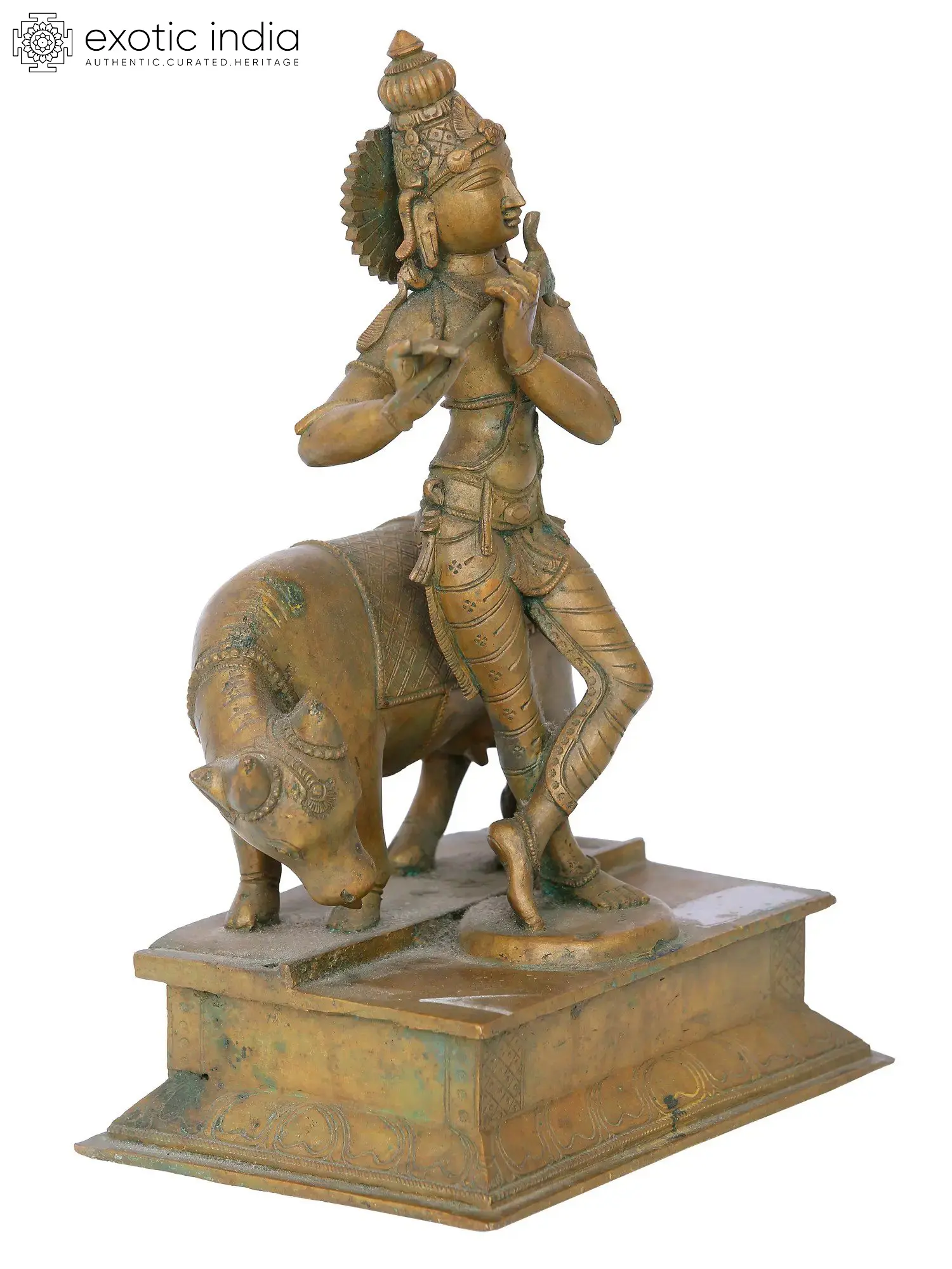 Witness the divine harmony with Krishna playing flute with his Cow sculpture, created through the Madhuchista Vidhanam in Swamimalai's Panchaloha Bronze. Beyond its artistic finesse, this sculpture encapsulates the Hindu philosophical concept of 'Symbiosis,' portraying the inseparable bond between Krishna and his cow. The flute's melody represents the cosmic resonance, and the cow symbolises the nurturing nature of the divine. Immerse yourself in the spiritual symbolism, as this sculpture echoes the profound connection between the cosmic creator and creation.