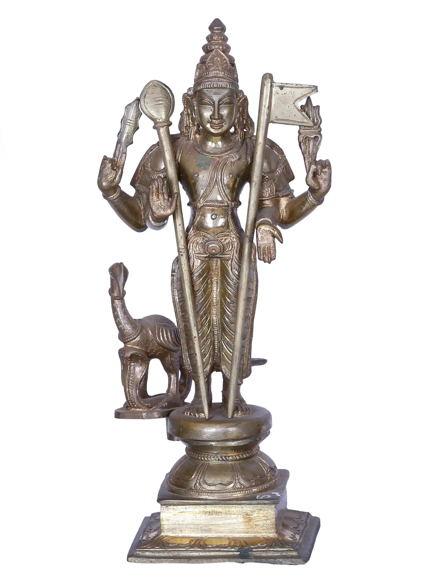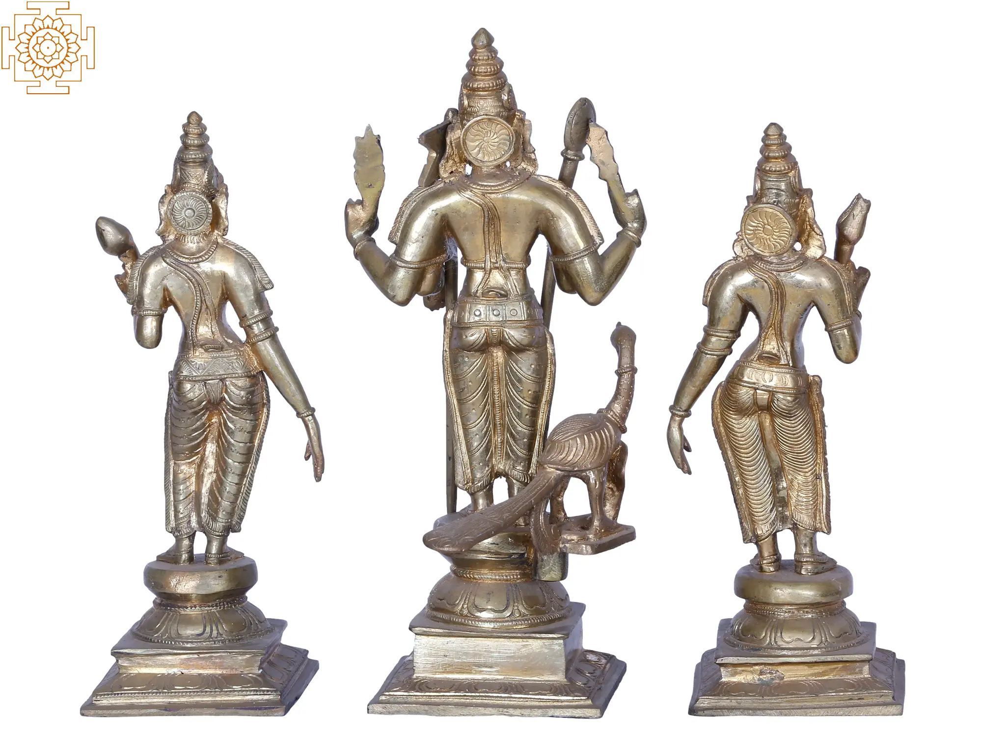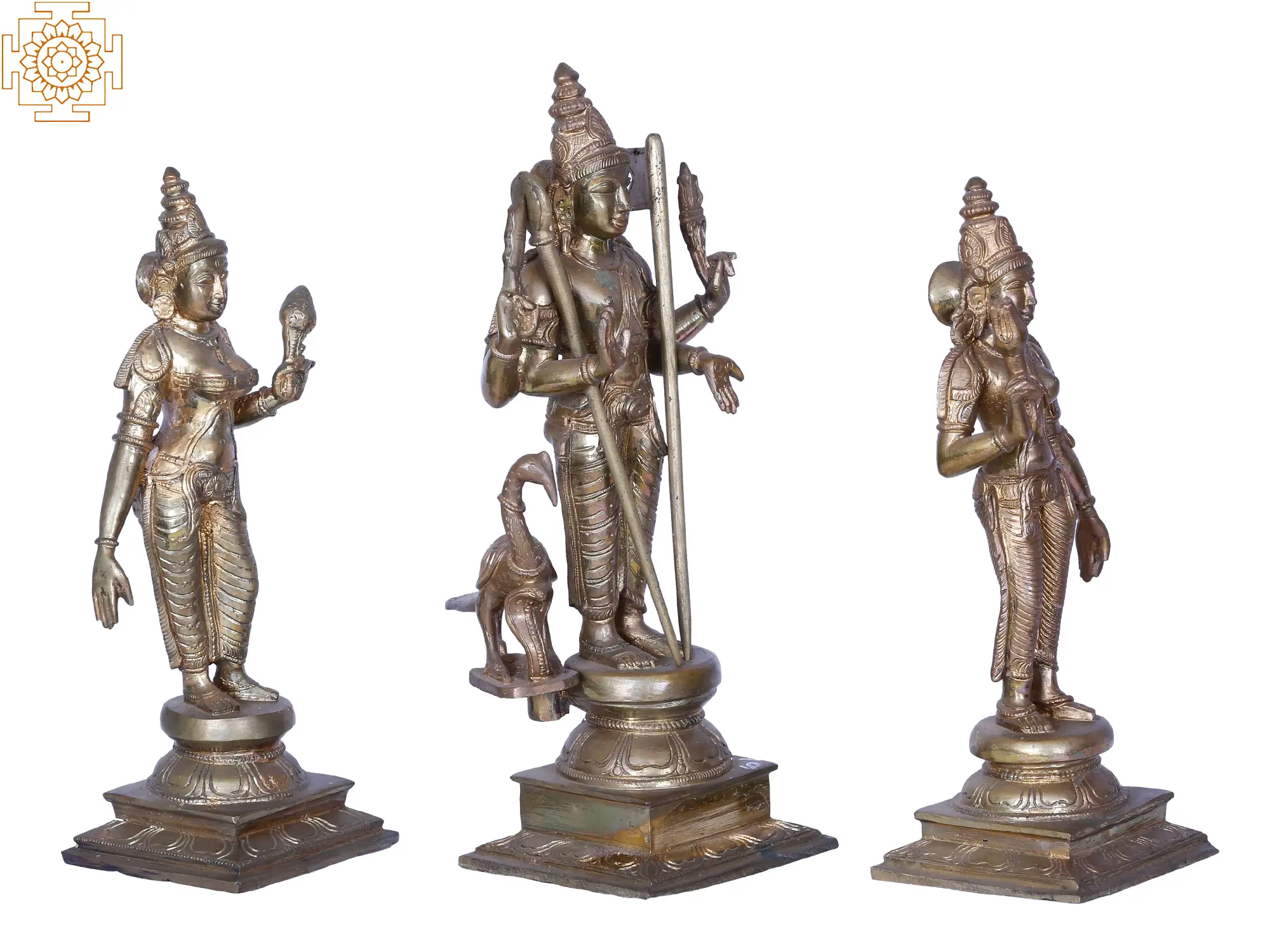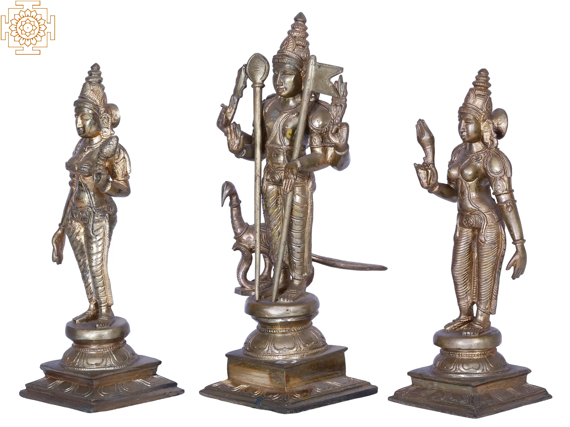 In this celestial tableau of divine love and strength, crafted in Panchaloha bronze from Swamimalai, using the ancient “Madhuchista Vidhana (Lost-Wax) technique”, Lord Kartikeya, the Commander of the Celestial Army, stands resplendent on a lotus pedestal, flanked by his ethereal consorts, Devasena and Valli. Lord Murugan’s four arms wield the formidable Soola Kathi (the diamond shape Vajra0) and trident (Trishul), emanating power and cosmic authority. The Shakti Vel, a potent spear, and the fluttering Seval Kodi (flag) accompany him. Devasena, “the celestial Daughter of Indra”, graces his left, holding a lotus with grace. On his right, Valli, “the daughter of a Chieftain”, stands with a lotus bud, symbolising purity and prosperity. Together, this divine trio epitomises the harmonious fusion of strength, love, and grace in the cosmic dance of existence.