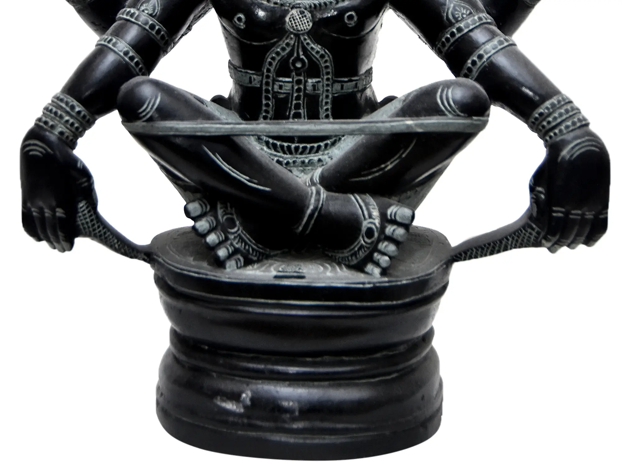 This exquisite stone statue captures Lord Narasimha in his awe-inspiring form, a powerful representation of the fourth avatar of Lord Vishnu. Crafted from durable Katappa stone, this deity embodies divine justice and the fierce protection offered to his devotees. The intricate detailing showcases the profound artistic skill dedicated to bringing this sacred form to life. The powerful lion's face, with its piercing gaze and flowing mane, signifies Narasimha's primal strength and untamed courage. His four arms, each bearing distinct divine attributes, are held in powerful poses, conveying his readiness to vanquish evil and restore cosmic order.
