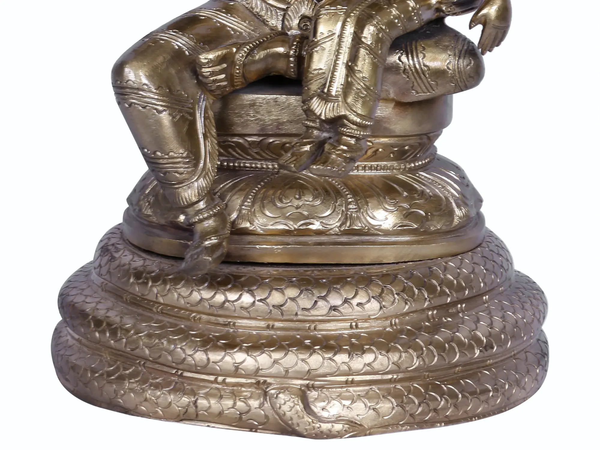 In this fine bronze composition, they are depicted in divine proximity to each other. He is chaturbhujadhari, while She is dvibhujadhari. Upon the ample coils of the gigantic Sheshanaga they sit, whose multitudinous hoods rise above the crowns on their heads.