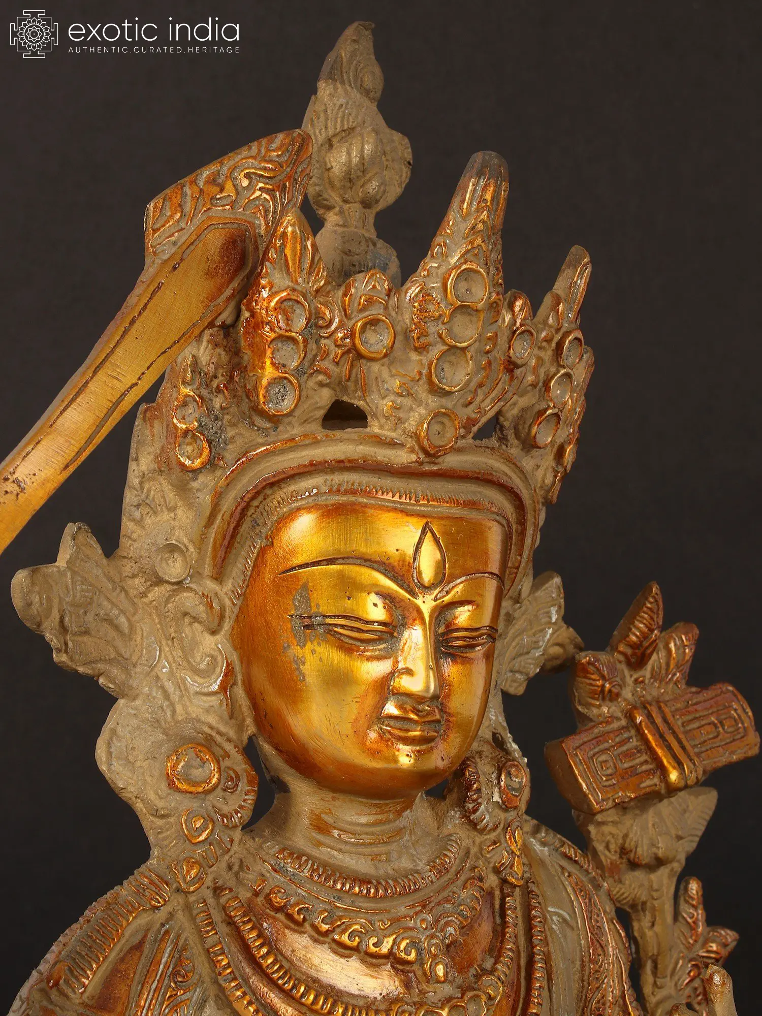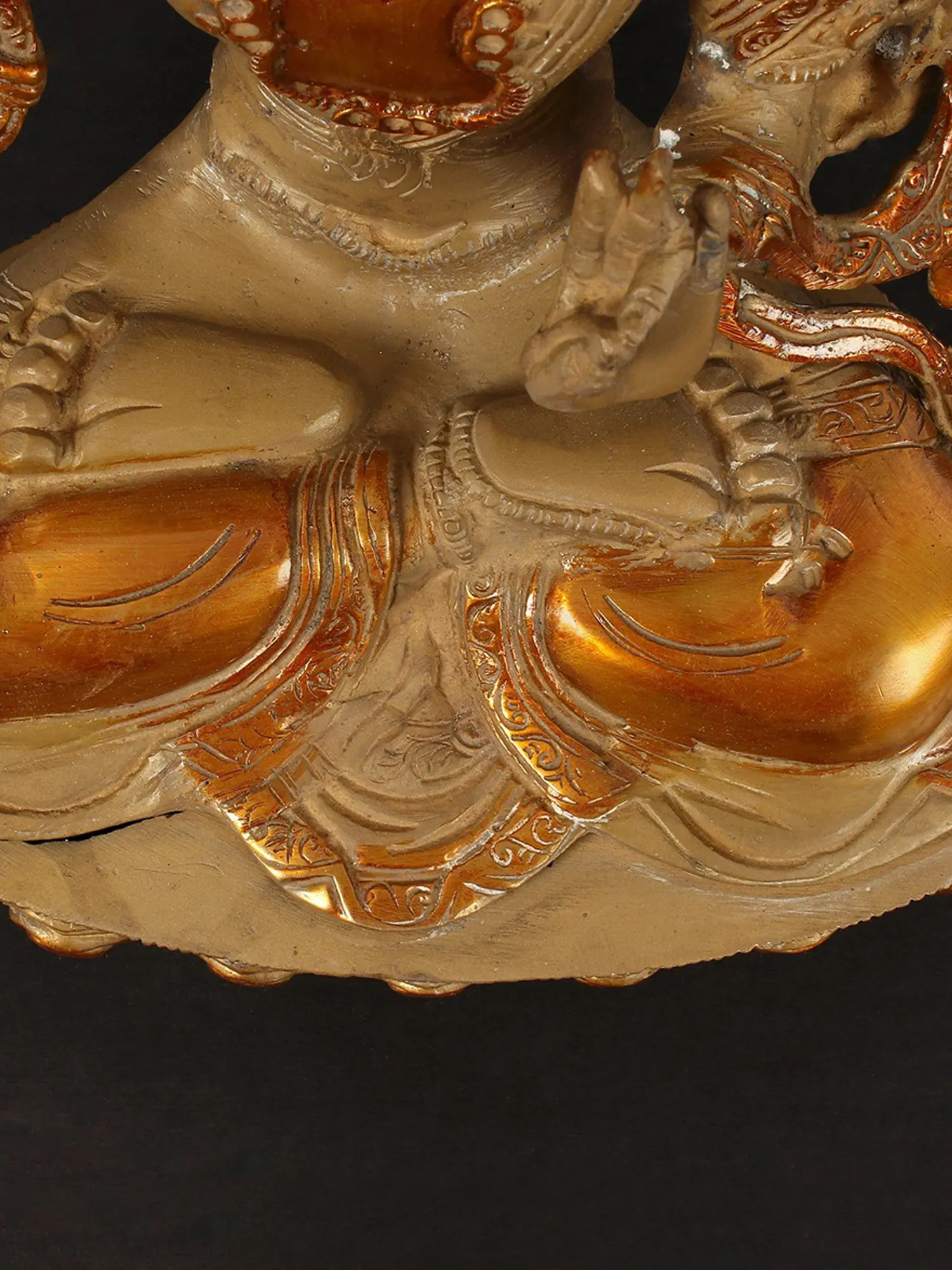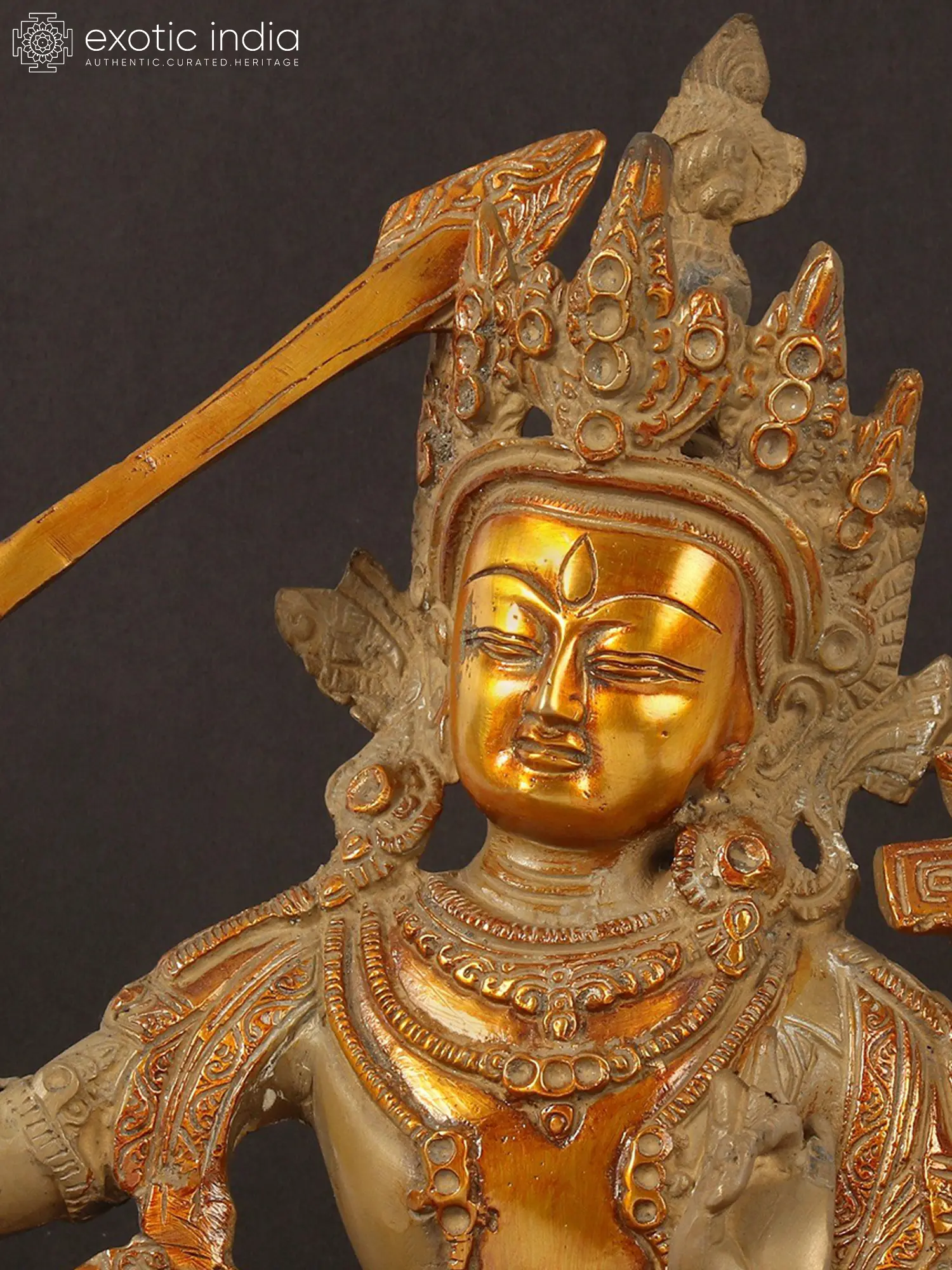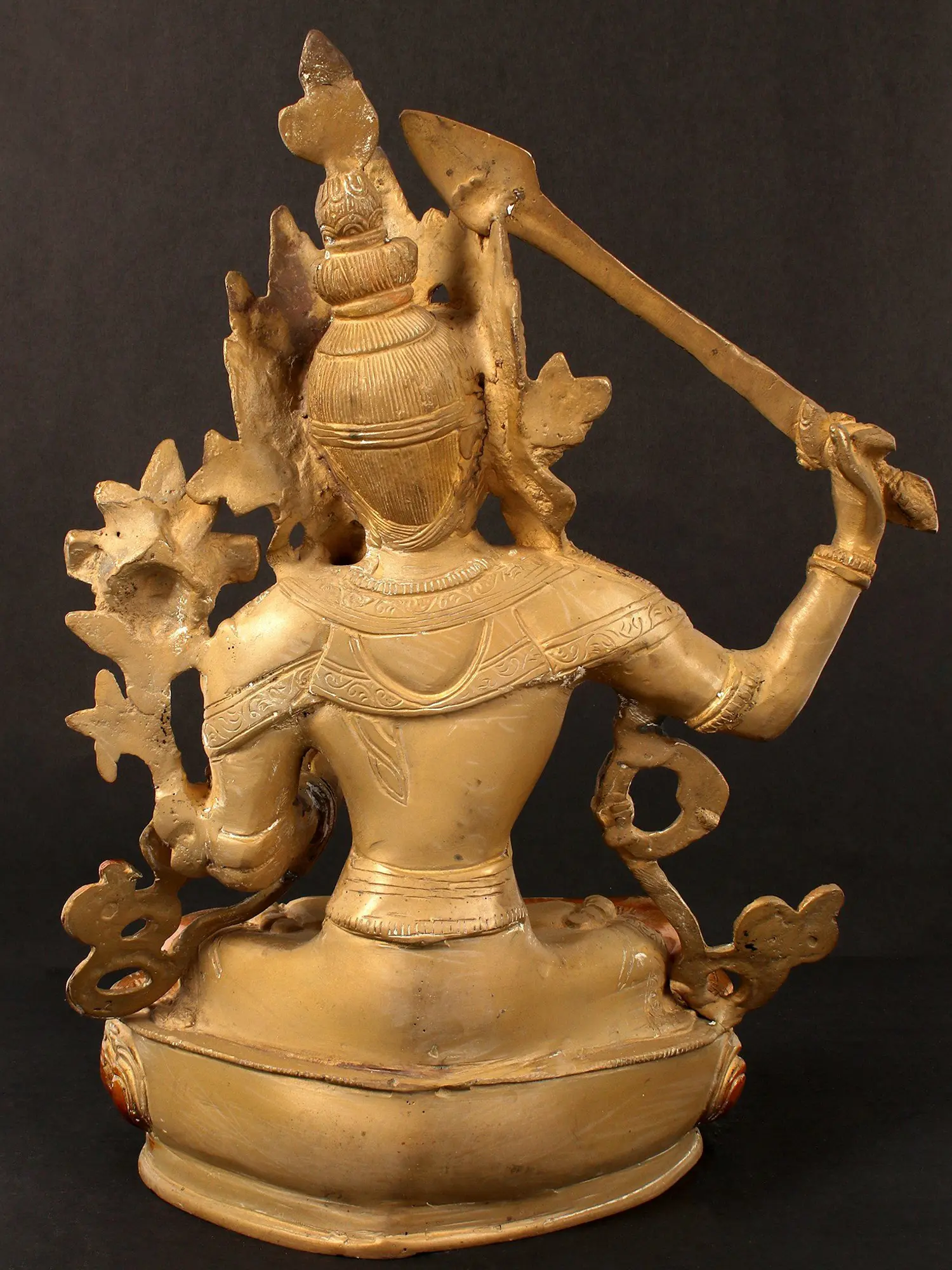 Rooted in a Padmasana, on his Lotus Asana - this golden Manjushri has been carved out into an idol with references from Thangka pictographs of Tibet. Manjushri is one of the revered bodhisattvas in Mahayana Buddhism and is generally associated with Prajnaparamita - “perfection of wisdom”. In his depiction, he holds a sword, representing his need to cut all the views of ignorance and the Sutra of wisdom, out of a padma. This idol is an inspiration of inspired courage, the enlightened Manjushri sprinkles.