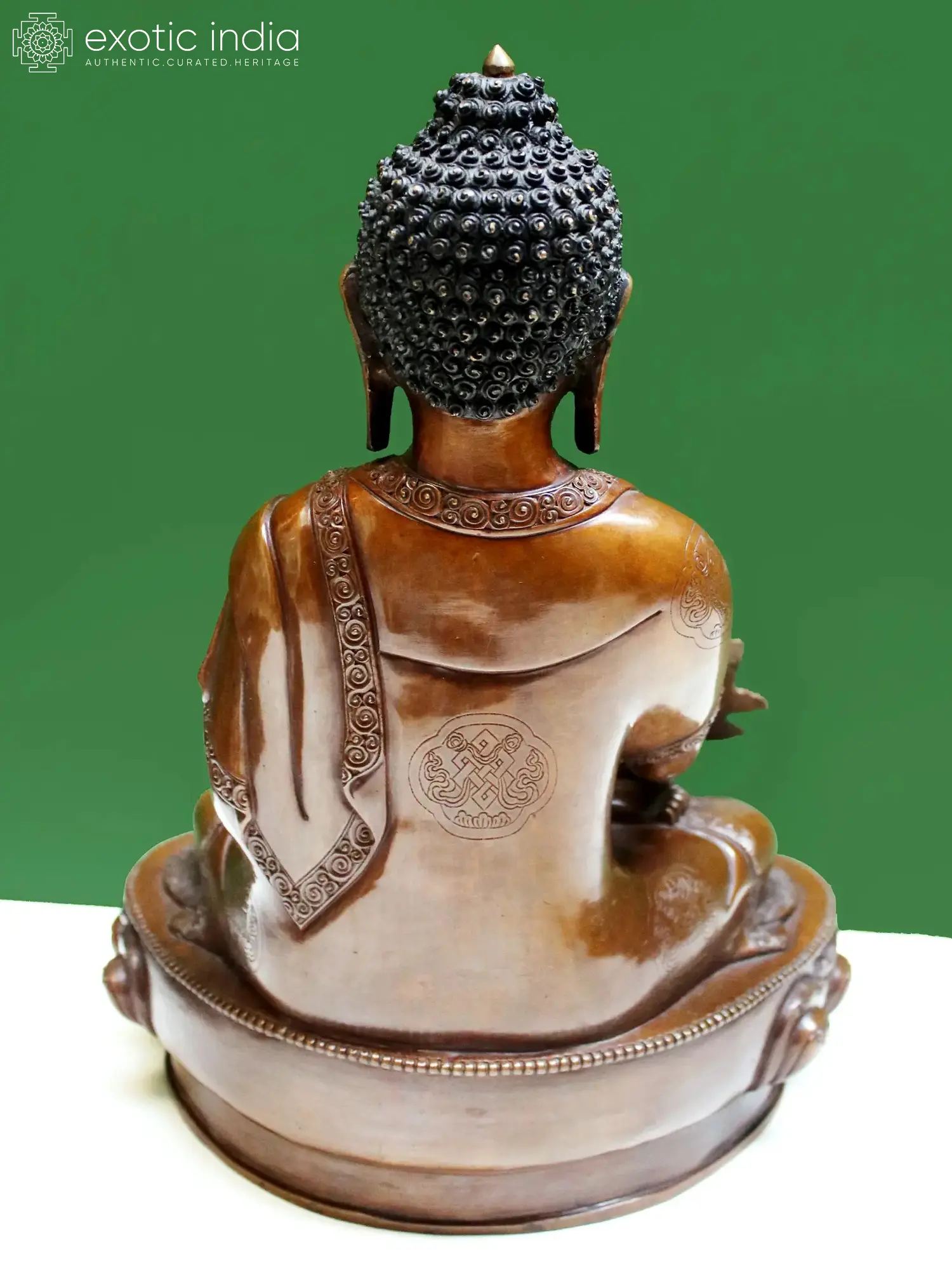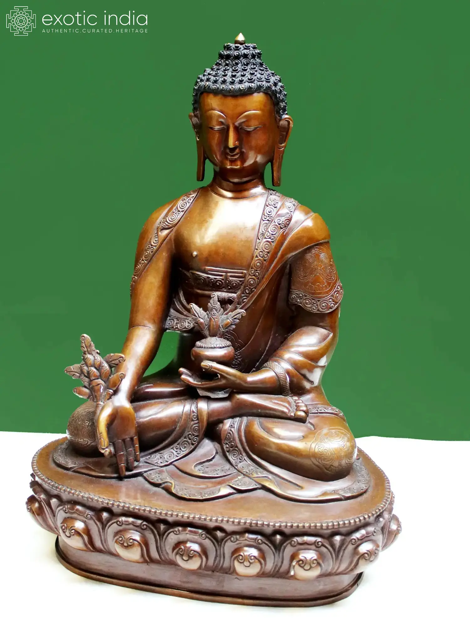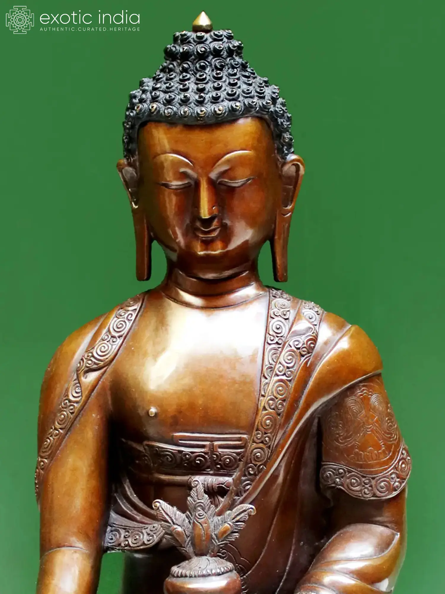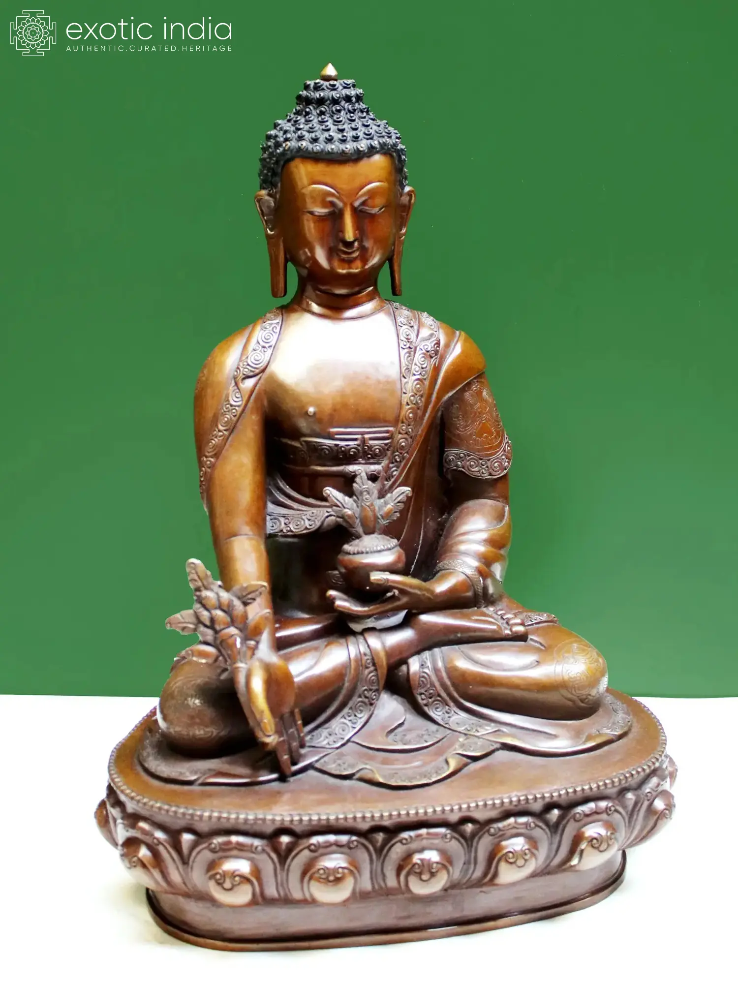 Healing the mind and body and preparing oneself for the long journey to enlightenment is one of the prime concerns of Buddhism. This is one of the reasons behind the popularity of Medicine Buddha or Bhaishajyaguru, the Buddha of Healing, in Vajrayana Buddhism. In this beautiful copper statue from Nepal, Medicine Buddha is depicted in his popular iconography, attired in a monk’s garment which is embellished with the auspicious Ashtamangala or eight fortunate symbols of Buddhism.