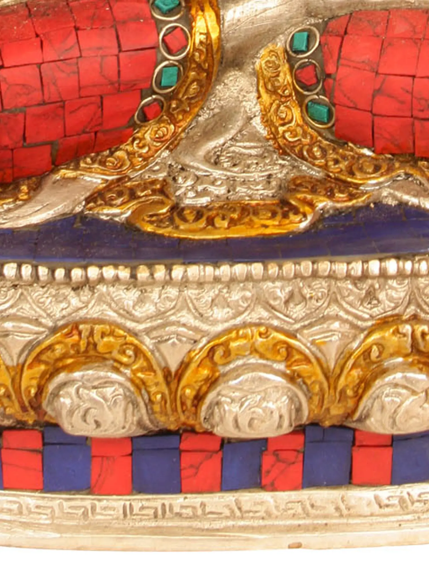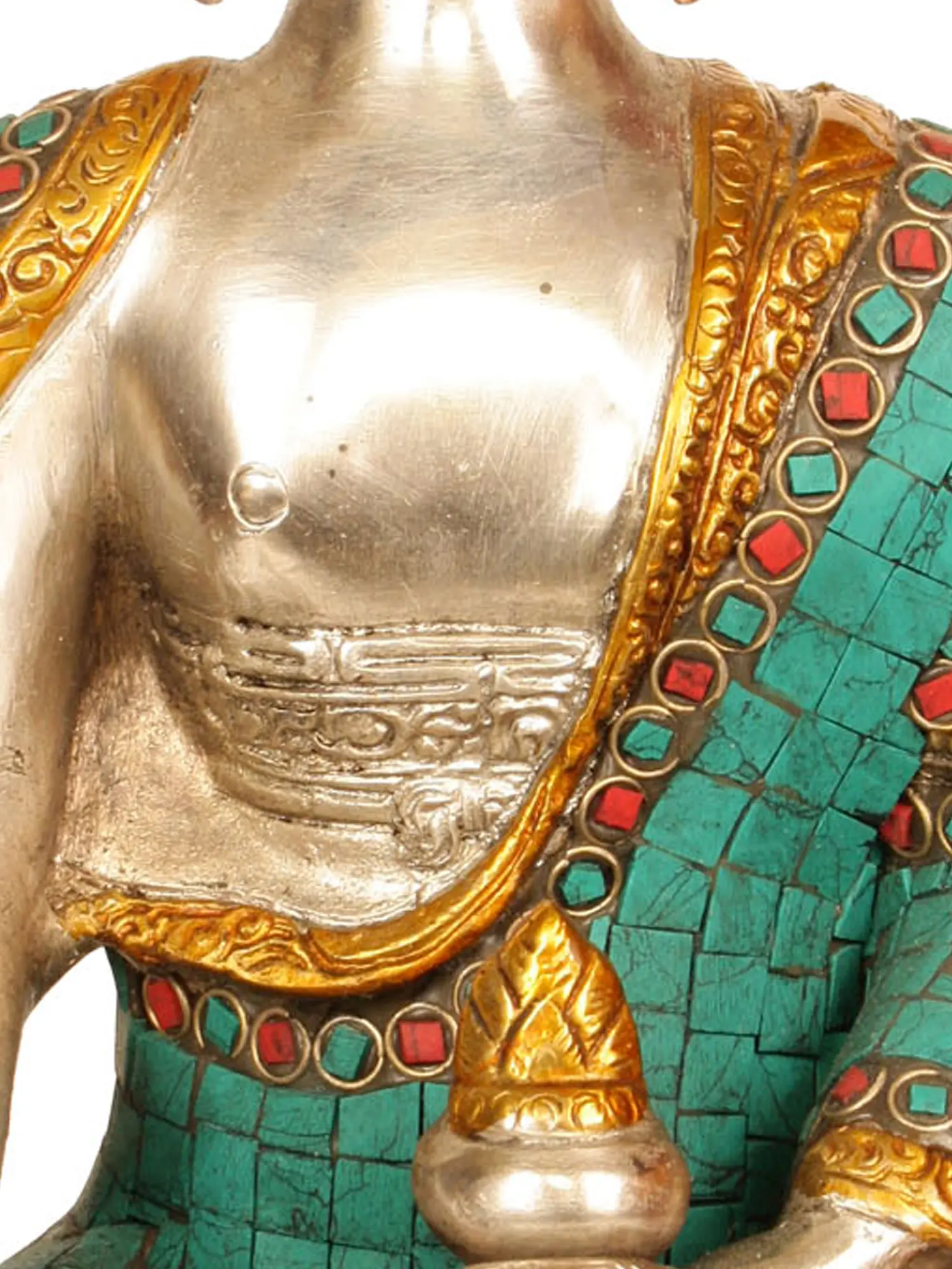 Crafted in India, a land steeped in spiritual traditions, this statue showcases the pinnacle of traditional brass metalwork. The gleaming silver-toned brass forms the base of the figure, lending it a sense of timeless elegance. What truly sets this piece apart is its vibrant inlay work. The robe, draped artfully around the Buddha's form, is adorned with a mosaic of striking turquoise and red stones, bordered by intricate golden patterns. These colors are not merely decorative; turquoise is often associated with healing, protection, and wisdom, while red symbolizes life force and vital energy. The layered pedestal upon which the Medicine Buddha sits is also richly decorated, featuring a tapestry of swirling motifs and inlaid stones, all rendered in a harmonious palette of gold, blue, and the characteristic red and turquoise. The meticulous handcrafting ensures that each detail, from the gentle curl of the hair to the serene expression, is rendered with profound care.