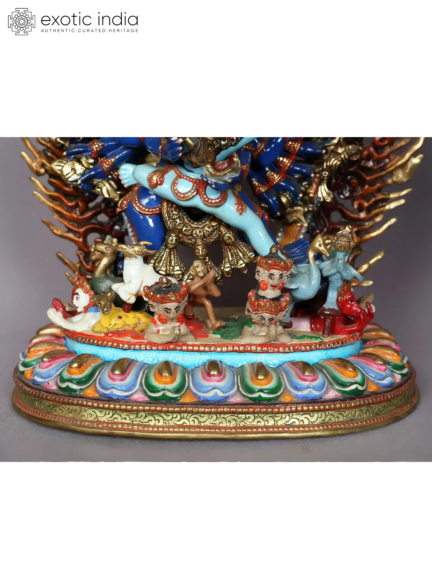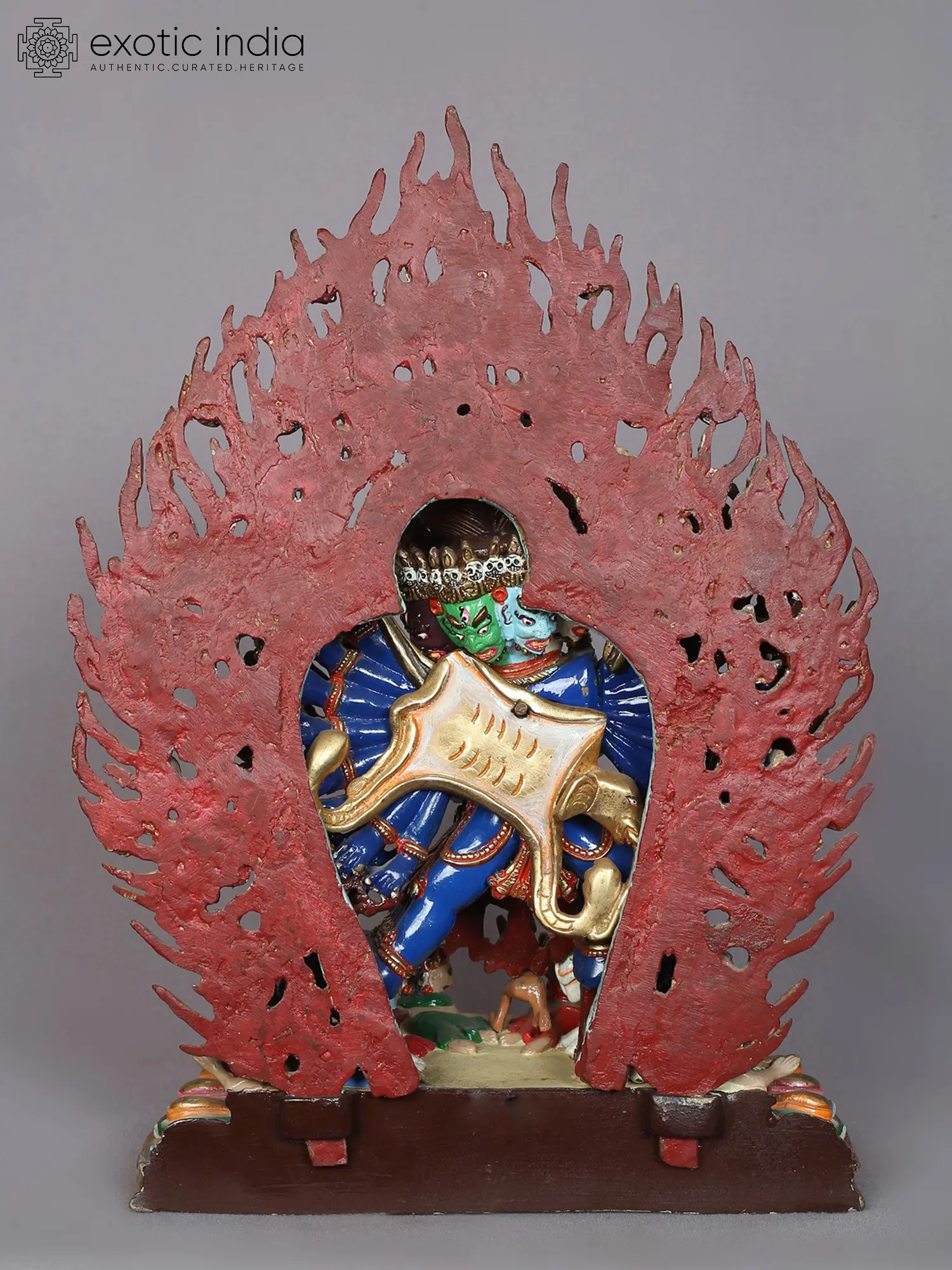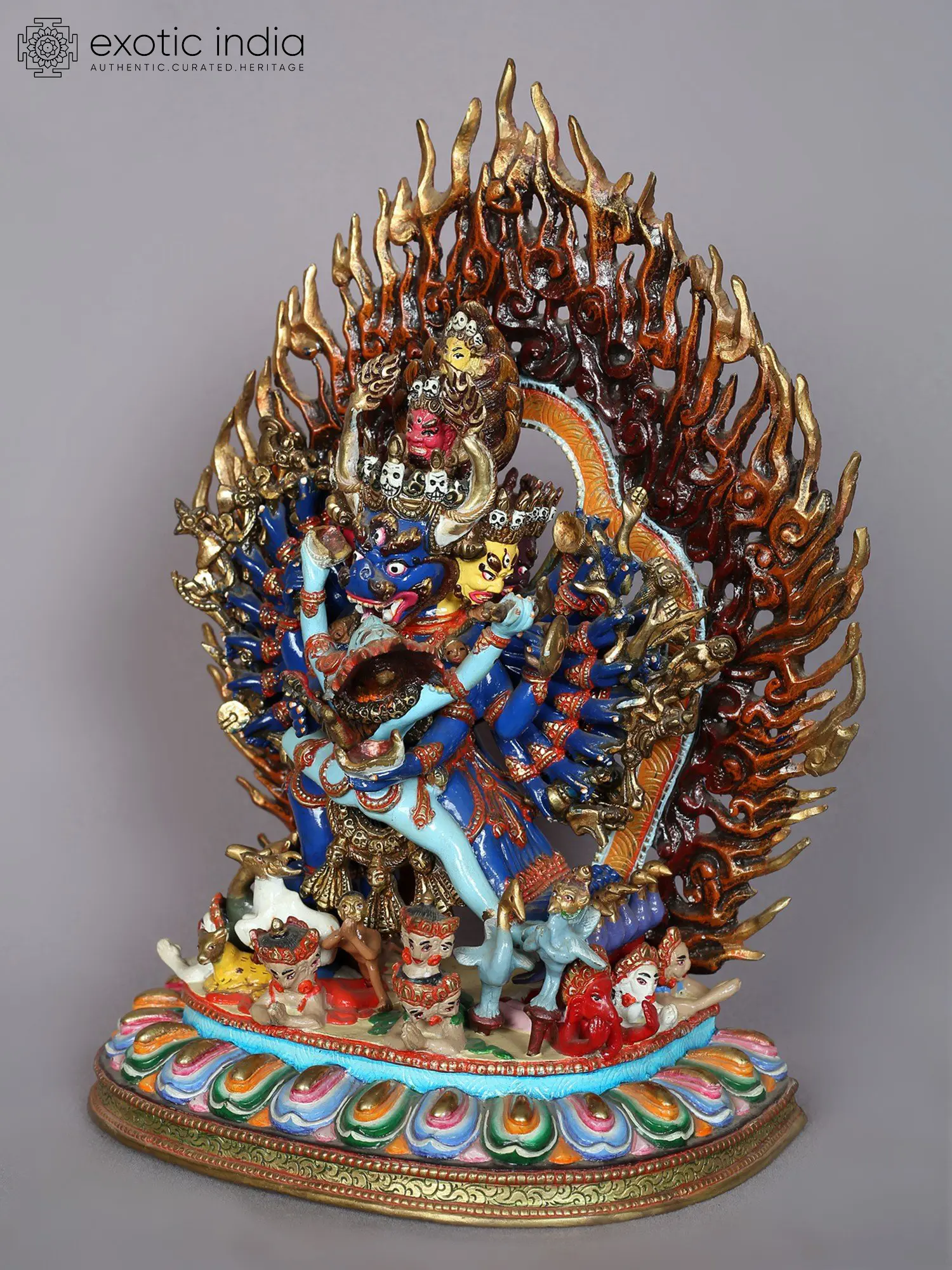 A Megh Sambara is encircled by an awe-inspiring halo of flames, enhancing the intensity of his wrathful visage. Meghsambara is seen in the Yab-Yum, or father-mother, form alongside his female counterpart, Vetali. Adorned with various formidable weapons and subduing negativity beneath his multiple legs, Meghsambara radiates the majestic essence of a potent protector of the Dharma.