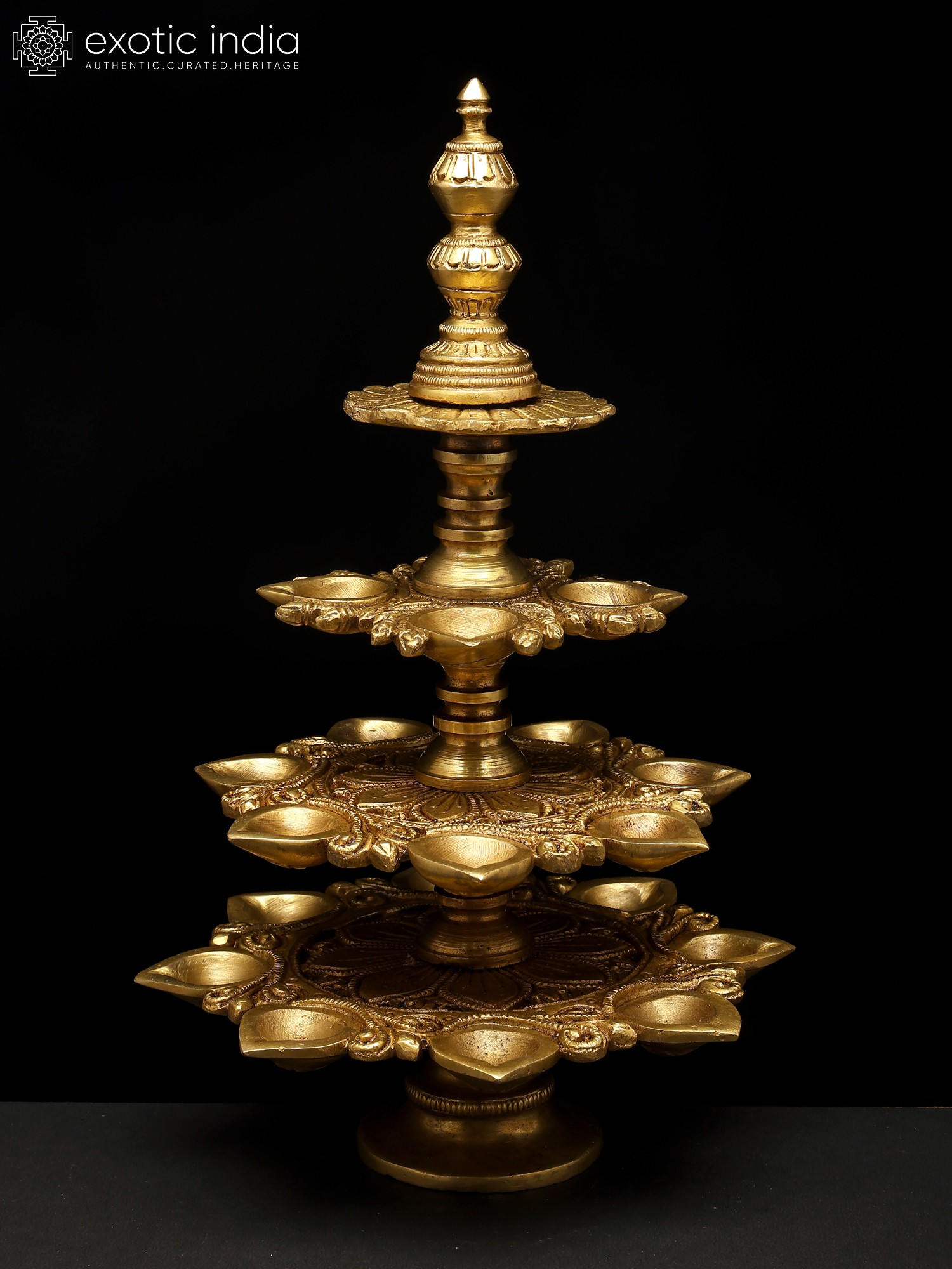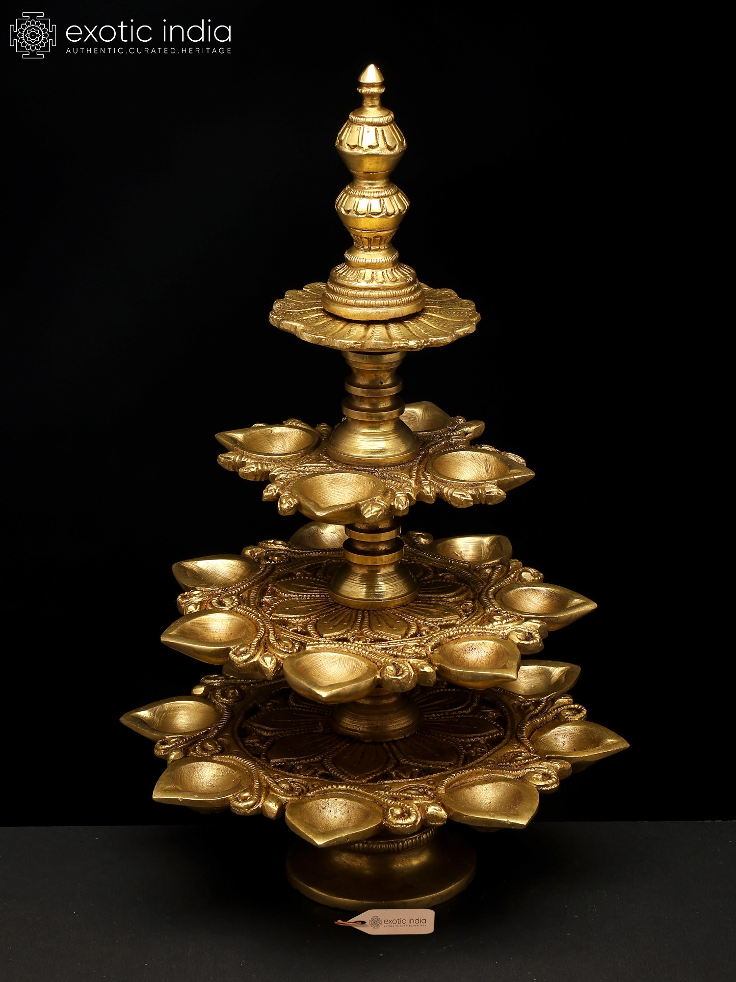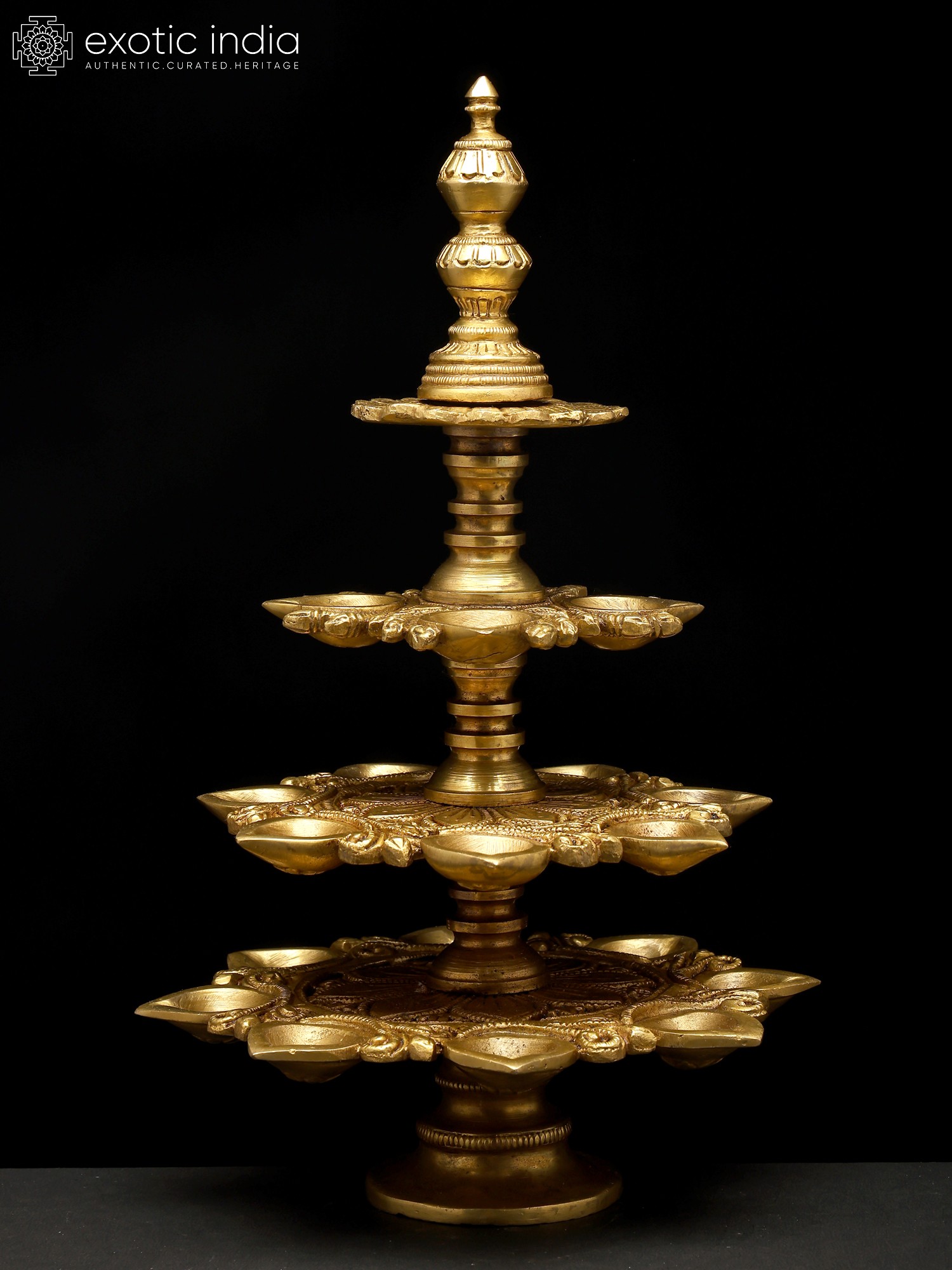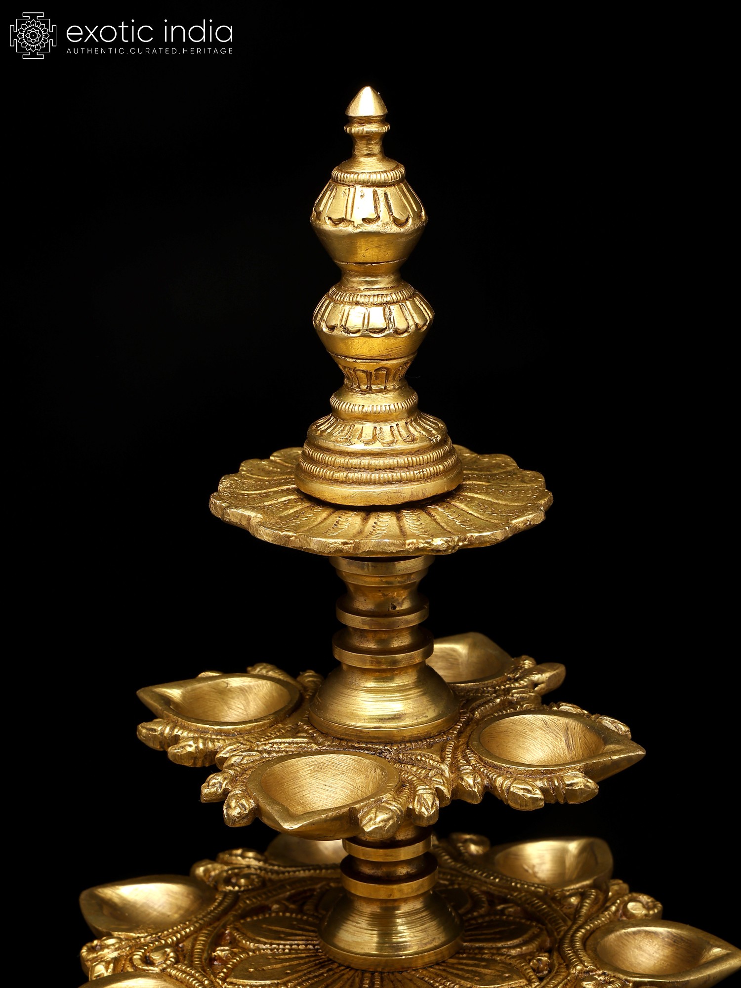 Each lamp is meticulously handcrafted by skilled artisans in India, carrying forward generations of expertise. The intricate carvings and the precise symmetry of the design speak to the dedication and reverence with which these pieces are made. The brass itself is a material deeply embedded in India's cultural and religious tapestry, valued for its durability and its ability to be shaped into forms of extraordinary beauty. This lamp is not merely a decorative object; it is a functional piece of art imbued with spiritual significance, designed to be a cherished heirloom, passed down through families, and to grace homes and temples for years to come. Its substantial presence and detailed craftsmanship make it a captivating centerpiece, worthy of admiration and contemplation.