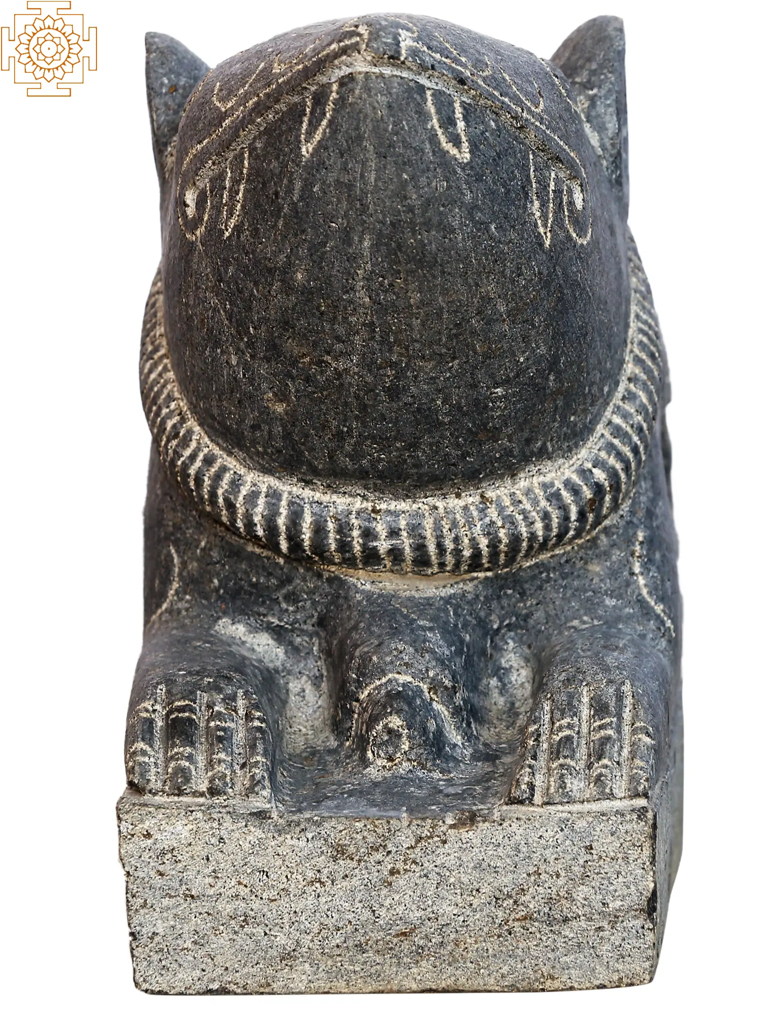 The sculpture depicts the mouse in a poised and attentive posture, indicating it is ready to serve Ganesha.