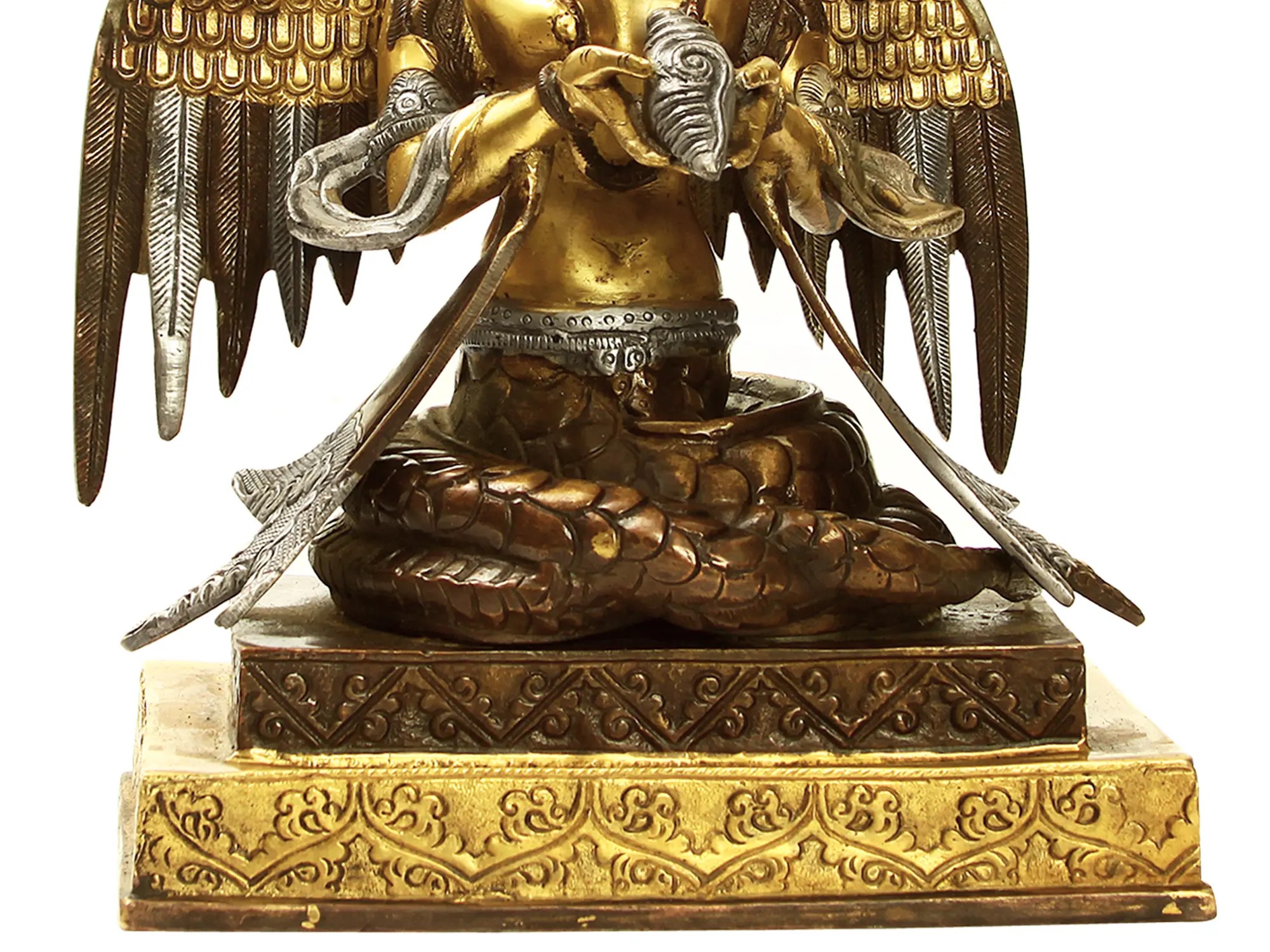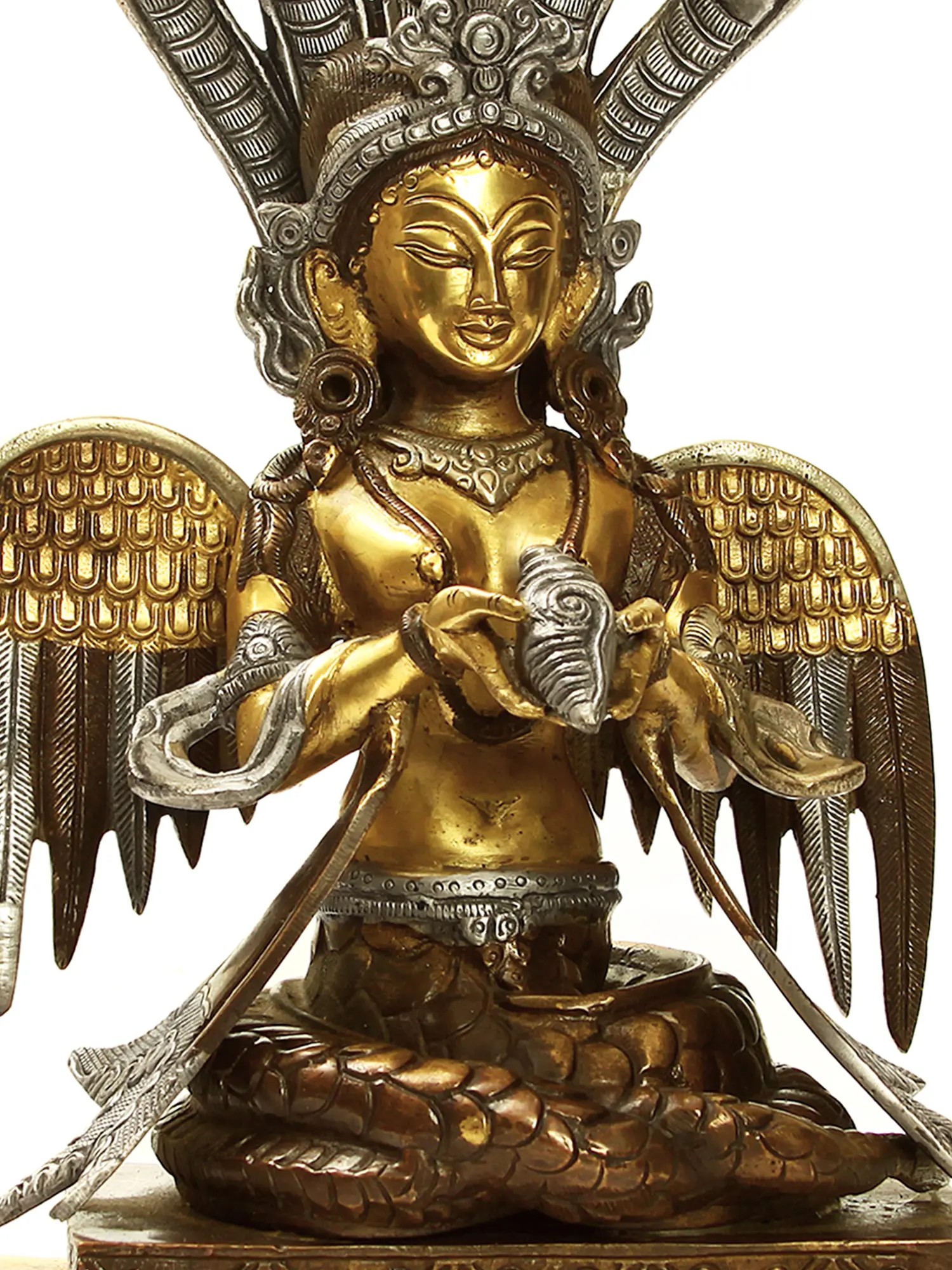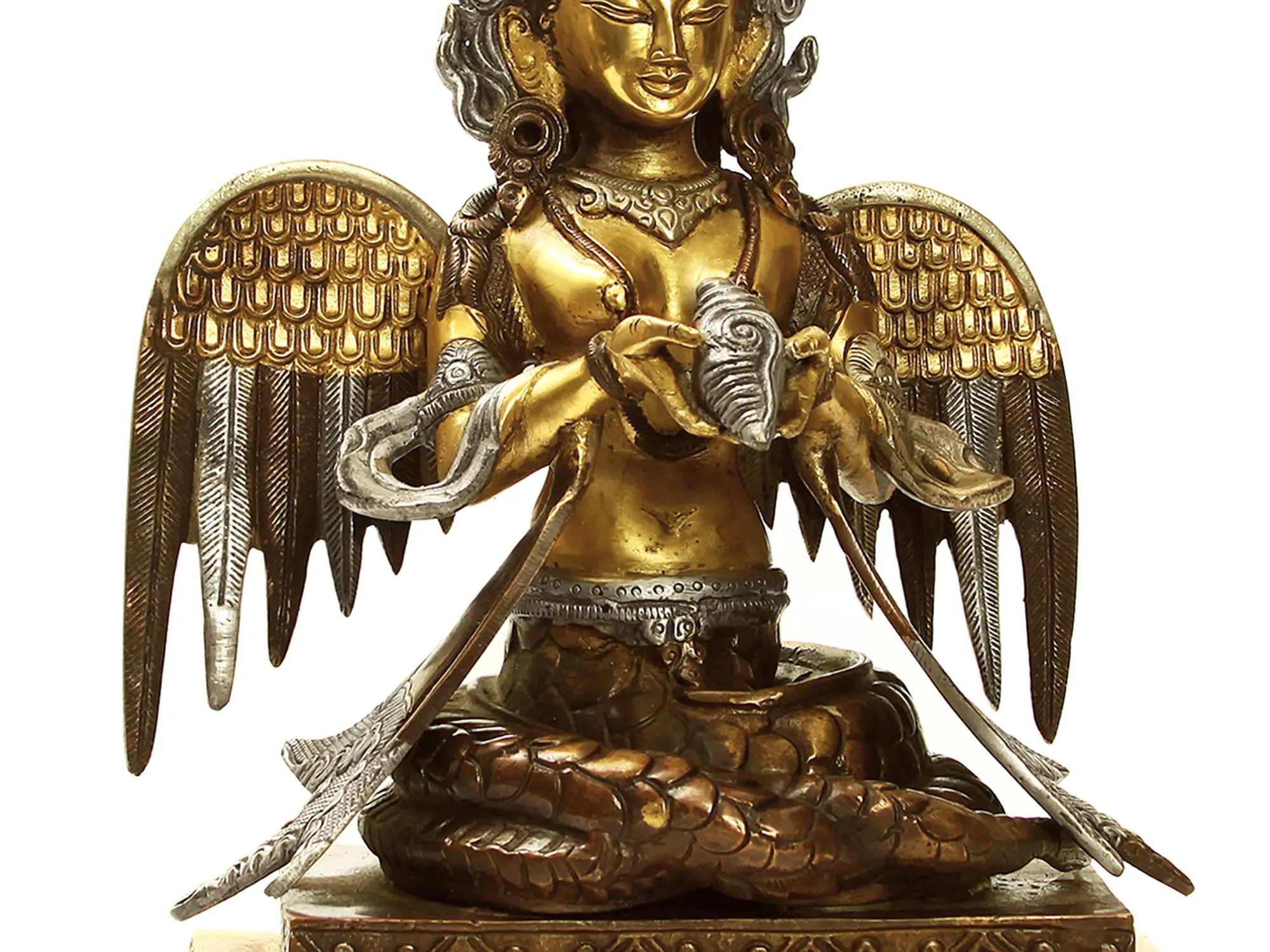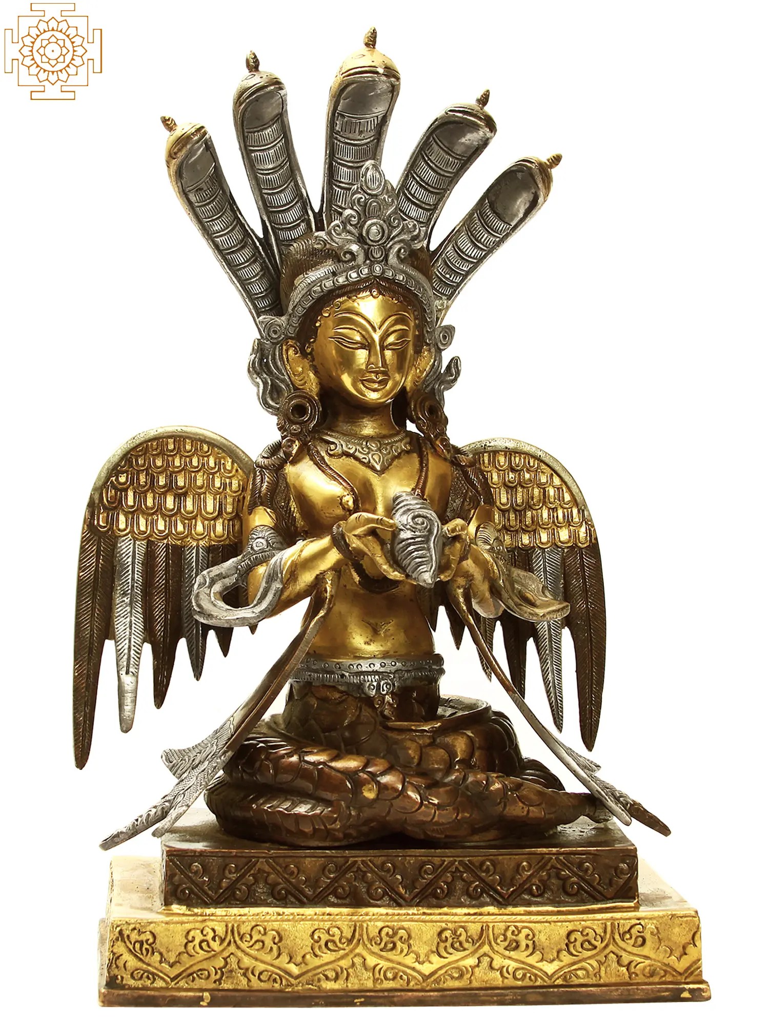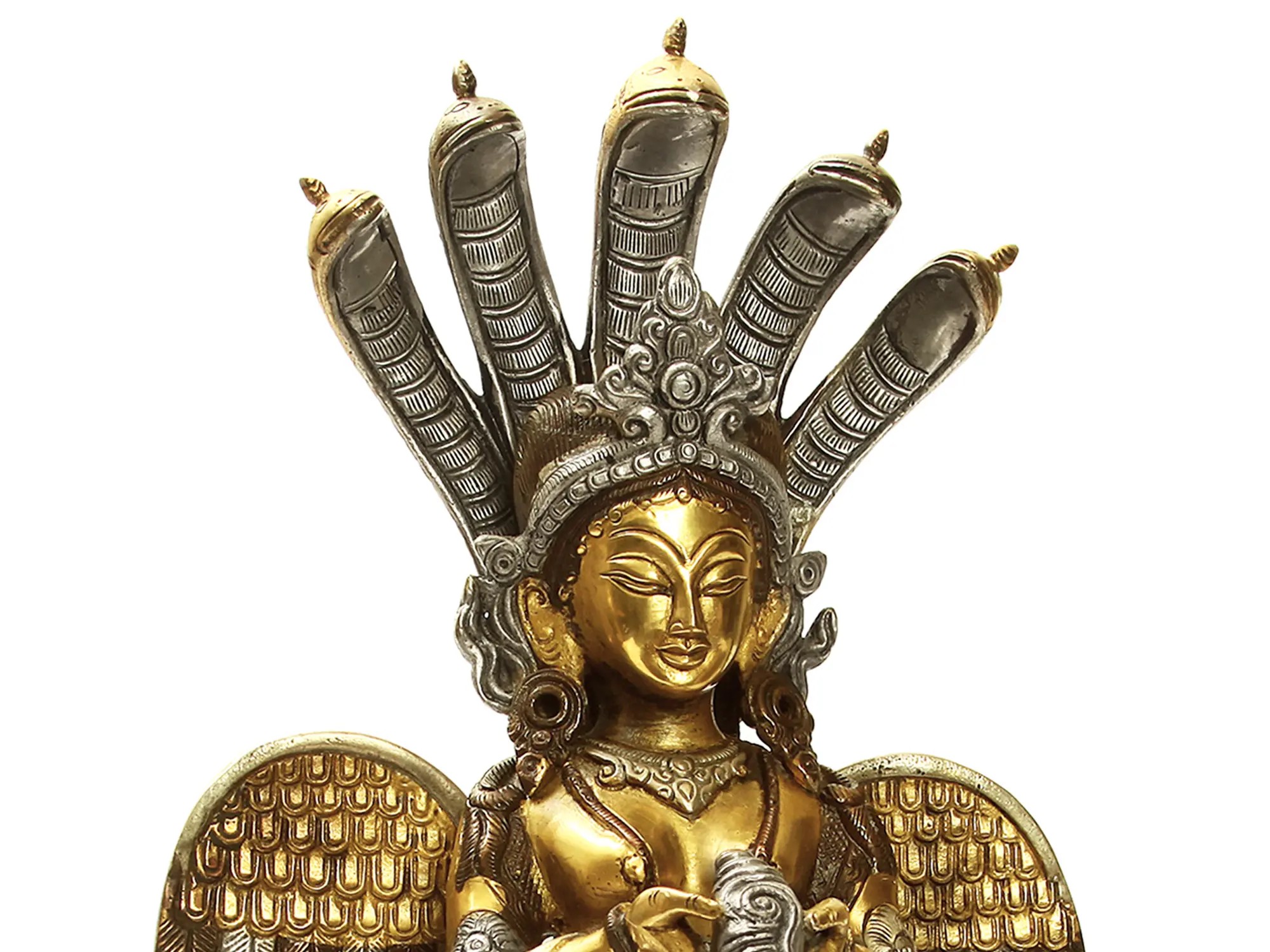 Handmade from high-quality brass, this sculpture possesses a timeless appeal. The warm, golden hue of the metal is enhanced by the artisanal finishing, highlighting the nuanced textures and delicate carvings. From the ornate crown adorning her head to the coiled serpent body that forms her lower half, every element speaks of the artisan's dedication and mastery. The serpent's scales are rendered with remarkable realism, and the flowing drapery of her attire adds a sense of movement and life to the static form. This piece not only showcases the artistic legacy of India but also serves as a conversation starter, inviting contemplation on the philosophical and spiritual concepts it represents. It is an ideal addition to any discerning collector's altar, meditation space, or as a striking accent in a living area, bringing with it an aura of ancient wisdom and mystical allure.