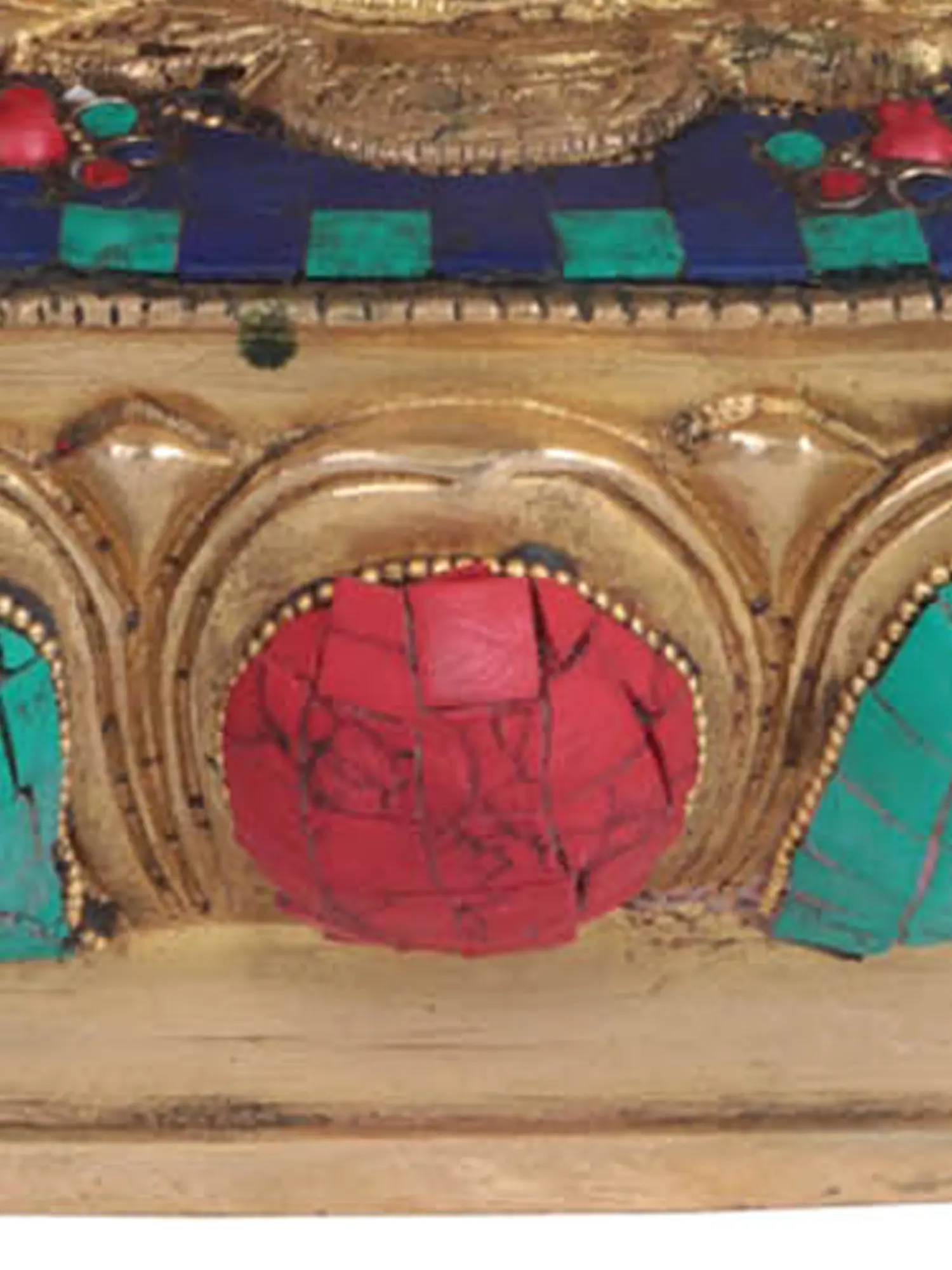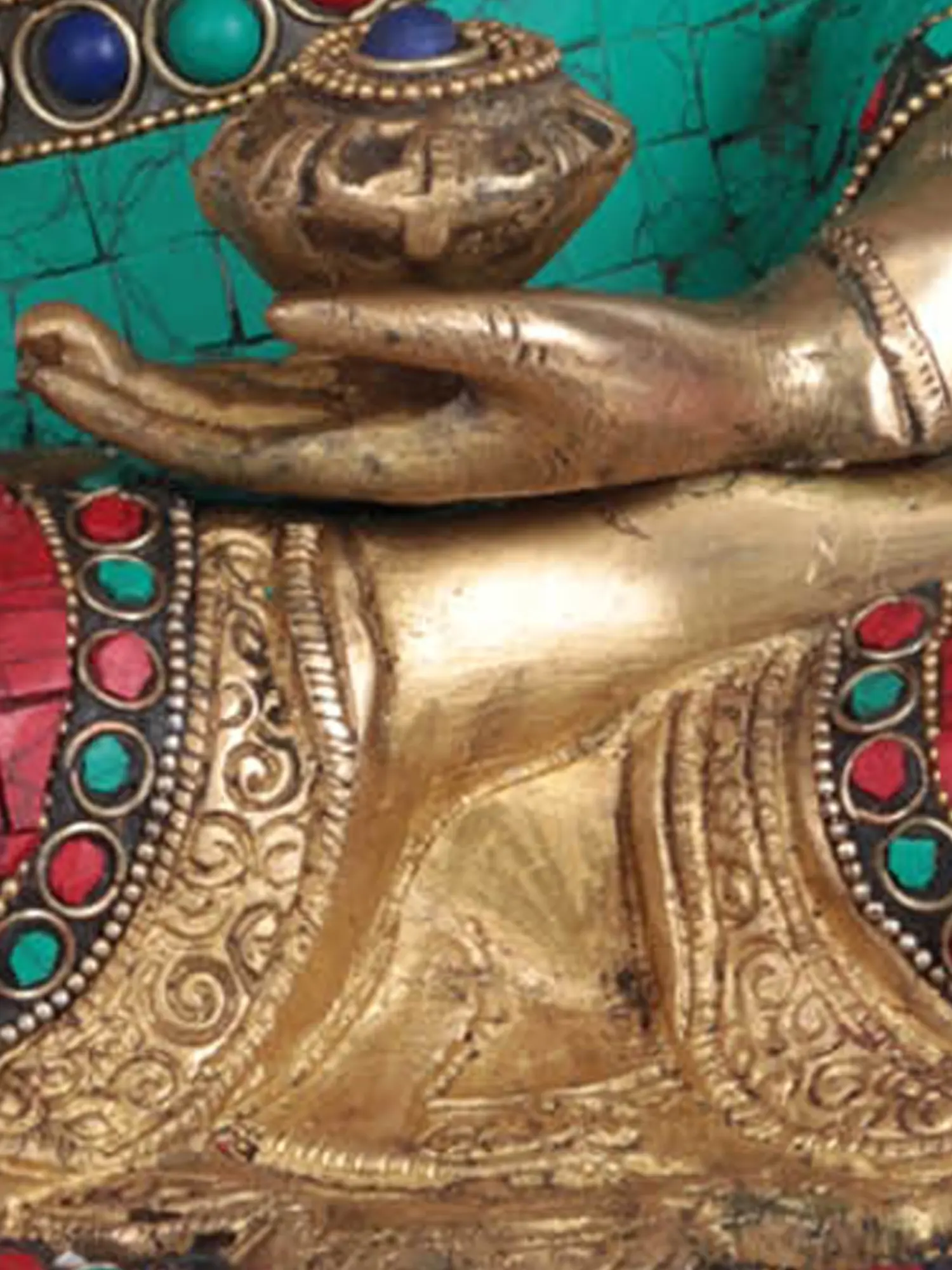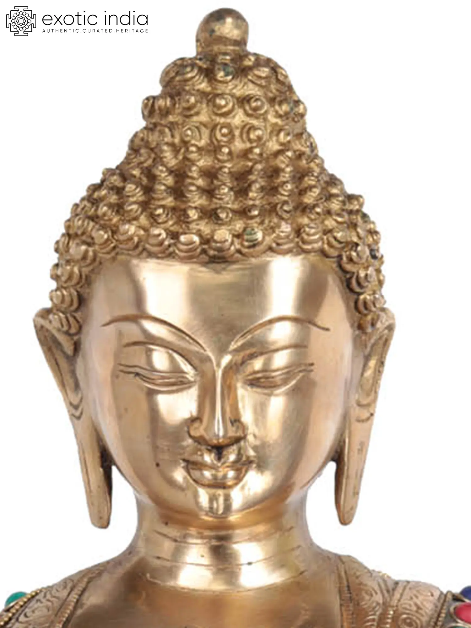 The choice of brass as the medium lends a timeless elegance and durability to this statue. The metalwork is intricate, with fine detailing on the robes and body of the Buddha, showcasing the artisan's dedication to their craft. The statue is further enhanced by the vibrant inlay work that adorns the robes and the lotus base. These semi-precious stones, in striking shades of turquoise and red, are meticulously set, creating a dazzling effect that speaks of opulence and sacred beauty. The lotus blossom, a universal symbol of purity and spiritual awakening, forms the foundation of the sculpture, representing the Buddha's ability to rise above the defilements of the world while remaining untouched. This union of polished brass and colorful stones creates a visually arresting and spiritually uplifting piece.