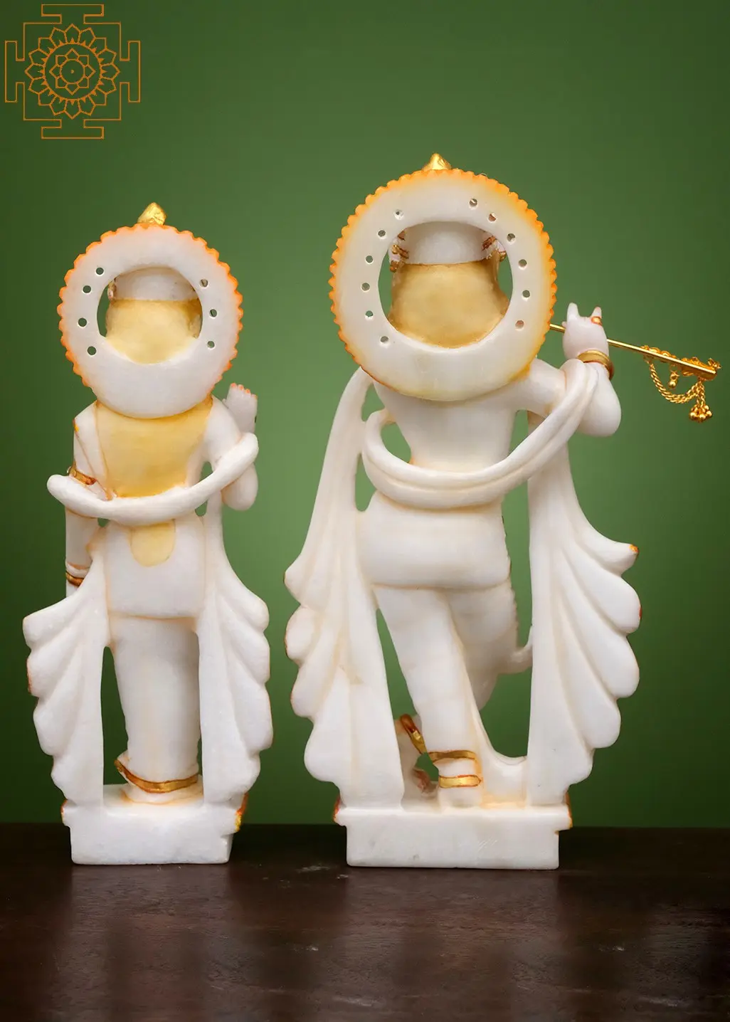 This exquisite statue captures the divine essence of Radha and Krishna, a love story that has captivated hearts for millennia. Carved from pure white marble, the figures exude a serene grace, their forms brought to life with meticulous craftsmanship. The smooth, cool touch of the marble evokes a sense of purity and timelessness, reminiscent of the celestial realms where their love story unfolded. Krishna, the playful and enchanting deity, is depicted with his iconic flute poised to play a melody that can charm the universe. His eyes sparkle with divine mischief, and the gentle curve of his lips suggests a smile that promises joy and solace. Adorned with rich gold accents and delicate ornamentation, his attire flows with an ethereal grace, echoing the divine robes of the gods. A garland of vibrant hues, embedded with sparkling gems, adorns his neck, a symbol of the blossoming love between him and Radha. Beside him stands Radha, the embodiment of pure devotion and unconditional love. Her posture is one of gentle reverence, her hands raised in a gesture of blessing and affection. Her gaze meets Krishna's, a silent testament to their profound spiritual union. Like Krishna, she is adorned with opulent gold work and shimmering gems, reflecting the radiance of their divine connection. The intricate details in their attire and adornments speak of the dedication and skill of the artisan, who has breathed life into this sacred representation. ––––––––––––––––––––