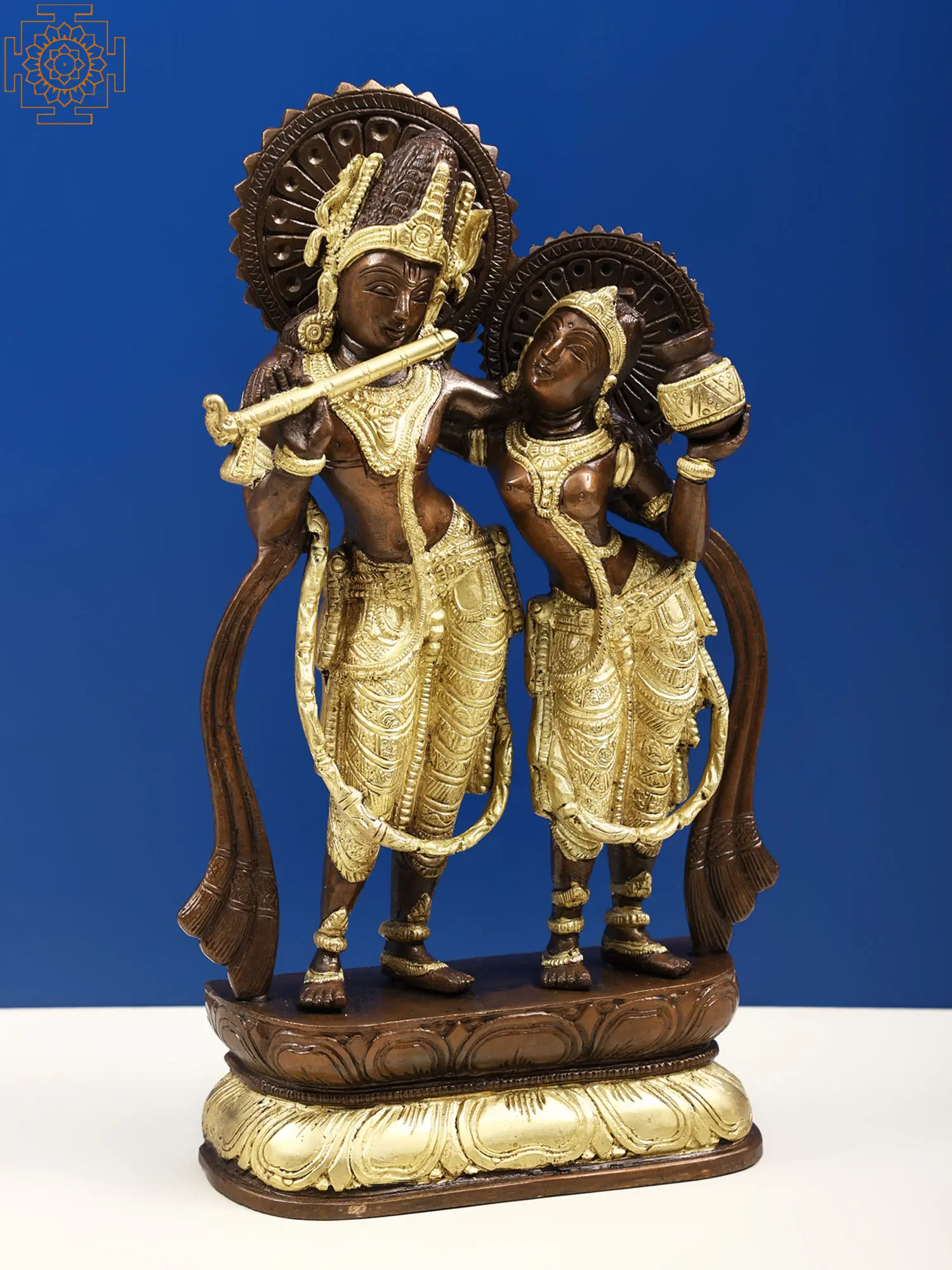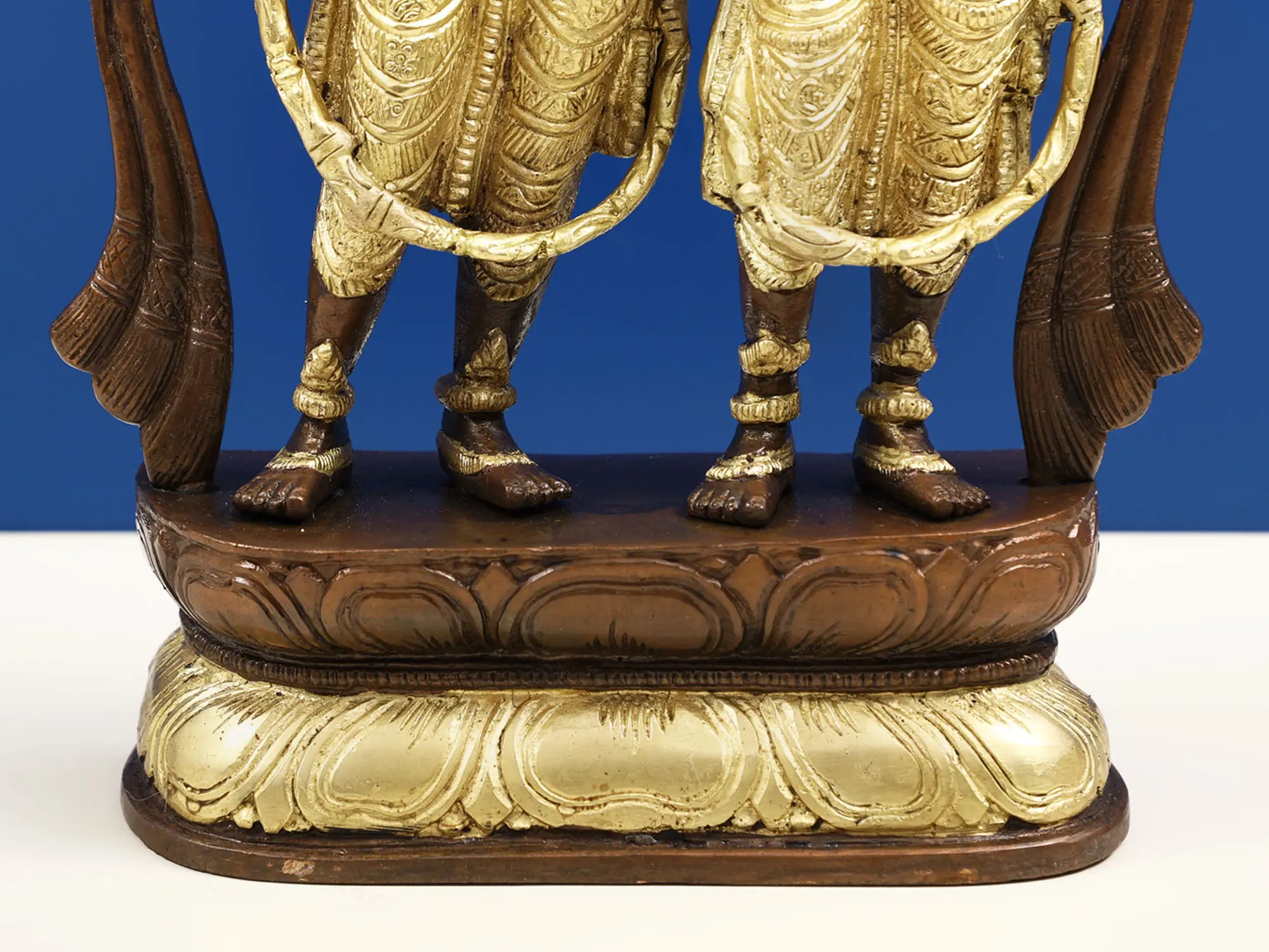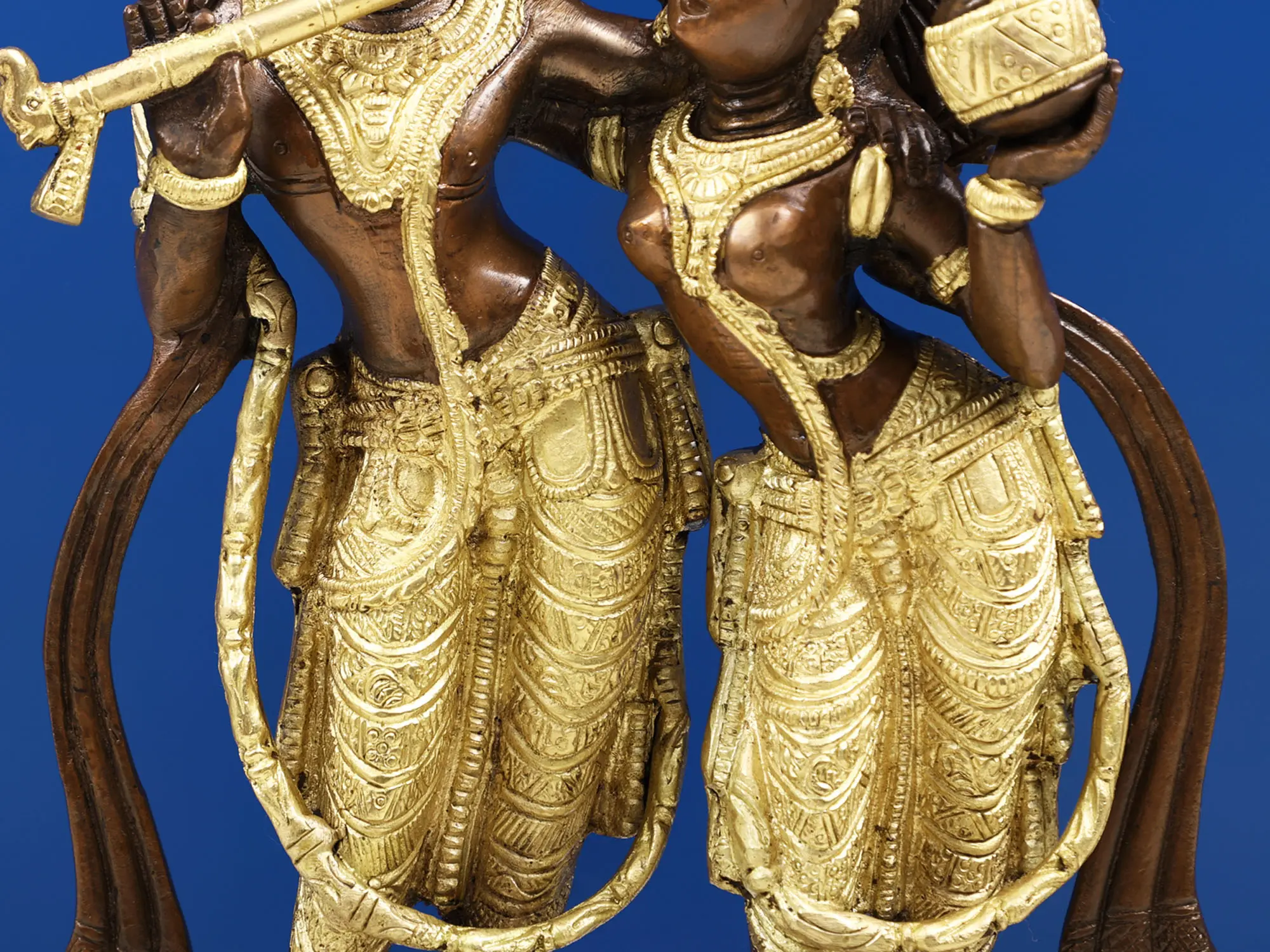 The depiction of Radha and Krishna, both adorned with twin hues, intricately crafted in brass, signifies the divine union and the harmonious blend of energies. Handmade in India, this sculpture encapsulates the unique essence of their divine love and cosmic unity. Each hue symbolises the distinct yet unified aspects of their personalities, inviting contemplation on the complexities and beauty of relationships. The intricate details within this portrayal foster an ambiance of unity and complementarity, encouraging viewers to reflect on the exquisite harmony of divine love.