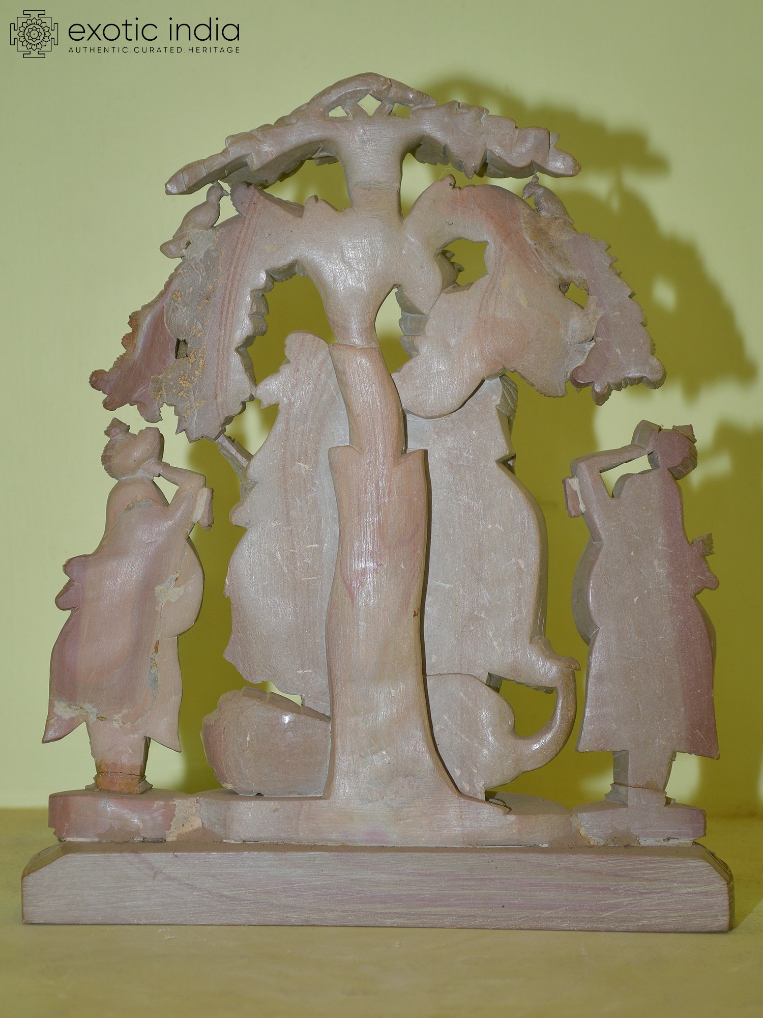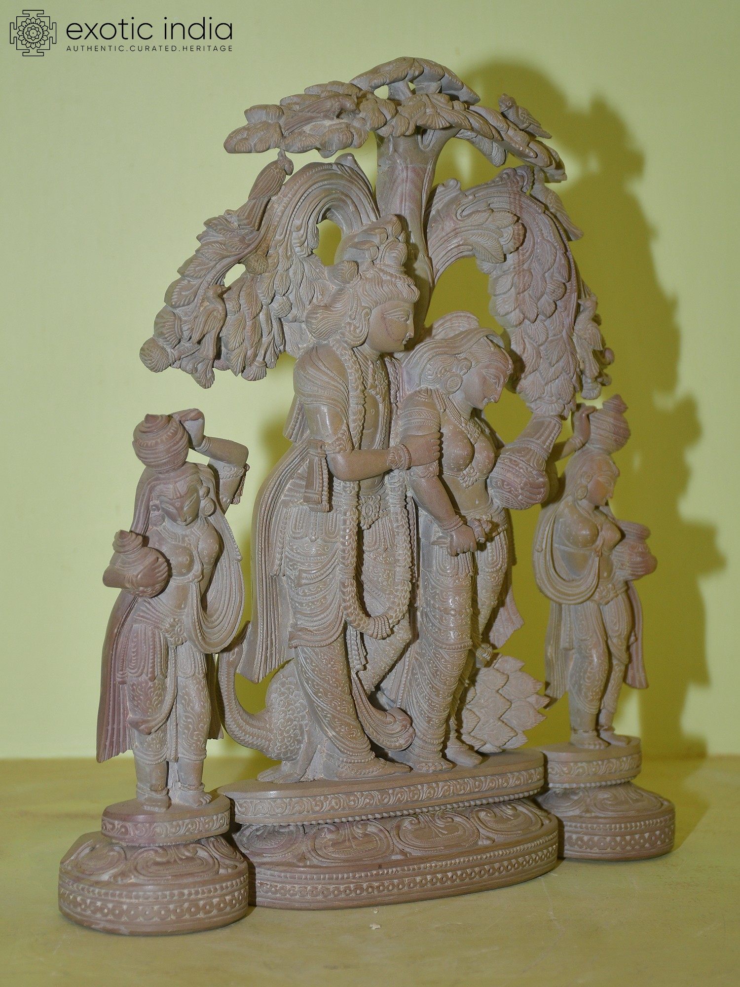 This exquisite stone sculpture captures the divine essence of Radha and Krishna, surrounded by their devoted Gopis, under the benevolent shade of a lush tree. Crafted from the fine red stone of Odisha, a region steeped in artistic heritage, this piece is a testament to the skill of its artisans. The intricate carving showcases the delicate drape of fabrics, the gentle curves of the figures, and the serene expressions that convey deep devotion and celestial charm. The central figures of Radha and Krishna are depicted in a tender embrace, radiating an aura of eternal love. Krishna, the divine cowherd, is adorned with his characteristic flute, a symbol of his enchanting melodies that captivated the hearts of the Gopis. Radha, his beloved, stands beside him, her gaze filled with adoration. The artist has masterfully conveyed the spiritual union that lies at the heart of their story.