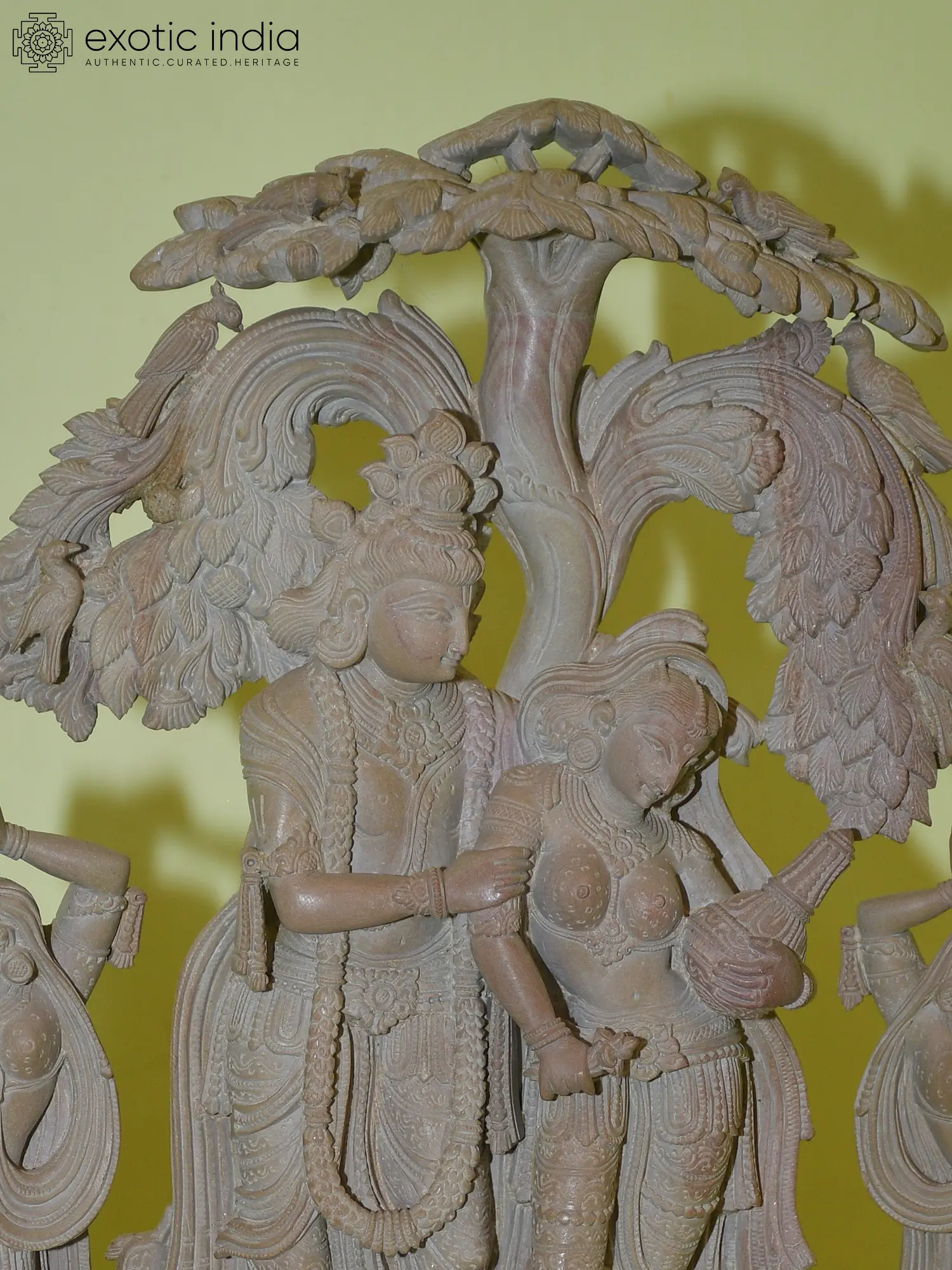 The presence of the Gopis surrounding the divine couple is central to the lore of Radha and Krishna. These devoted milkmaids from Vrindavan were so overwhelmed by Krishna's charm that they dedicated their lives to his love. In Hindu mythology, their love for Krishna is seen as an allegory for the soul's yearning for the divine. The Gopis in this sculpture are depicted in graceful poses, some carrying pots, perhaps symbolizing their everyday lives in Vrindavan, interrupted by the divine presence of Krishna. Their depiction, adorned with bangles and flowing garments, adds to the richness and narrative depth of the artwork. The tree above them, with its birds, signifies the vibrant life of Vrindavan, a sacred grove where Krishna's divine leelas (plays) unfolded.