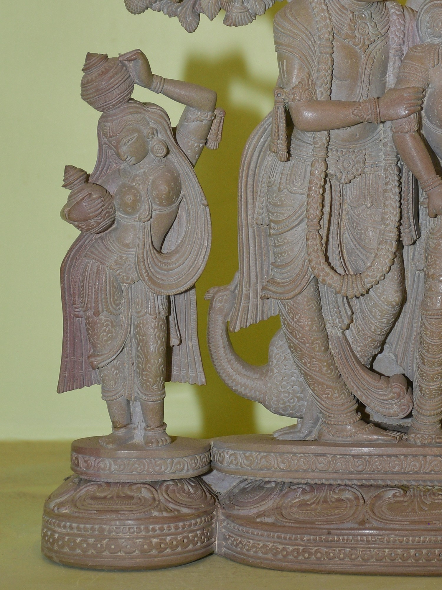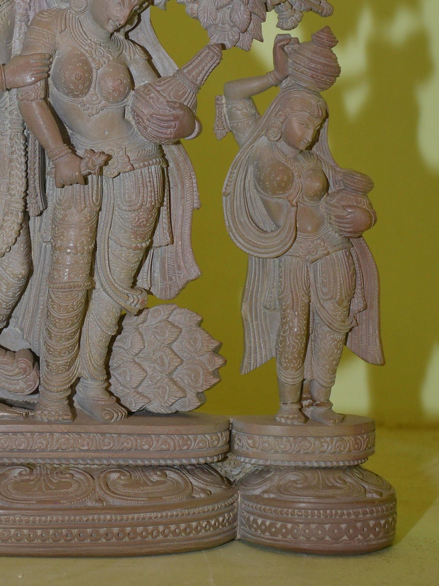 The choice of Odisha stone for this sculpture is significant. Odisha has a long and illustrious tradition of stone carving, with artisans passing down their skills through generations. The red stone, known for its malleability and ability to hold intricate details, is perfectly suited for such a delicate and expressive piece. The surface texture and the subtle variations in the stone contribute to the earthy yet ethereal quality of the sculpture. The bases of the figures, with their patterned designs, speak of the meticulous attention to detail that characterizes traditional Indian art. This statue is not merely an object of beauty but a vessel carrying centuries of cultural and spiritual significance, carved with devotion and artistry from the heart of India.