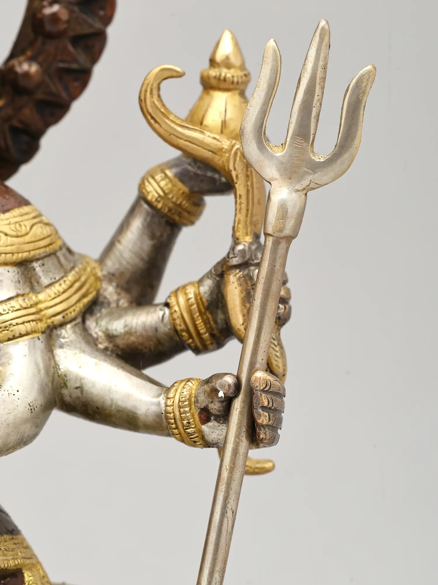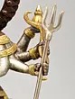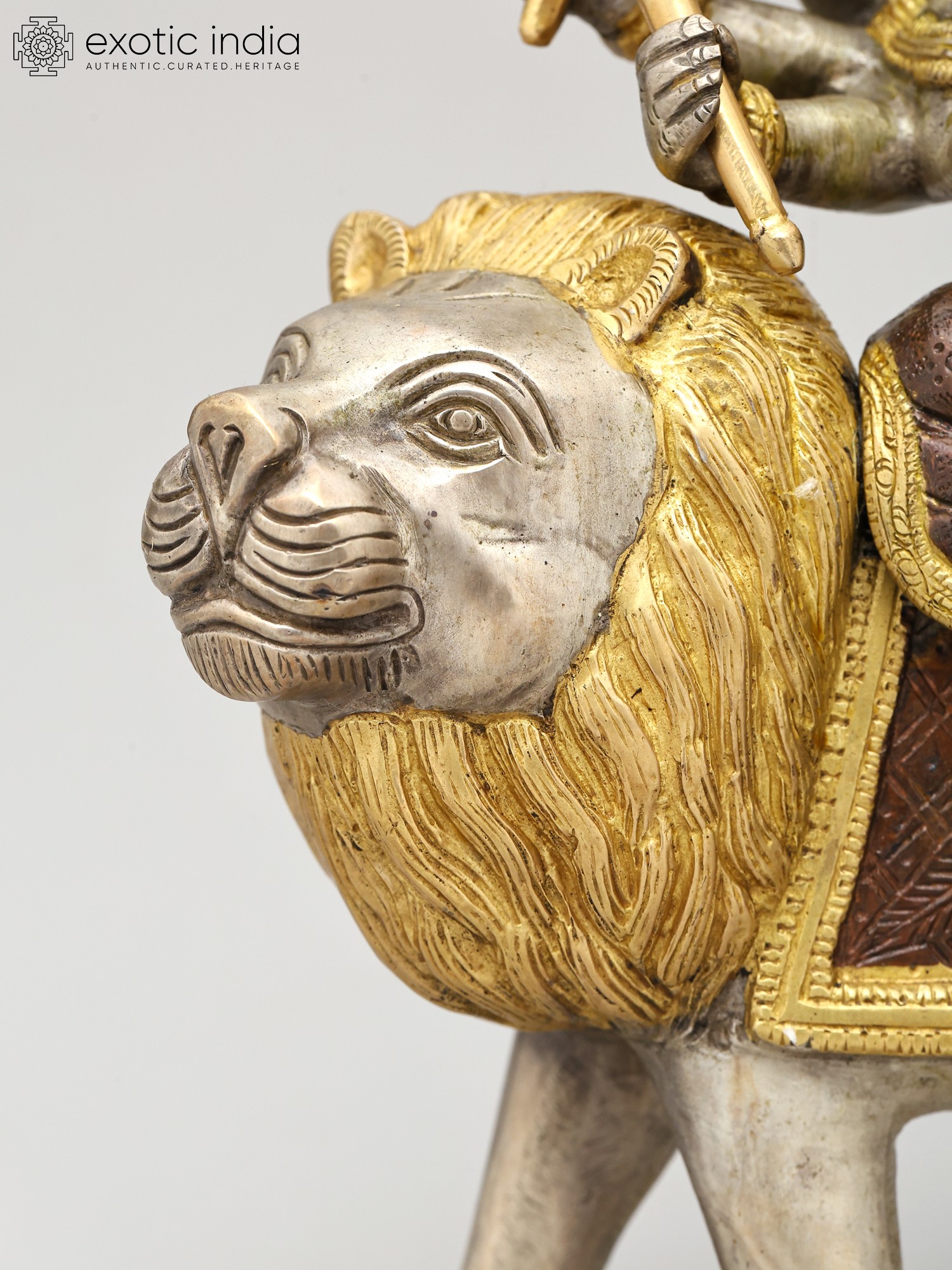 Crafted from high-quality brass, this statue boasts a rich patina, achieved through skilled metalworking techniques. The contrast between the polished golden accents and the subtly textured darker hues of the brass creates a striking visual appeal. This interplay of metallic finishes accentuates the divine aura of the goddess and the majesty of her lion. The careful attention paid to every detail, from the folds of her attire to the sharp edges of her weapons, makes this sculpture a testament to the enduring legacy of Indian metal craftsmanship. It is an ideal piece for your home altar, meditation space, or as a statement decorative item, bringing a sense of peace, strength, and spiritual presence into your life.