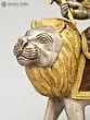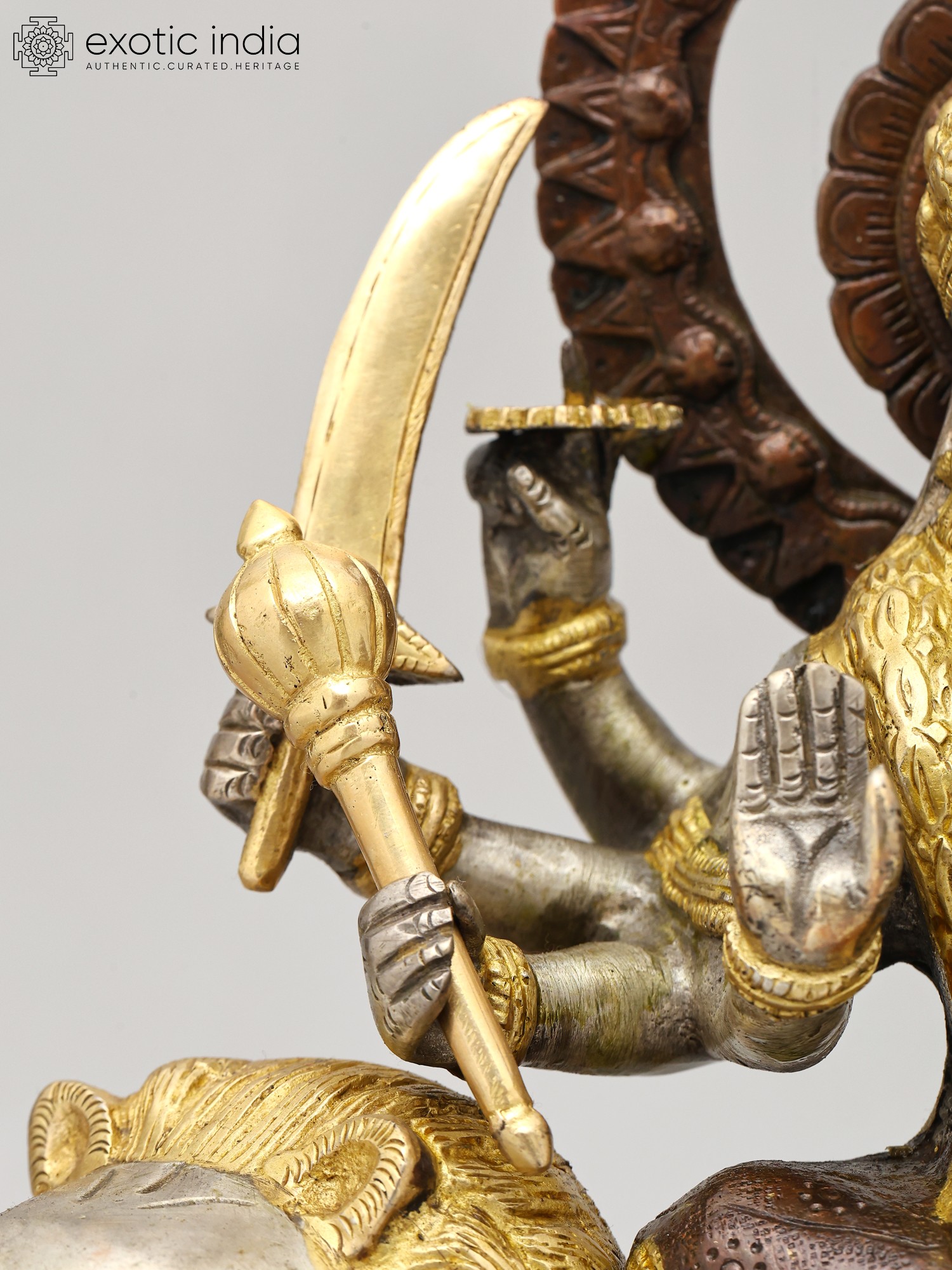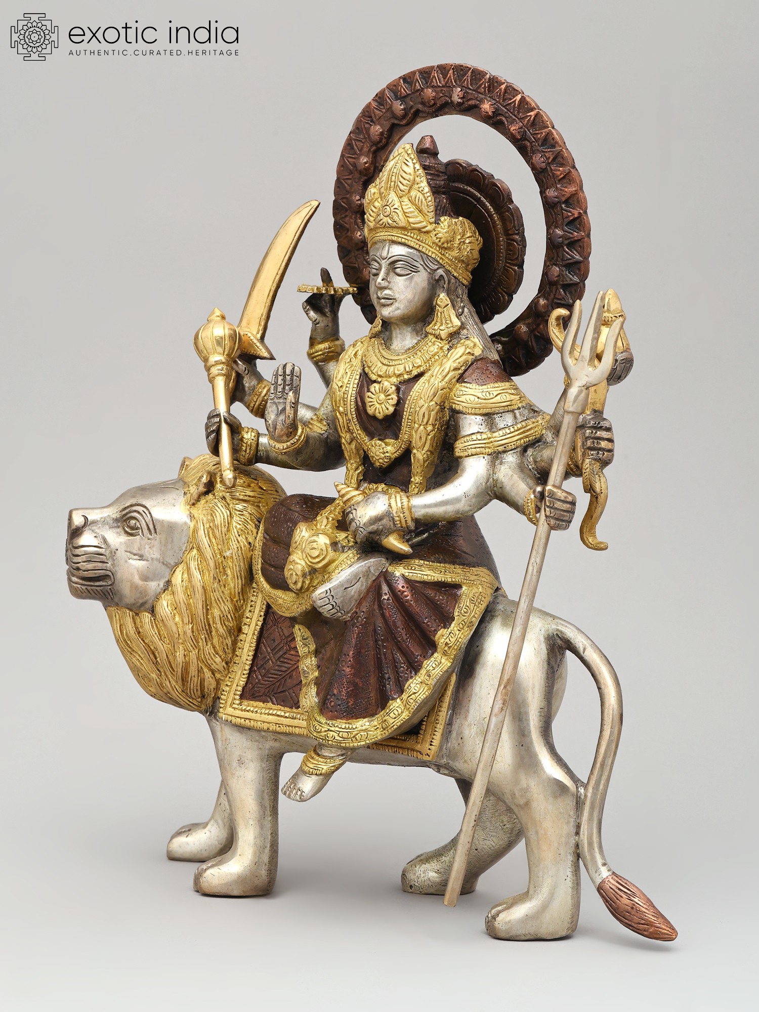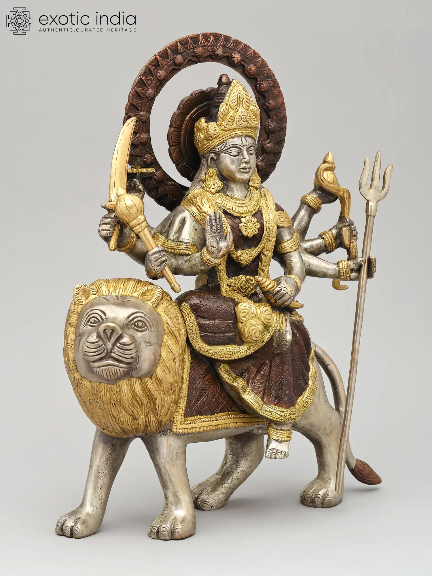 14" Goddess Durga Idol Seated on Lion with Aureole and Kirtimukha atop Inlay Work in Brass | Handmade