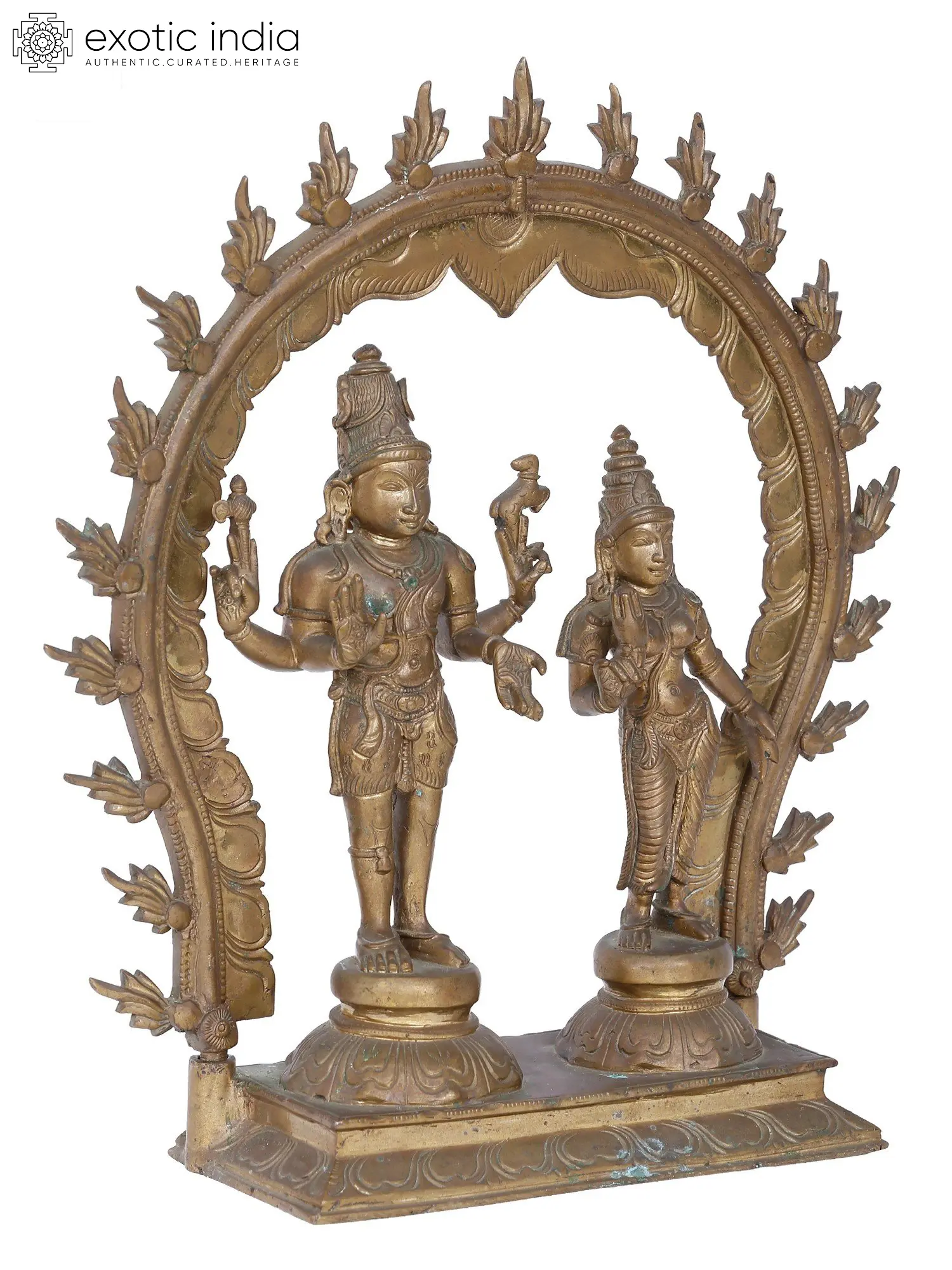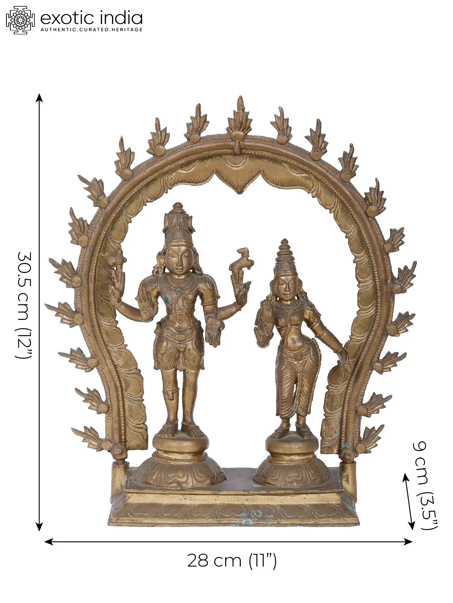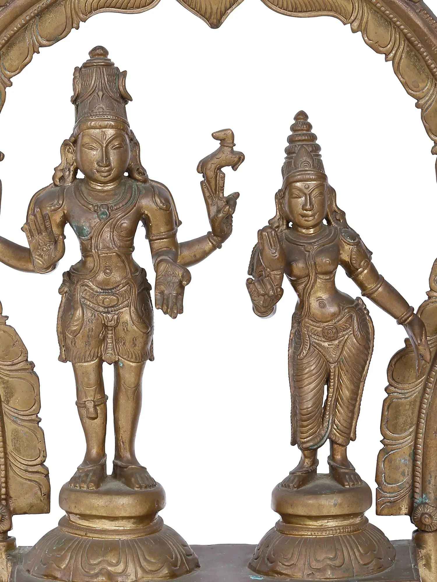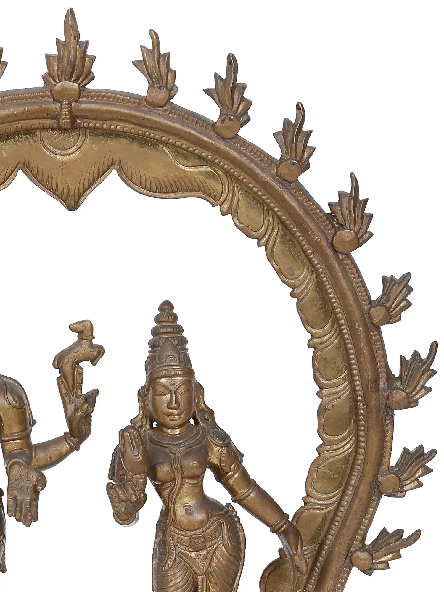 Maheshwara-Maheshwari, Shiva-Shakti, Uma-Maheshwara, the divine Purusha and Prakriti (supreme male and female element) manifest in the Universe in the most beautiful forms of Shiva and Parvati. As the essence of Creation and inspiration of Lord Brahma, Shiva, and Parvati are revered and evoked as the most powerful, auspicious, and eternal beings. In this bronze statue from Swamimalai, Shiva, and Parvati appear in a majestic aureole, with the fire of annihilation and floral elements symbolizing the emergence of life surrounding them, highlighting their reign over the forces of life and death.