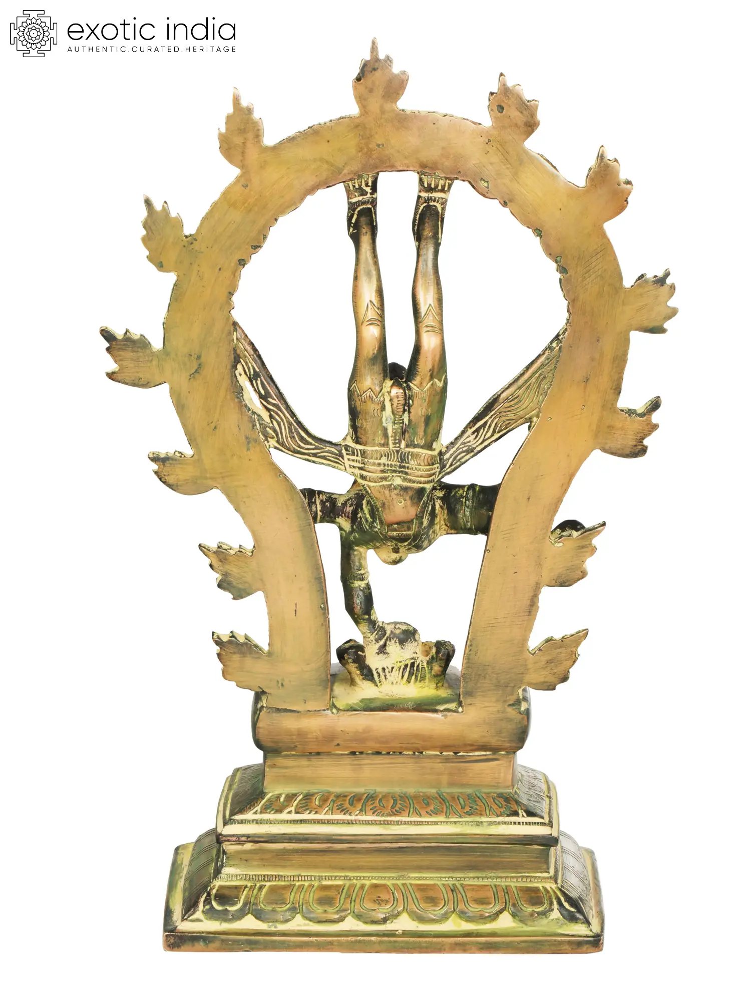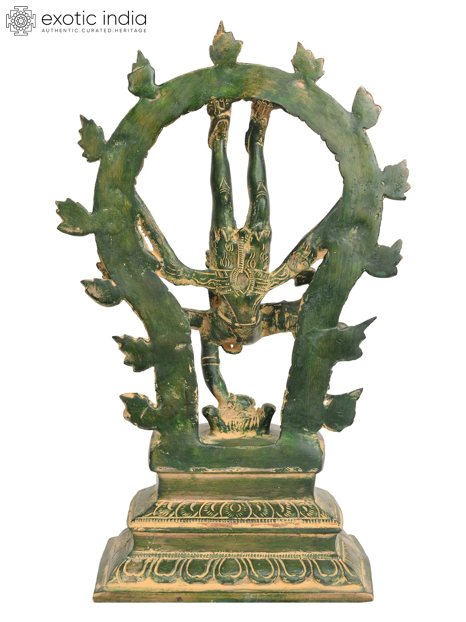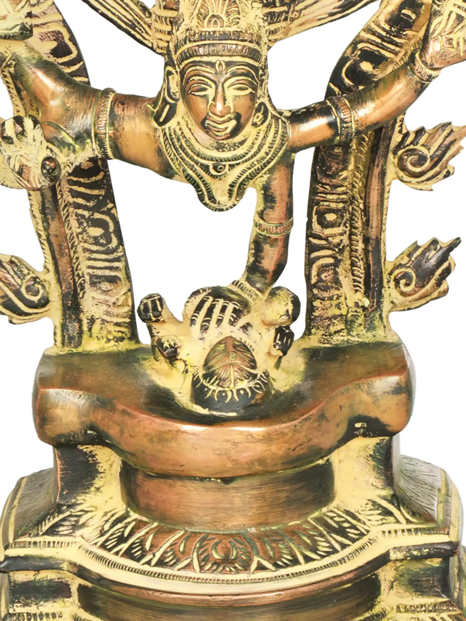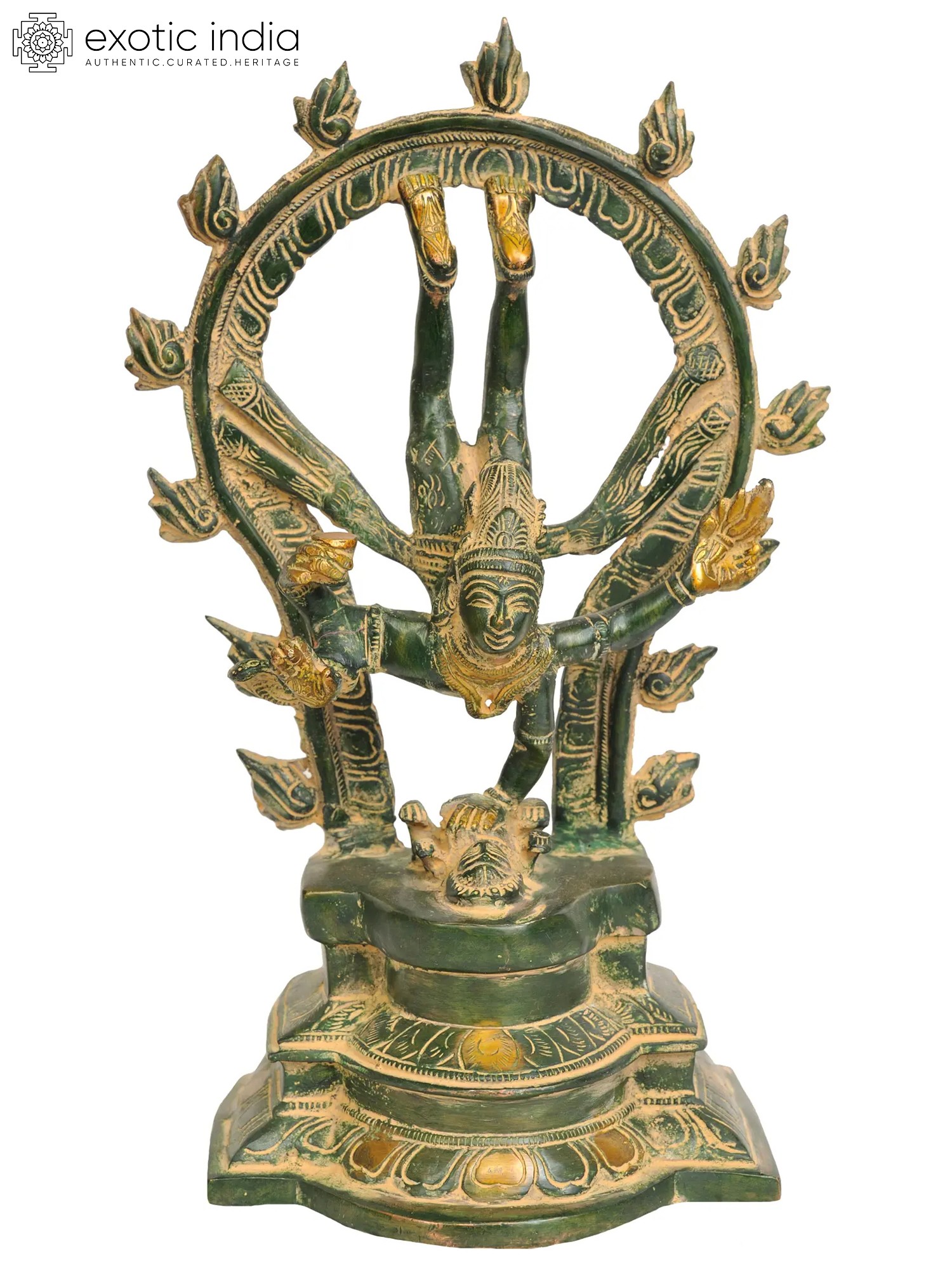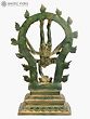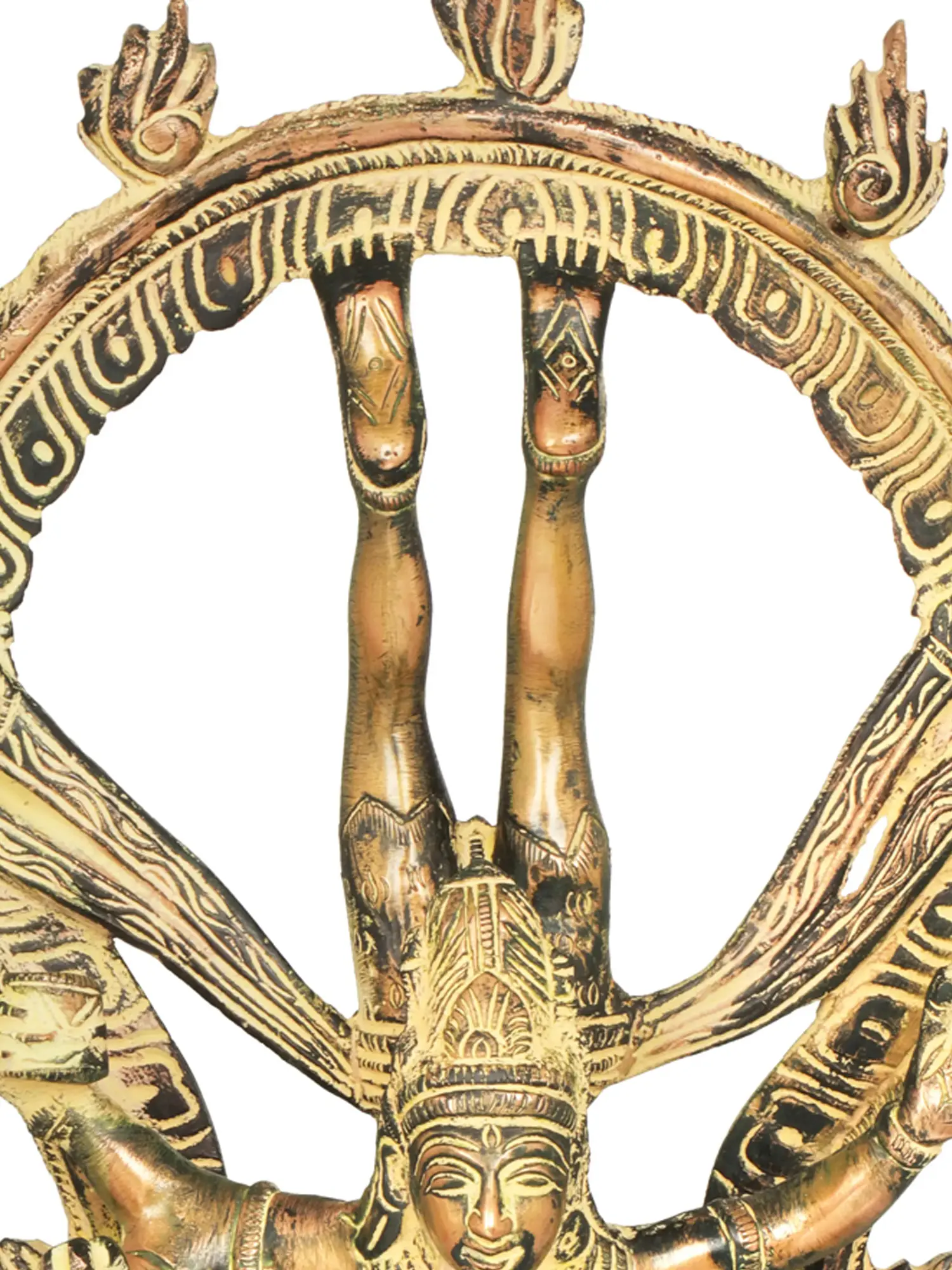 This Brass Statue manifests Lord Shiva’s descending from the heavens, guiding the heavenly river Ganga safely to Earth. In one hand, he cradles Agni, the fire god, and in the other, a damru or a drum. Shiva's right hand extends in the abhaya-mudra, the reassuring "fear not" gesture. His left hand firmly subdues the dwarf of Ignorance, Apasmara. An awe-inspiring prahabhamandala, a fiery arch, envelops Shiva as he gracefully fulfills his cosmic role.