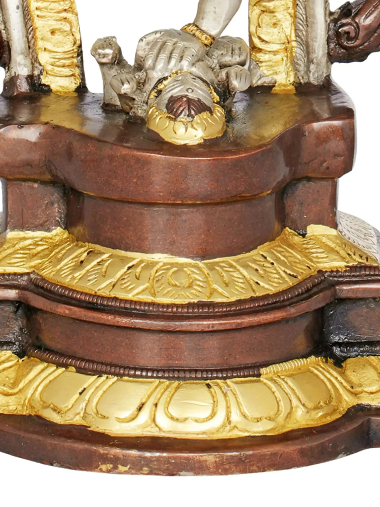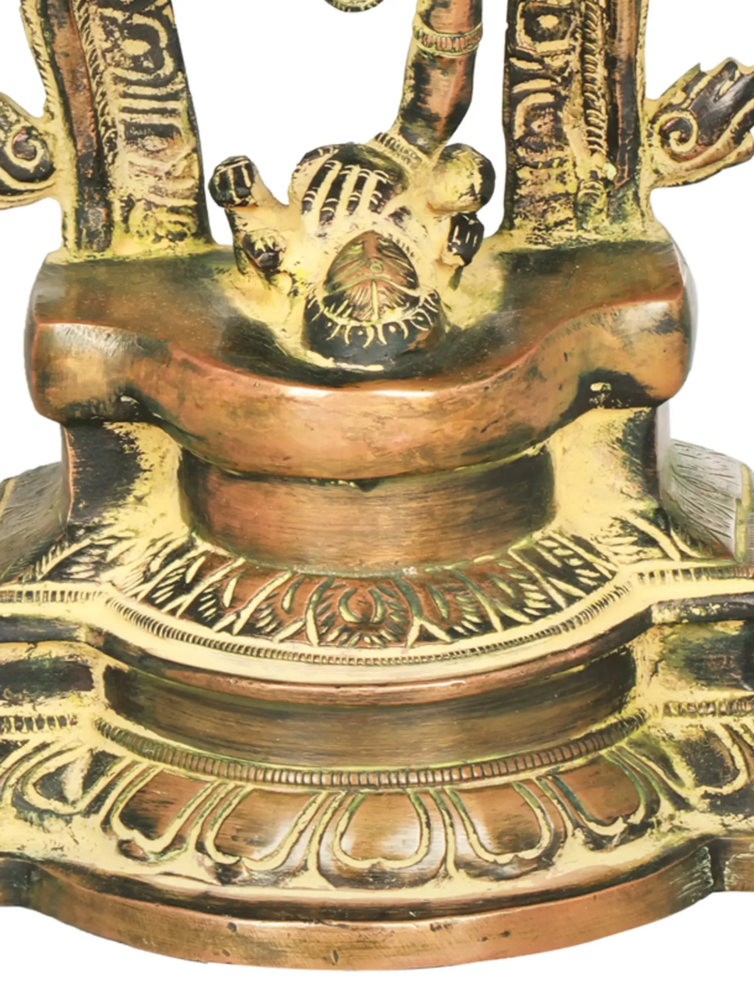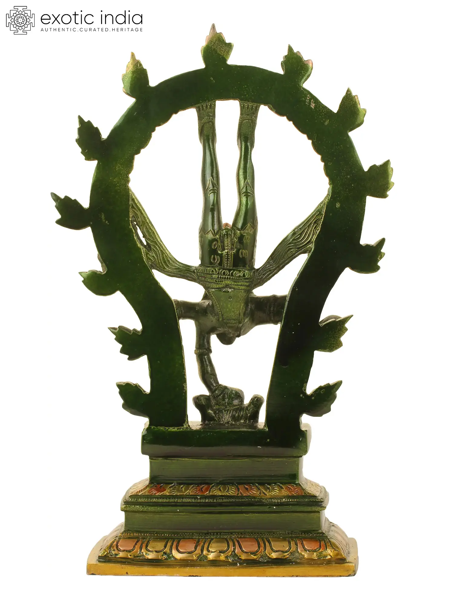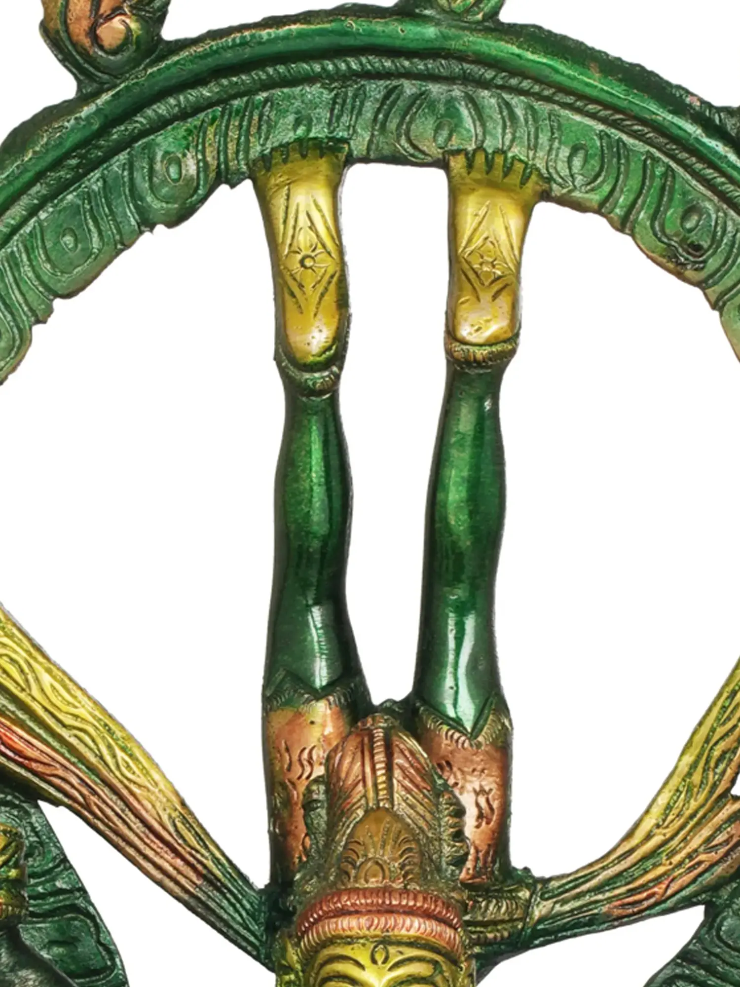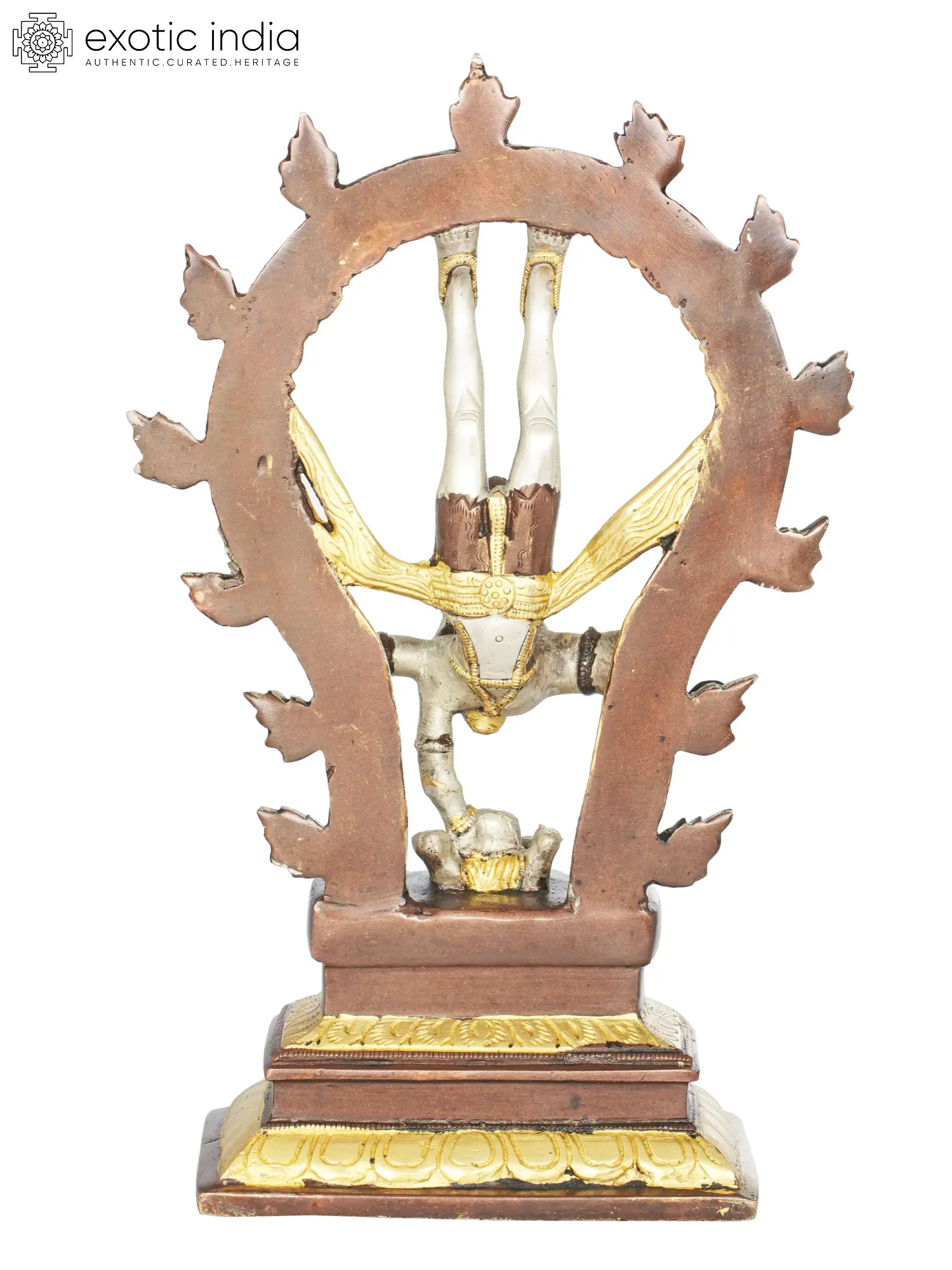 This Brass Statue manifests Lord Shiva’s descending from the heavens, guiding the heavenly river Ganga safely to Earth. In one hand, he cradles Agni, the fire god, and in the other, a damru or a drum. Shiva's right hand extends in the abhaya-mudra, the reassuring "fear not" gesture. His left hand firmly subdues the dwarf of Ignorance, Apasmara. An awe-inspiring prahabhamandala, a fiery arch, envelops Shiva as he gracefully fulfills his cosmic role.