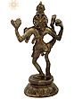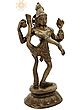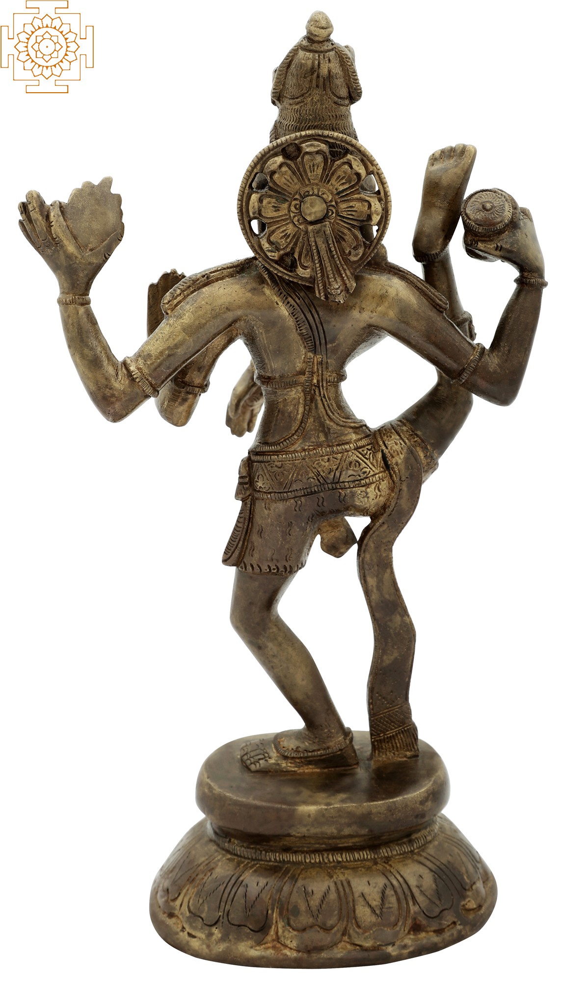 The artist has masterfully rendered Shiva's fierce yet graceful pose, embodying the Nataraja. With multiple arms outstretched, each holding a significant object or performing a symbolic gesture, the deity is depicted mid-stride, one leg elegantly raised. This pose represents the balance of forces in the universe and the cyclical nature of existence. The intricate detailing on the costume and ornaments speaks to the rich artistic heritage of India, where every element is imbued with meaning. The patina achieved on the brass, a testament to the skill of the artisan, adds depth and a sense of ancient reverence to the sculpture.