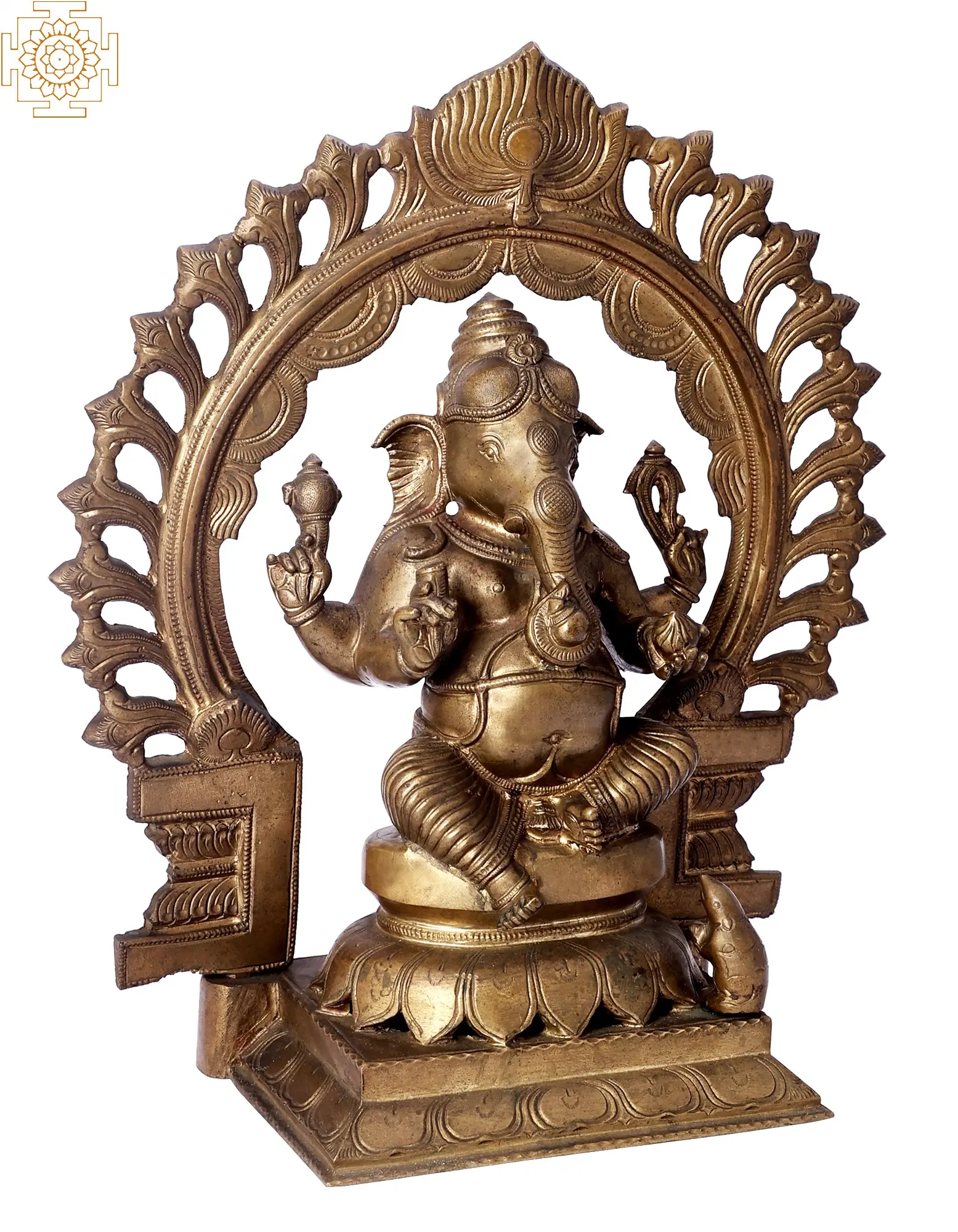 The ornate arch that frames Bhagawan Ganesha is more than just an aesthetic flourish; it is symbolic of the cosmos, the divine aura, and the protective embrace of the universe. Its intricate detailing, reminiscent of temple architecture and sacred mandalas, speaks to the deep spiritual roots from which this art form springs. The lotus base upon which Ganesha is seated is a universal symbol of purity, spiritual awakening, and enlightenment, signifying his divine origin and transcendental nature. The presence of his divine vehicle, the mooshika (mouse), often depicted near his feet, represents his mastery over desire and the ability to overcome even the smallest of impediments. The Panchaloha bronze, meticulously worked through the lost-wax casting method, ensures that every subtle nuance of Ganesha's form, from the curve of his trunk to the folds of his drapery, is rendered with remarkable fidelity and depth. This technique, which involves creating a clay model, covering it with wax, and then casting the molten metal into the resulting cavity, results in a sculpture that is not only beautiful but also possesses a soul and a story. The quality of craftsmanship evident in this piece makes it a true heirloom, meant to be cherished for generations. ––––––––––––––––––
