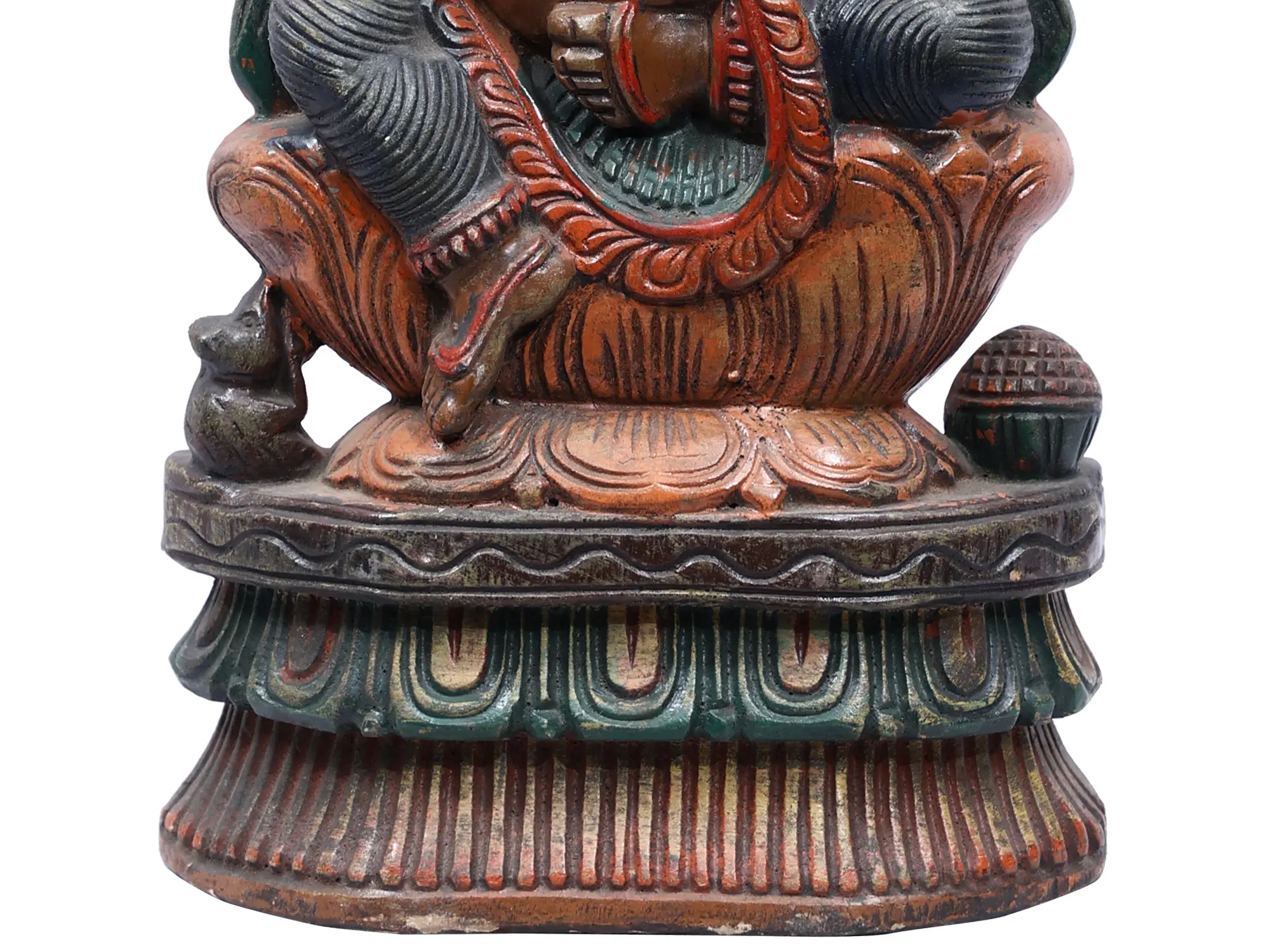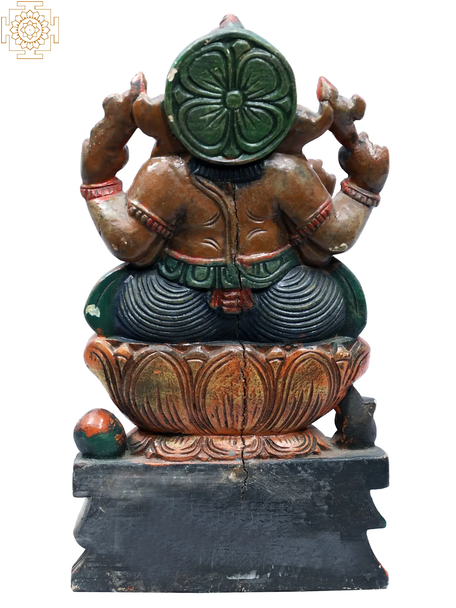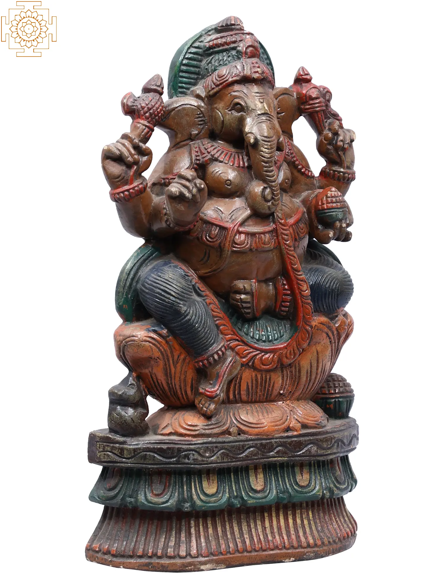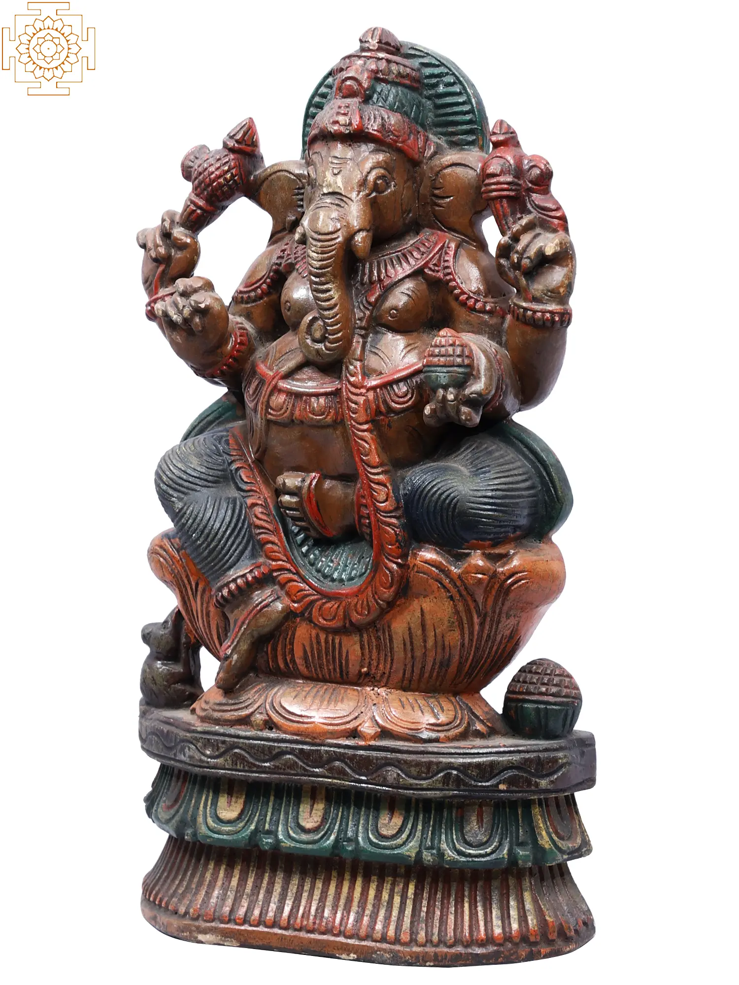 This exquisite wooden statue captures the benevolent form of Lord Ganesha, the beloved deity revered as the remover of obstacles and the bestower of good fortune. Seated majestically upon a blooming lotus, a symbol of purity and enlightenment in Hindu tradition, this depiction of Ganapati exudes an aura of profound peace and divine grace. The rich, textured wood, brought to life with subtle earthy tones and vibrant accents of red and green, imbues the sculpture with a tangible sense of warmth and artistry. Each carefully carved detail, from the gentle curve of his trunk to the expressive eyes, speaks to the skill of the craftsman and the deep spiritual significance of this sacred image.