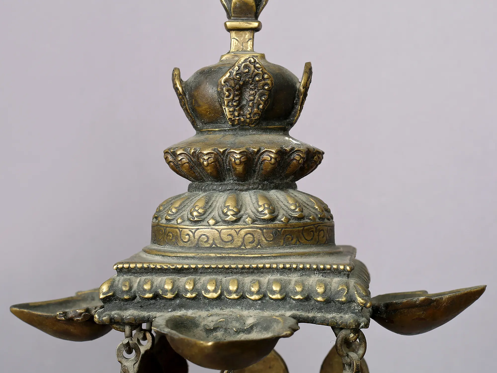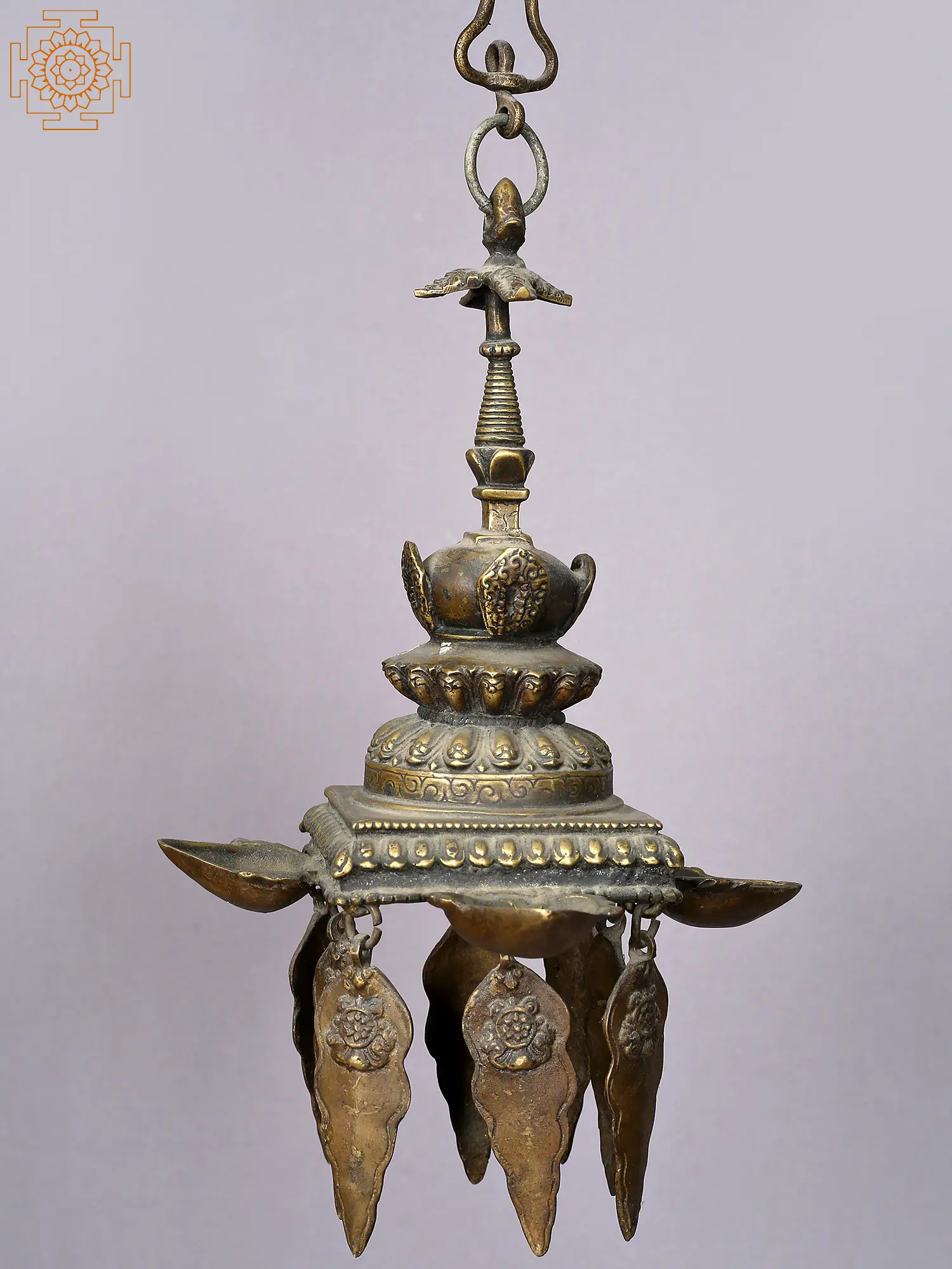 In this beautiful haven, there is a hanging lamp with a radiant flame that sways to the beat of cosmic secrets, suspended like shimmering gems. The flashing light creates an ethereal aura that combines with the profound energy of the Dhyani Buddha, whispering old truths.