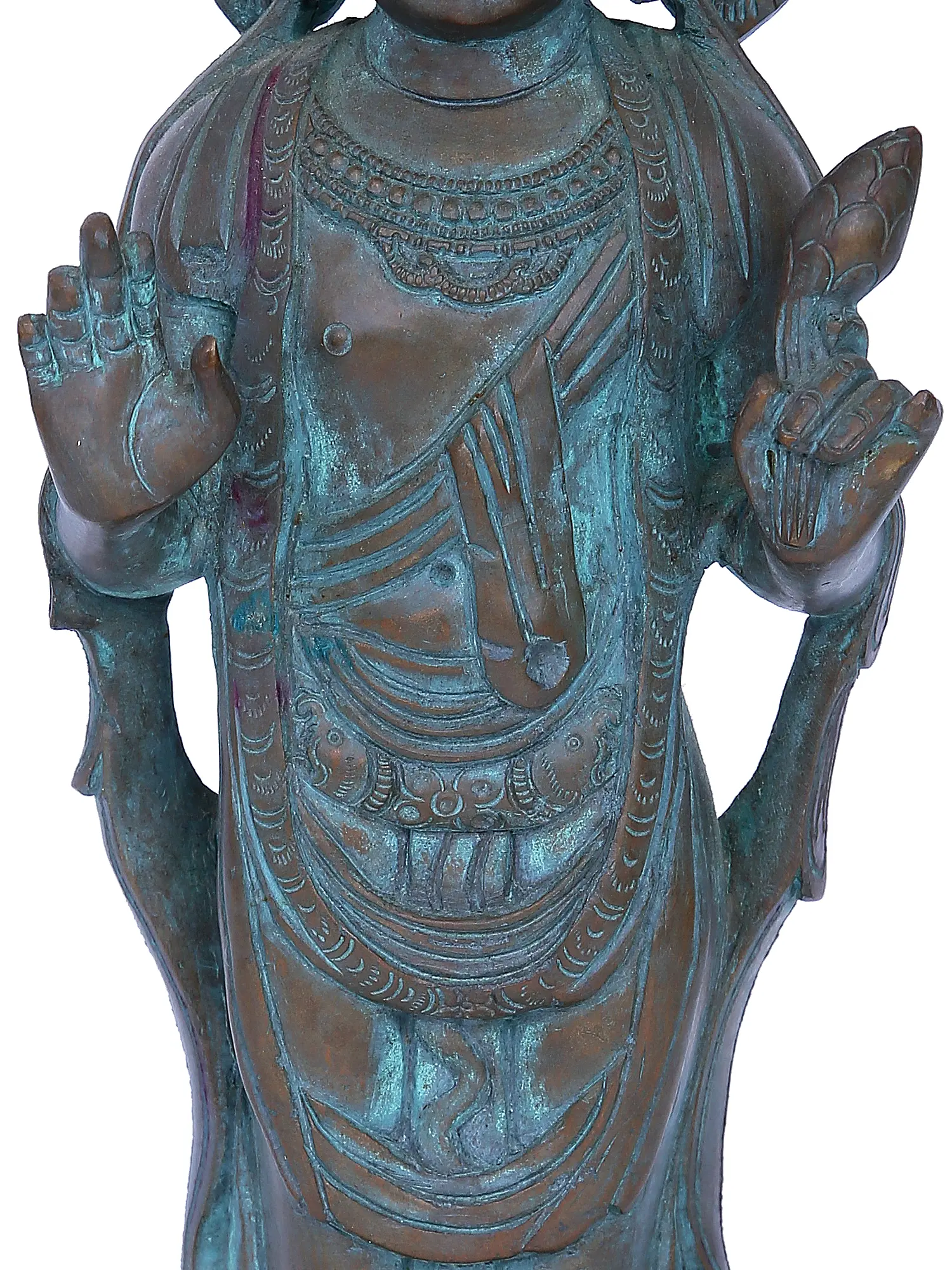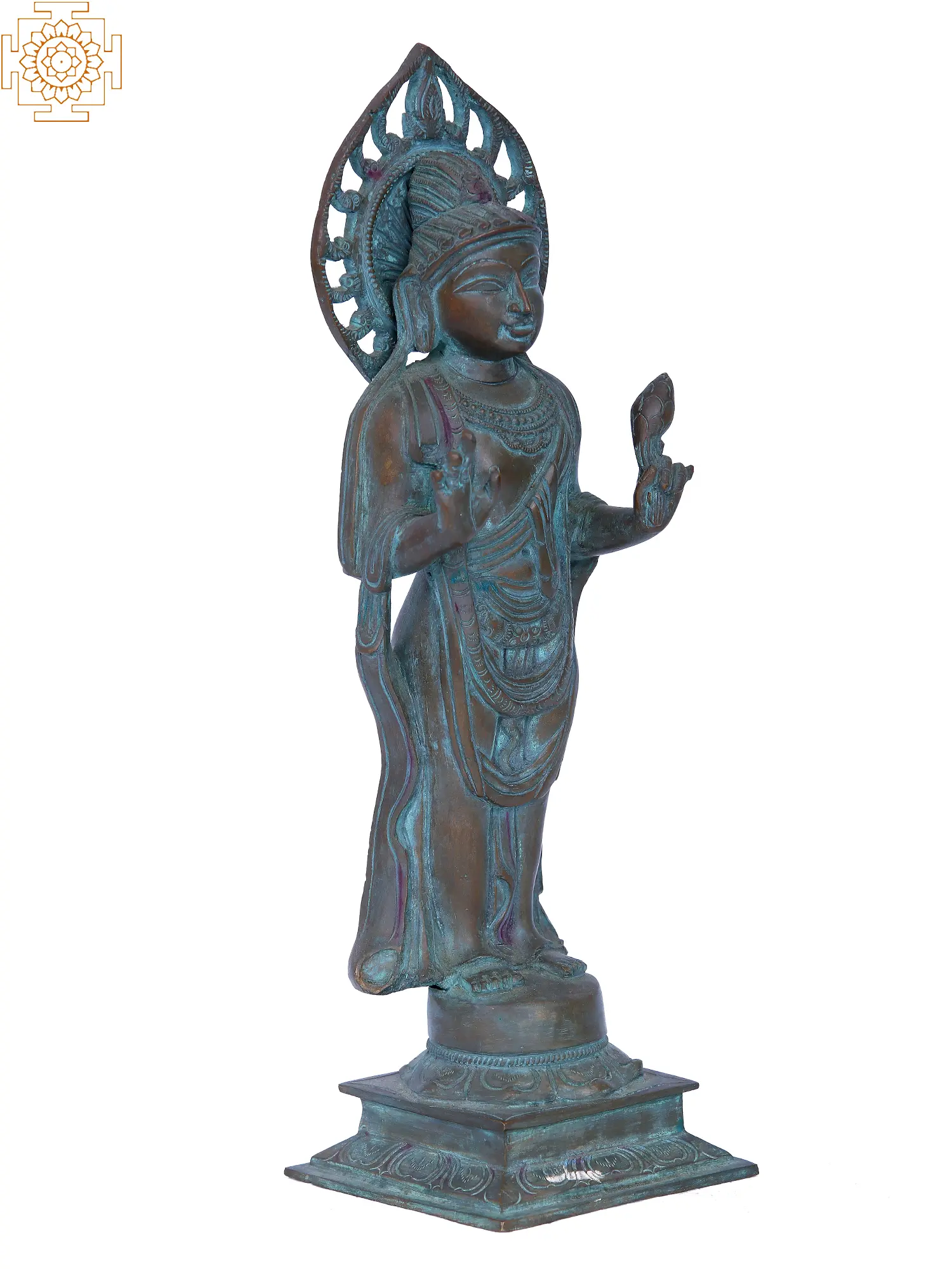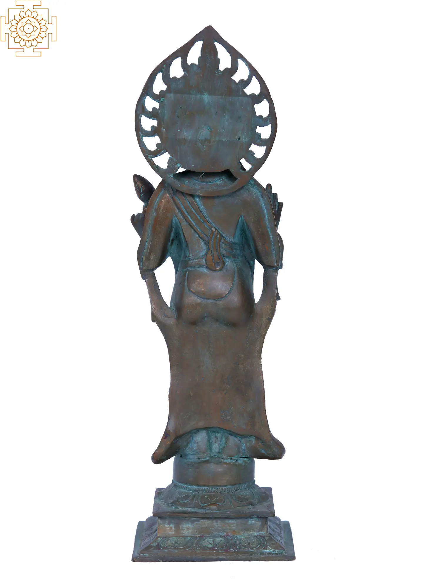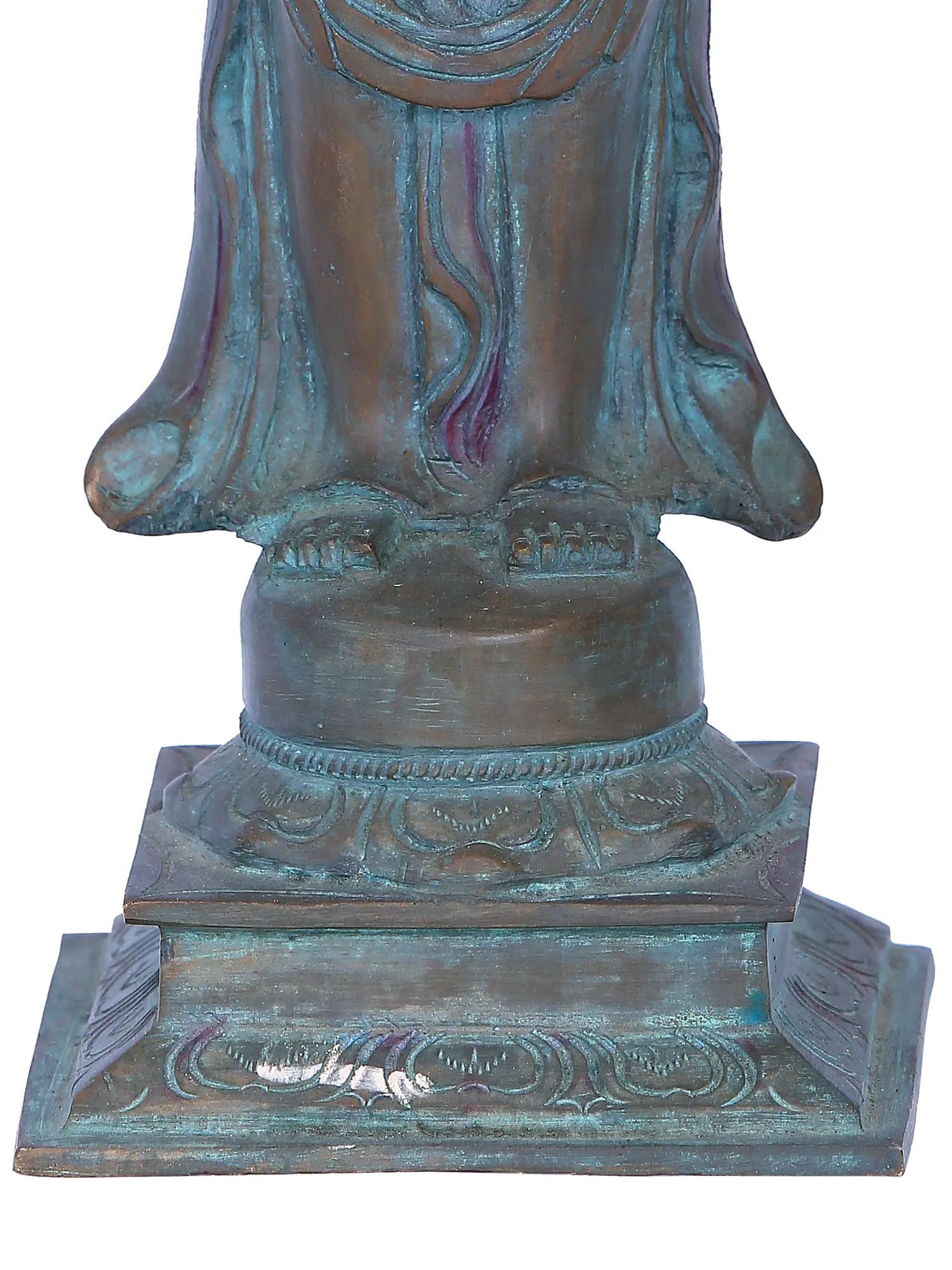 The rich patina that graces this bronze sculpture, with its subtle hints of verdigris, tells a story of time and devotion. This aging process, a natural characteristic of bronze, adds depth and a unique character to the piece, making each statue an individual work of art. It is designed to be a cherished possession, an heirloom that can be passed down through families, carrying with it a legacy of peace, wisdom, and artistic excellence. Whether placed in a meditation space, a living area, or a garden, this statue emanates an aura of tranquility and spiritual grace, enriching any environment with its timeless beauty and profound symbolism.