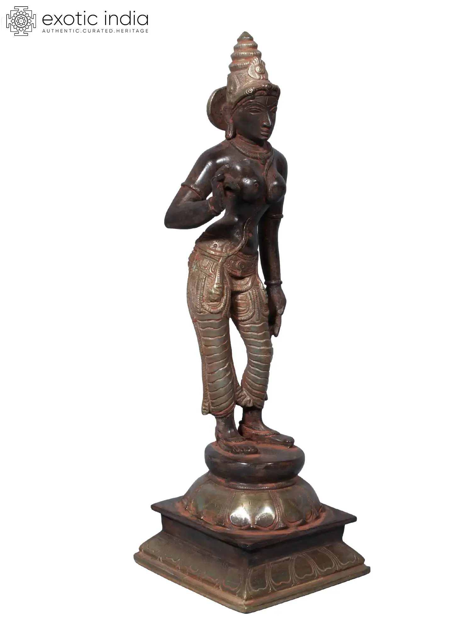 This exquisite brass statue captures the serene and powerful presence of Goddess Parvati, also revered as Uma, the consort of Lord Shiva. Standing gracefully upon a lotus pedestal, this depiction evokes the divine mother, the benevolent mother of the universe, and the embodiment of beauty, power, and devotion. The skilled craftsmanship in brass brings to life the gentle curves of her form, the delicate tilt of her head, and the subtle expression of inner peace and strength. Her posture, with a slight tribhanga (three-bend) pose, lends a dynamic yet balanced feel to the sculpture, hinting at her celestial dance and the rhythm of creation. The intricate details adorning the figure speak volumes of the artisan's dedication. The tiered headdress, the subtle ornamentation around her neck and wrists, and the beautifully draped garment around her lower body are all rendered with remarkable precision. The textured folds of the dhoti are particularly noteworthy, creating a sense of movement and realism despite the solid medium of brass. The rich patina, indicative of age and devotion, adds a layer of depth and character to this divine representation.