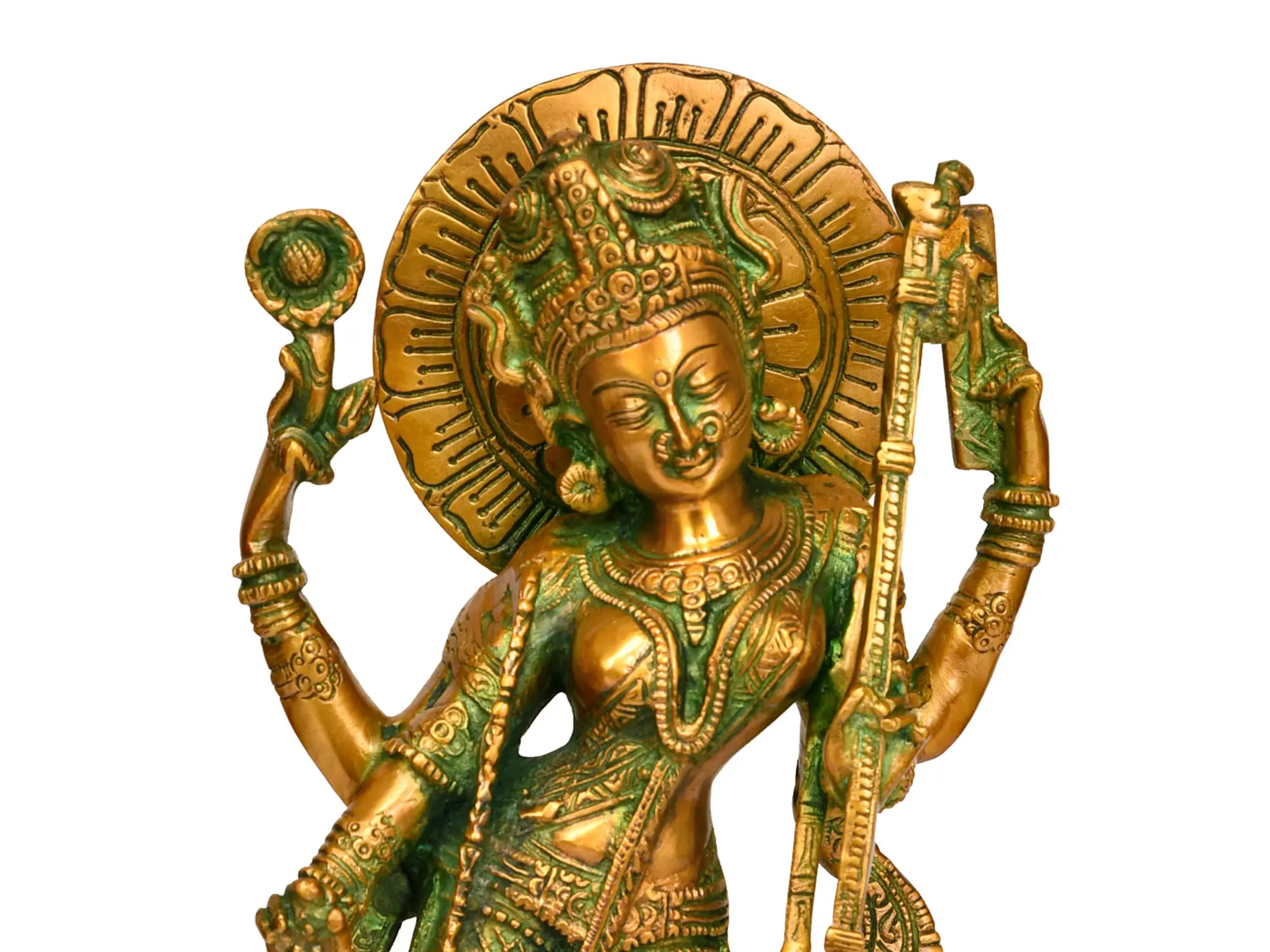 Elegantly poised in the graceful tribhanga position, this exquisite sculpture of Goddess Saraswati captures her divine presence. With four arms, each symbolically mirroring her husband Brahma's four heads, she embodies the facets of manas (mind, sense), buddhi (intellect, reasoning), citta (imagination, creativity), and ahamkara (self-consciousness, ego). Saraswati, the epitome of action and reality, complements Brahma's abstract nature.