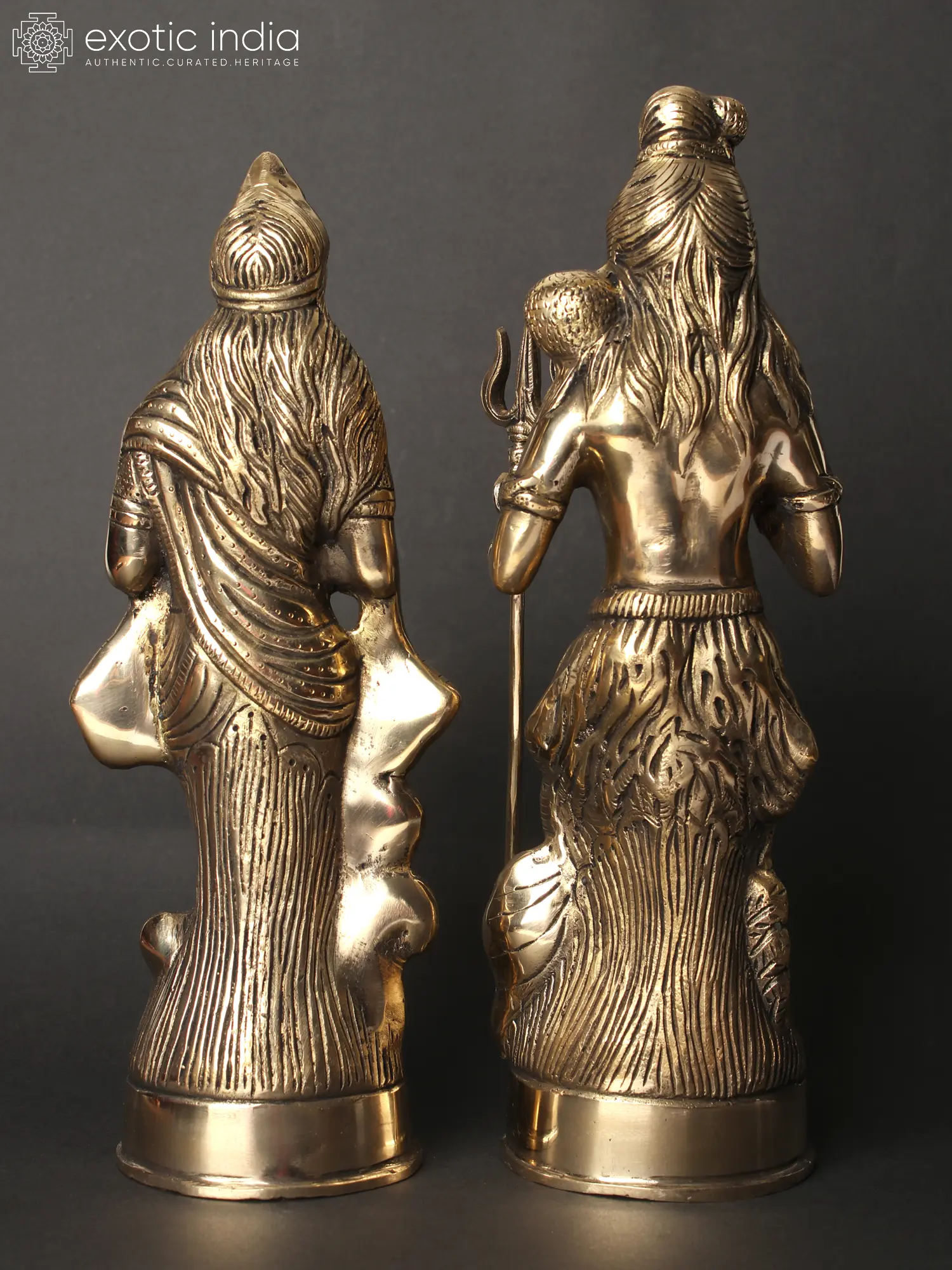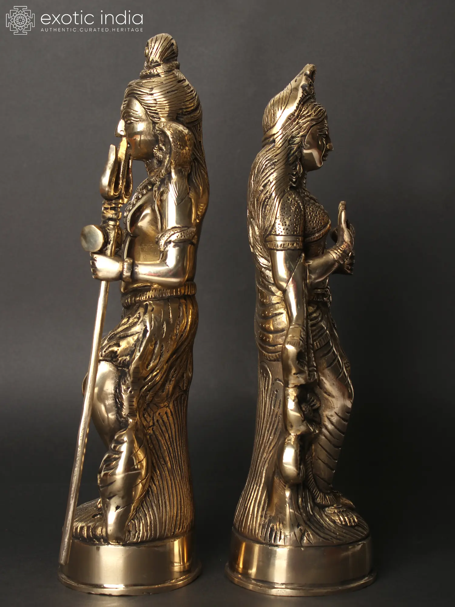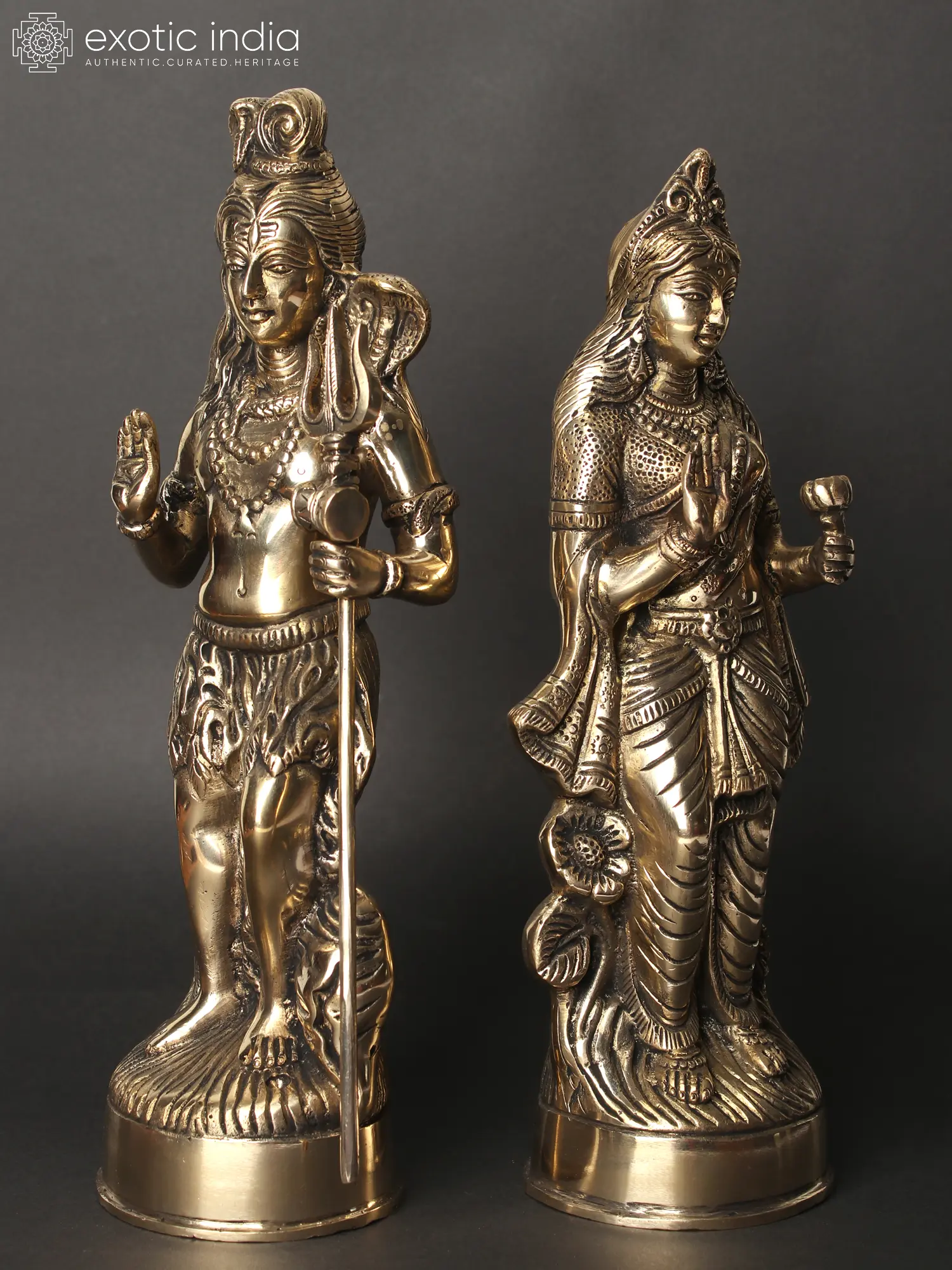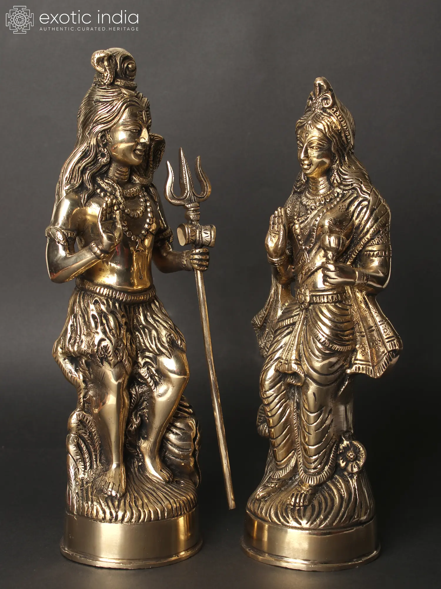 The image of Lord Shiva and Goddess Parvati standing and blessing their devotees holds spiritual significance in Hinduism. Shiva represents destruction and Parvati symbolizes nurturing energy. Together, they depict the balance of creation and destruction, the cycle of life. This brass statue serves as a potent reminder of their divine presence and offers a focal point for devotees to connect with their spirituality. By meditating or praying before this image, devotees seek blessings for protection, prosperity, and spiritual growth. The statue's depiction captures the essence of their divine grace, instilling faith and providing solace to the worshippers.