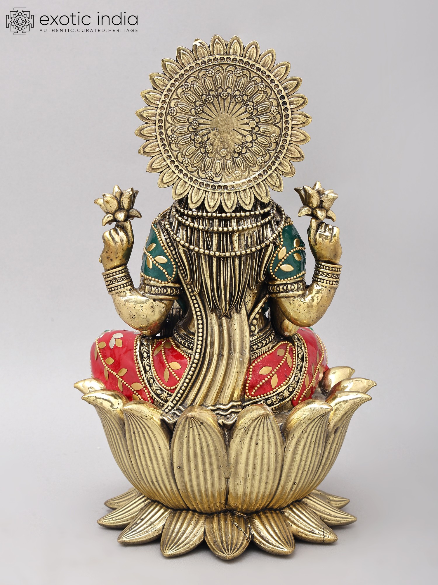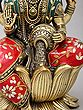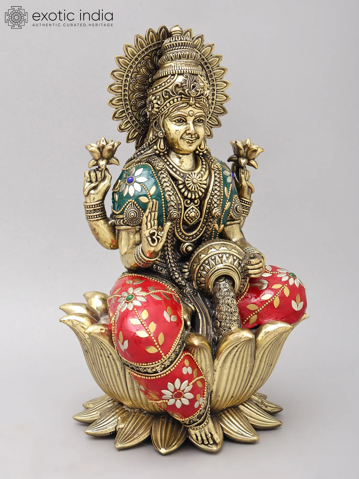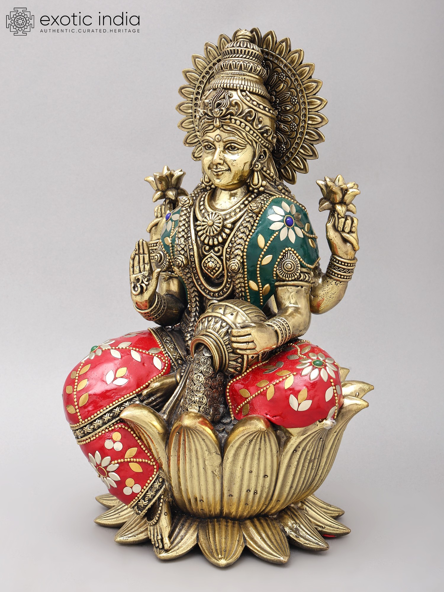 The goddess is seated gracefully upon an opulent lotus bloom, its petals fanned out to create a majestic throne. Her four arms are adorned with blessings and symbols of wealth, holding lotuses and a pot of overflowing riches. You'll notice the delicate inlay work on her robes, a rich tapestry of red and green accented with floral motifs in contrasting colors and miniature beadwork. The overall composition, standing at an impressive twelve inches, exudes a regal aura that commands reverence and admiration.