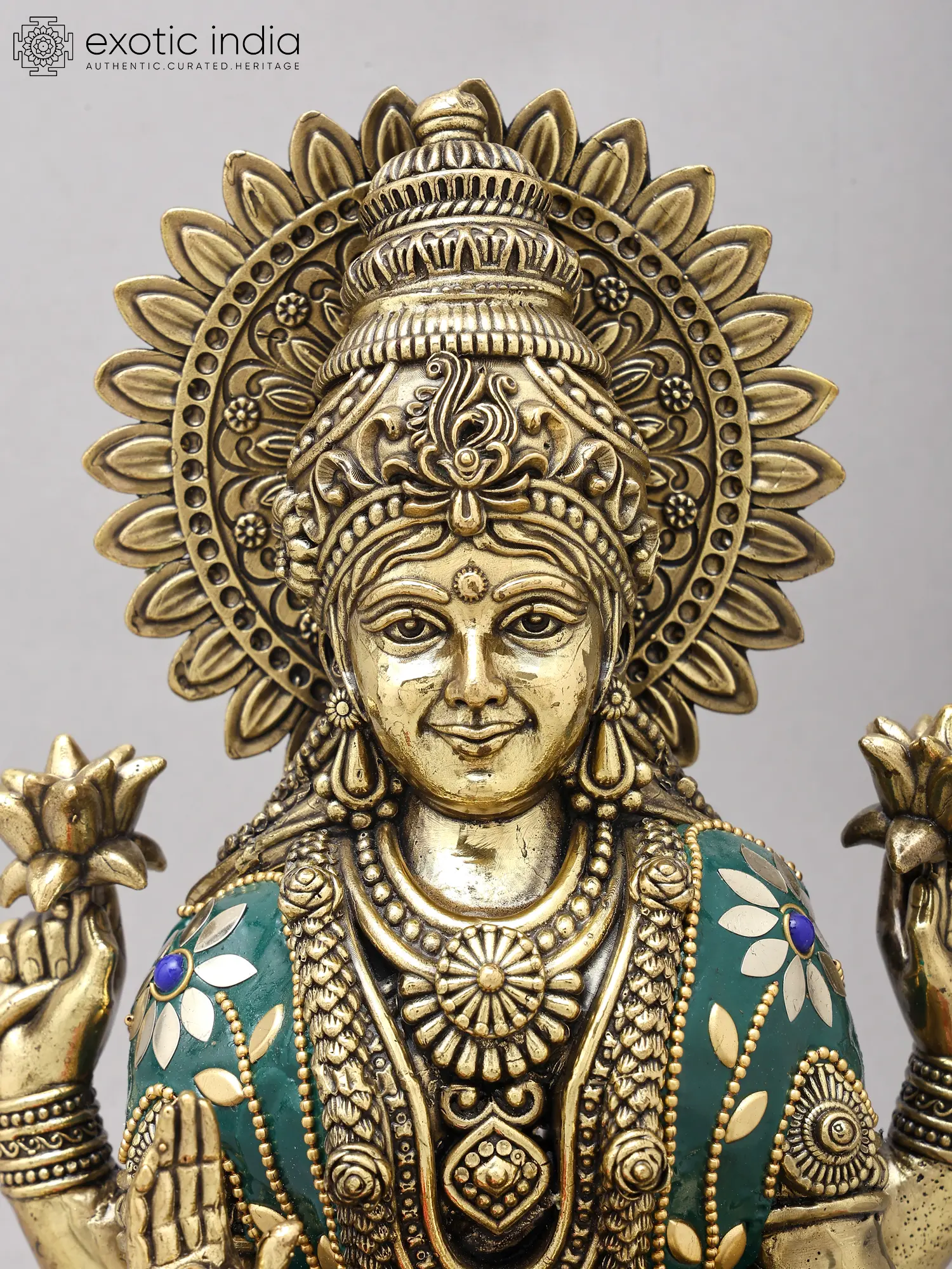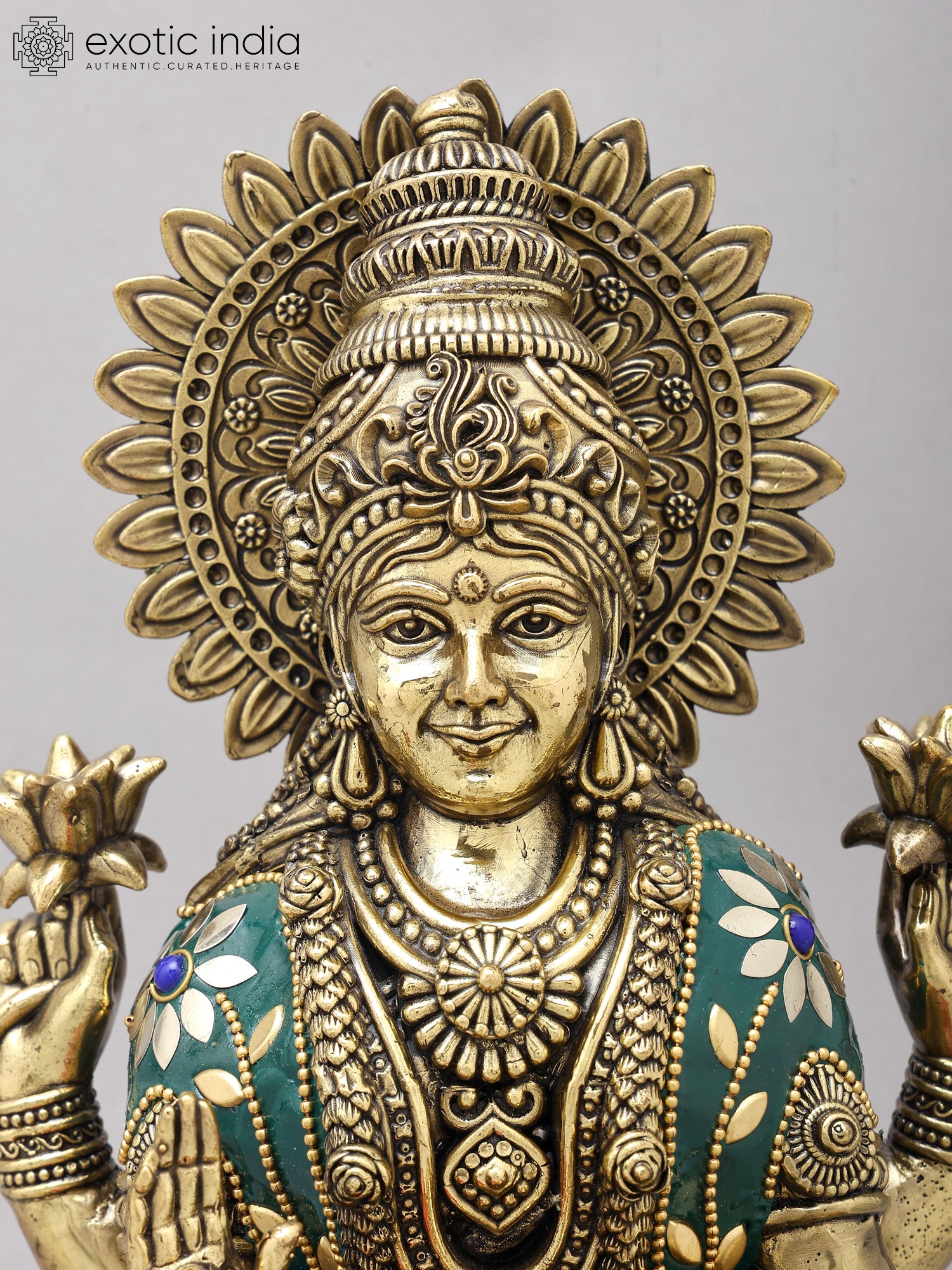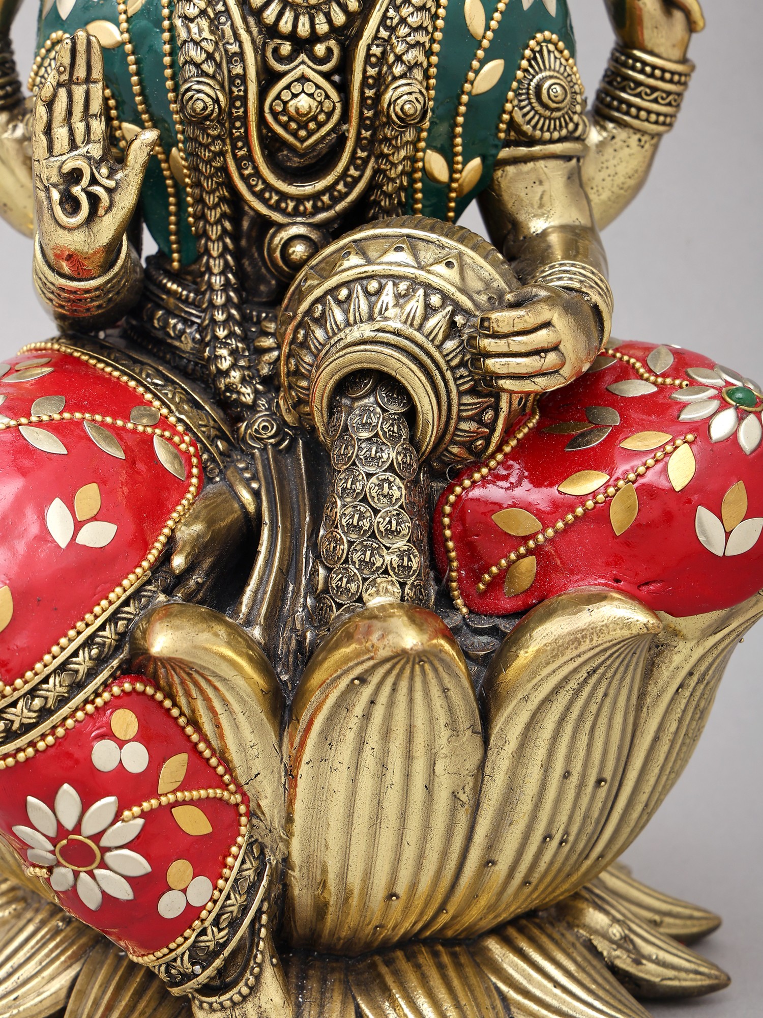 The goddess is seated gracefully upon an opulent lotus bloom, its petals fanned out to create a majestic throne. Her four arms are adorned with blessings and symbols of wealth, holding lotuses and a pot of overflowing riches. You'll notice the delicate inlay work on her robes, a rich tapestry of red and green accented with floral motifs in contrasting colors and miniature beadwork. The overall composition, standing at an impressive twelve inches, exudes a regal aura that commands reverence and admiration.