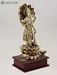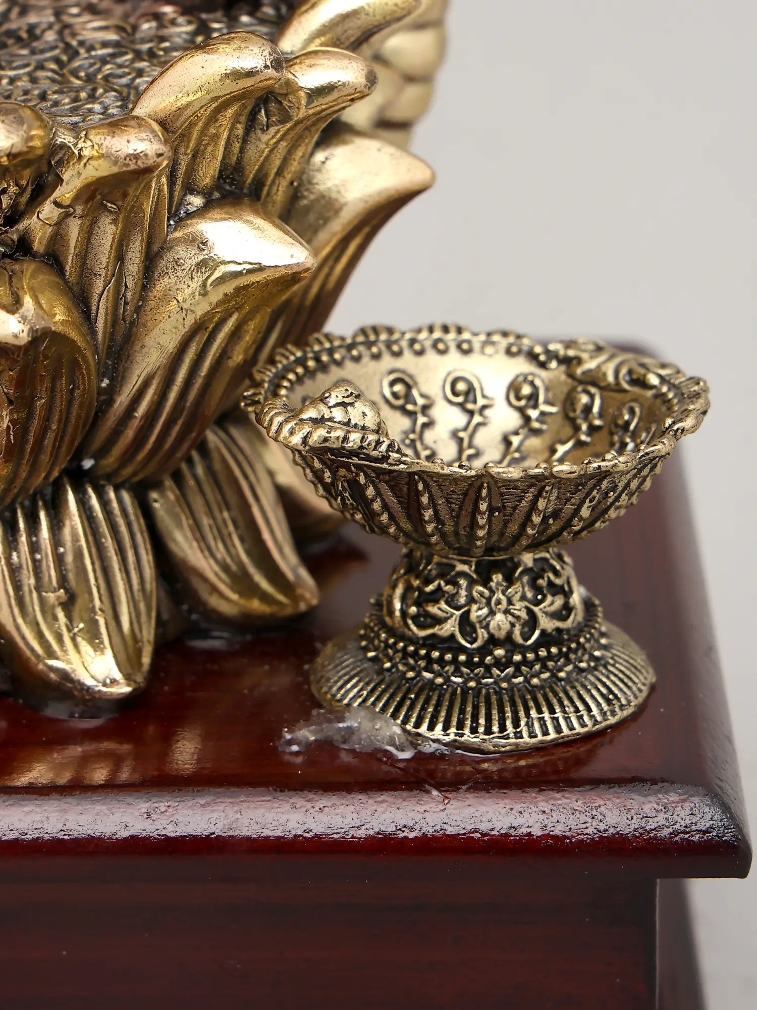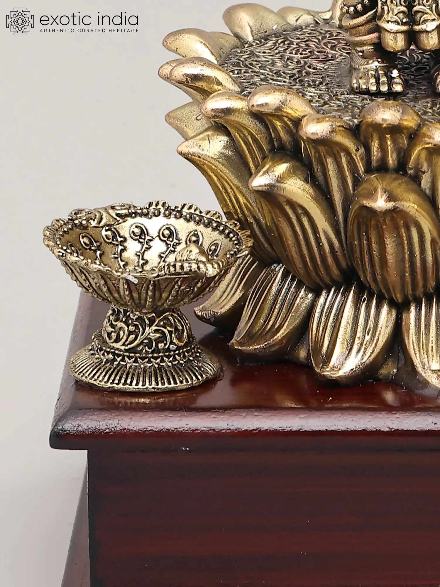 7" Superfine Seated Goddess Dhanalakshmi with Oil Lamps and Wood Base | Brass Sculpture