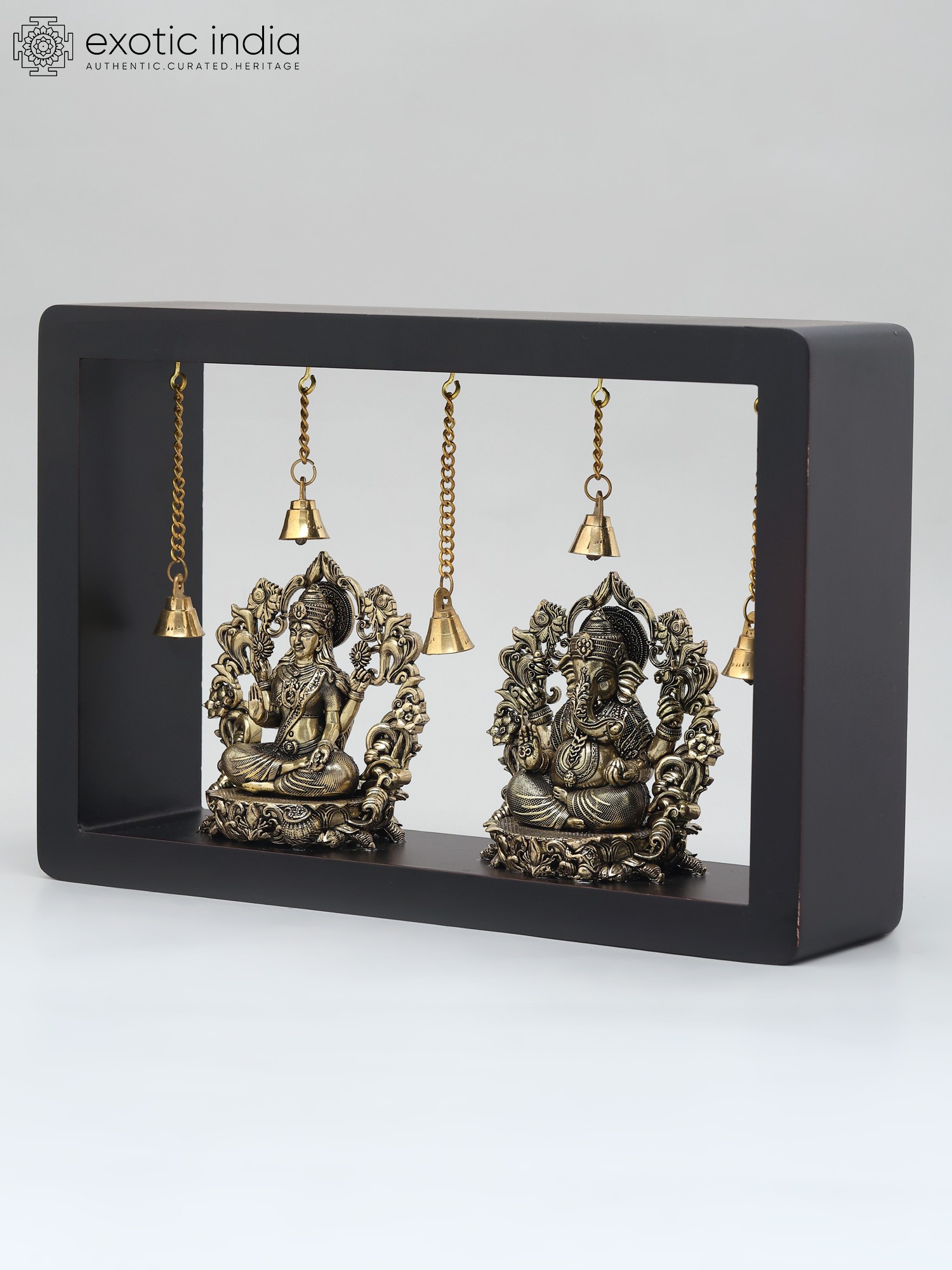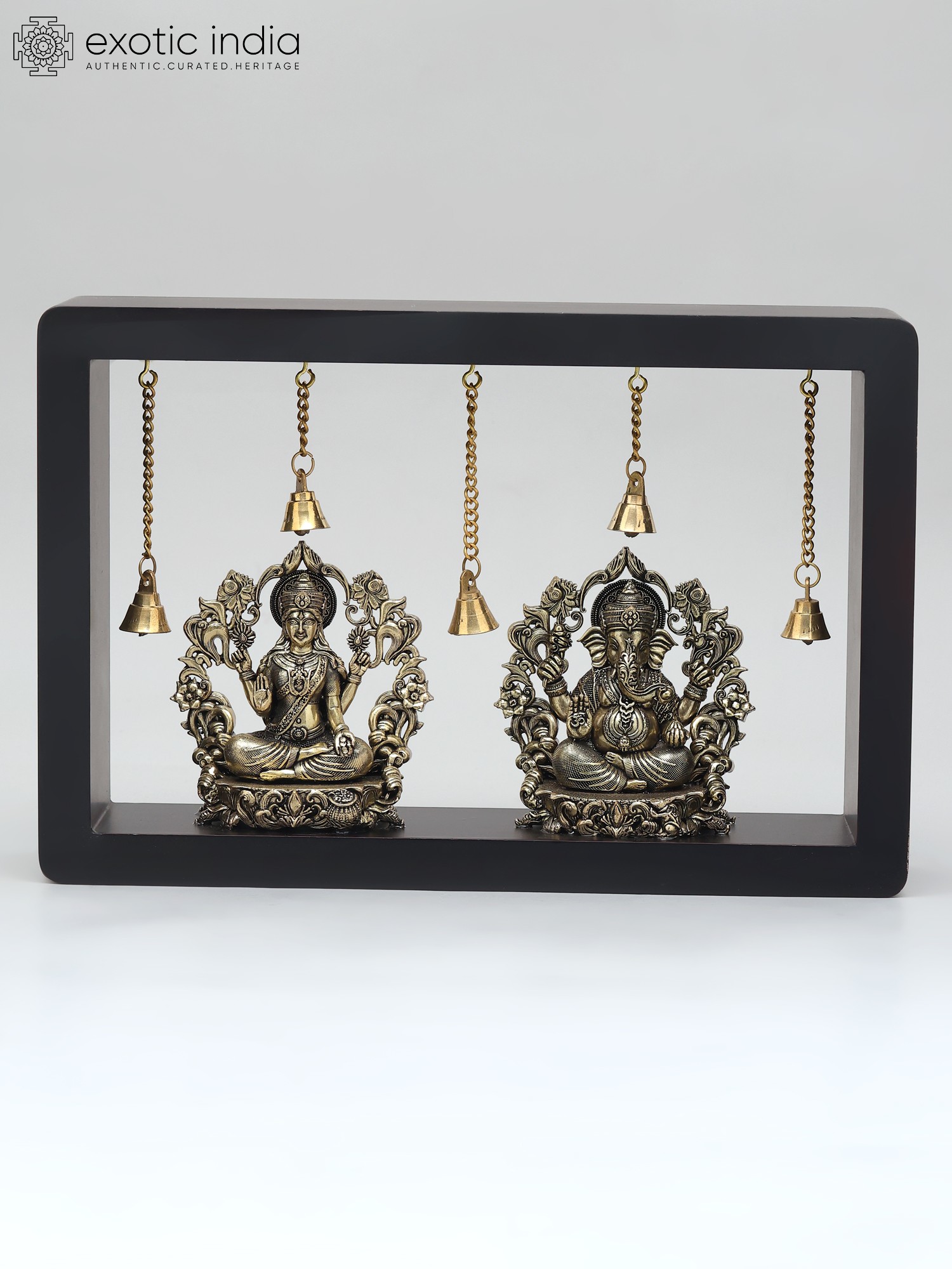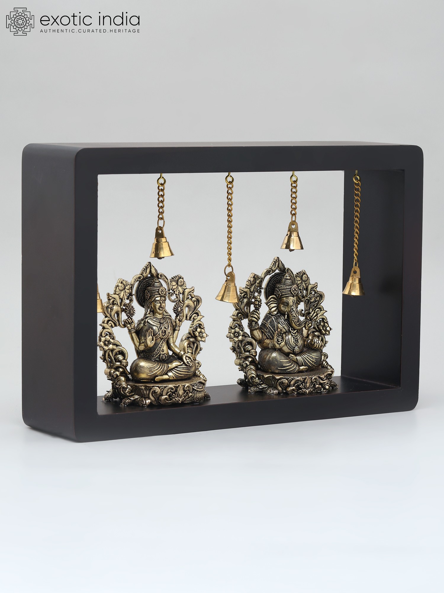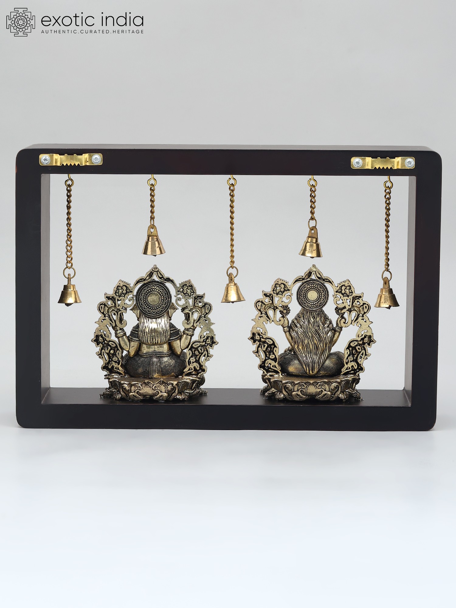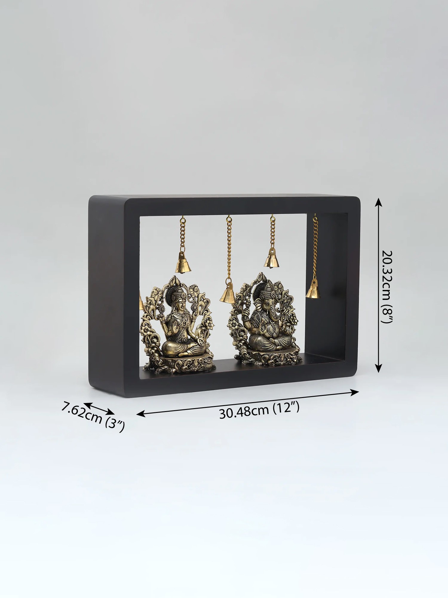 17" Wood Framed Superfine Brass Lakshmi Ganesha Saraswati with Dangling Bells | Wall Hanging