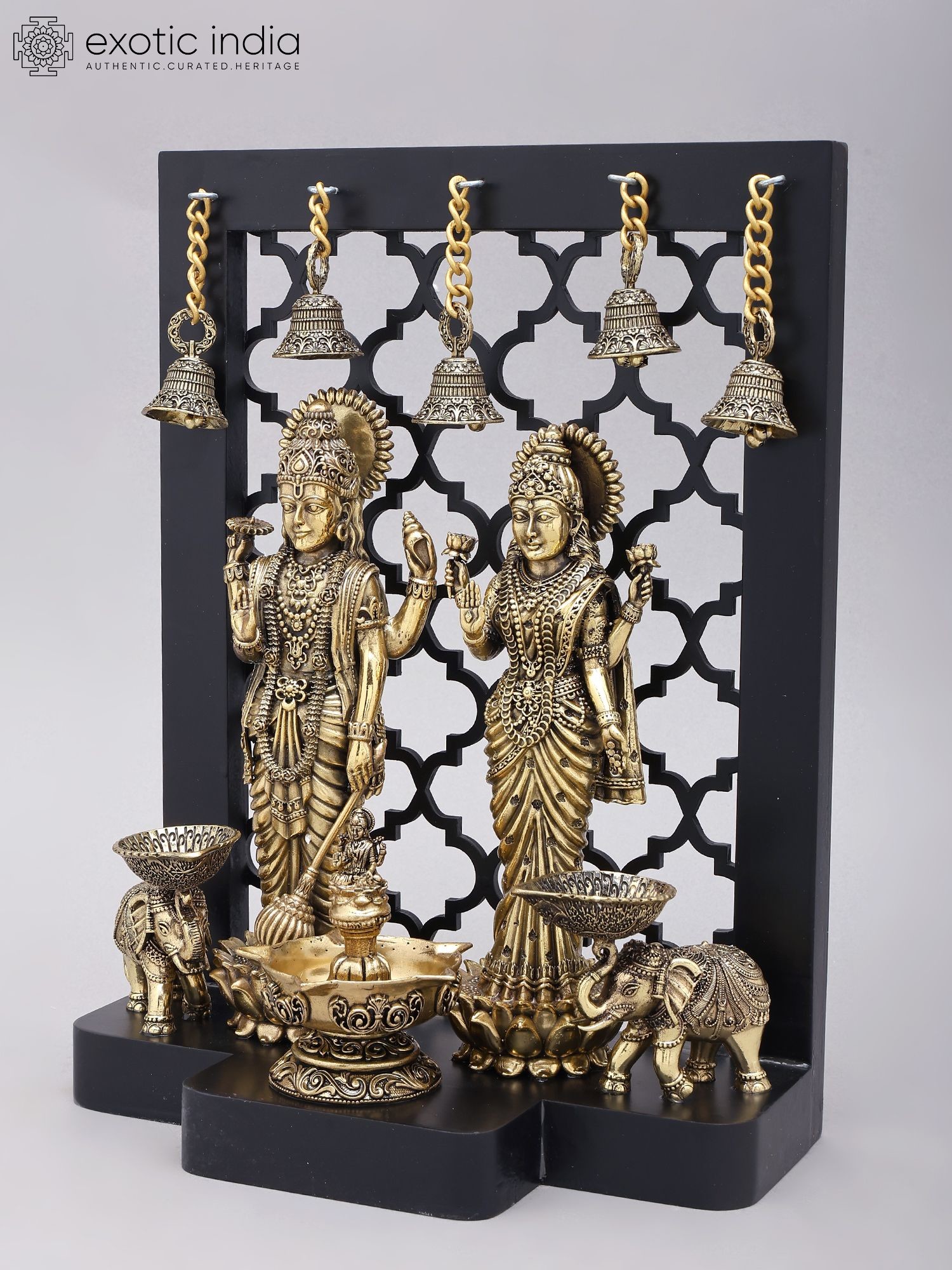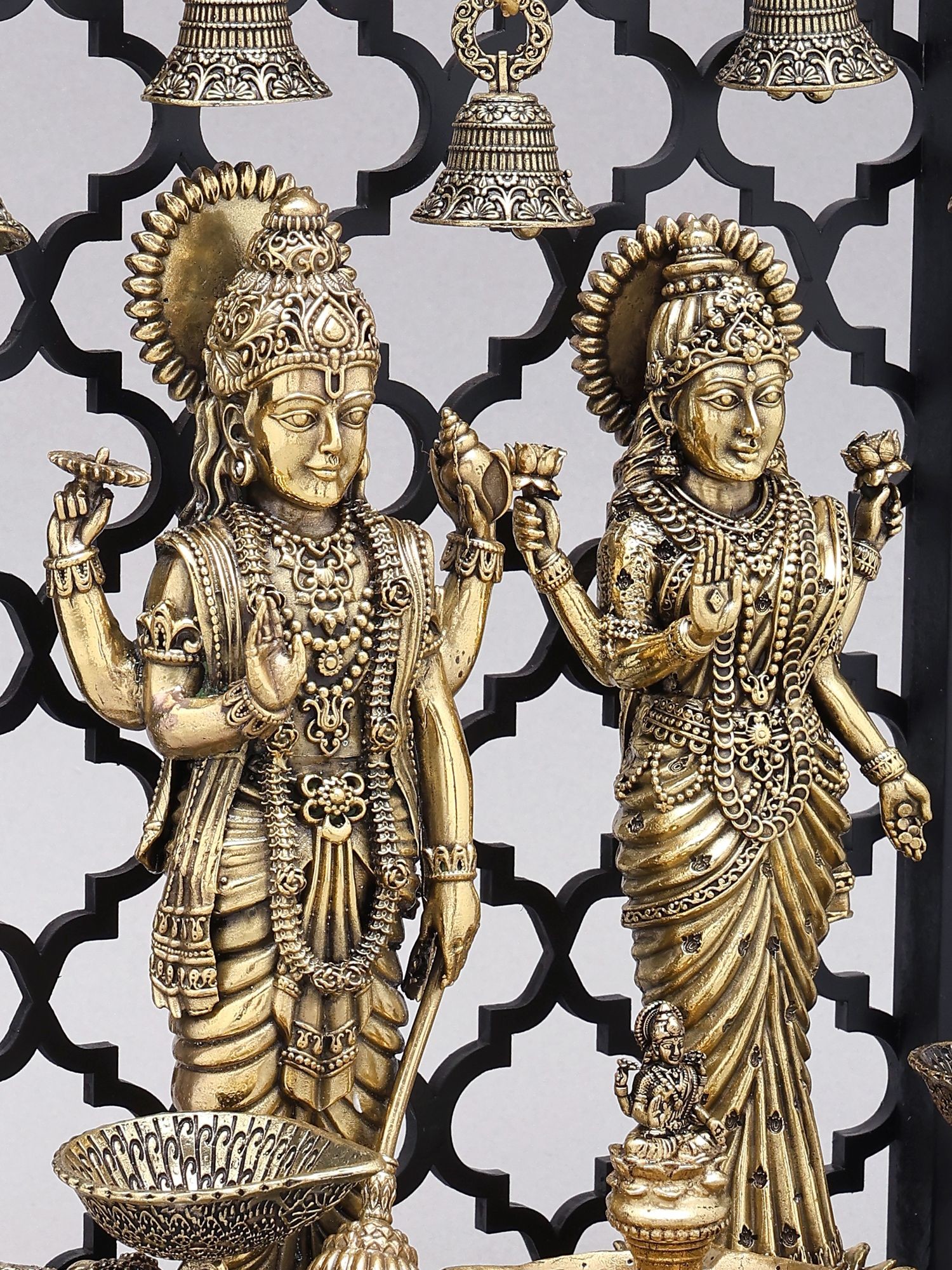 Standing Lakshmi Narayana with Bells - Wood Framed Brass Wall Sculpture