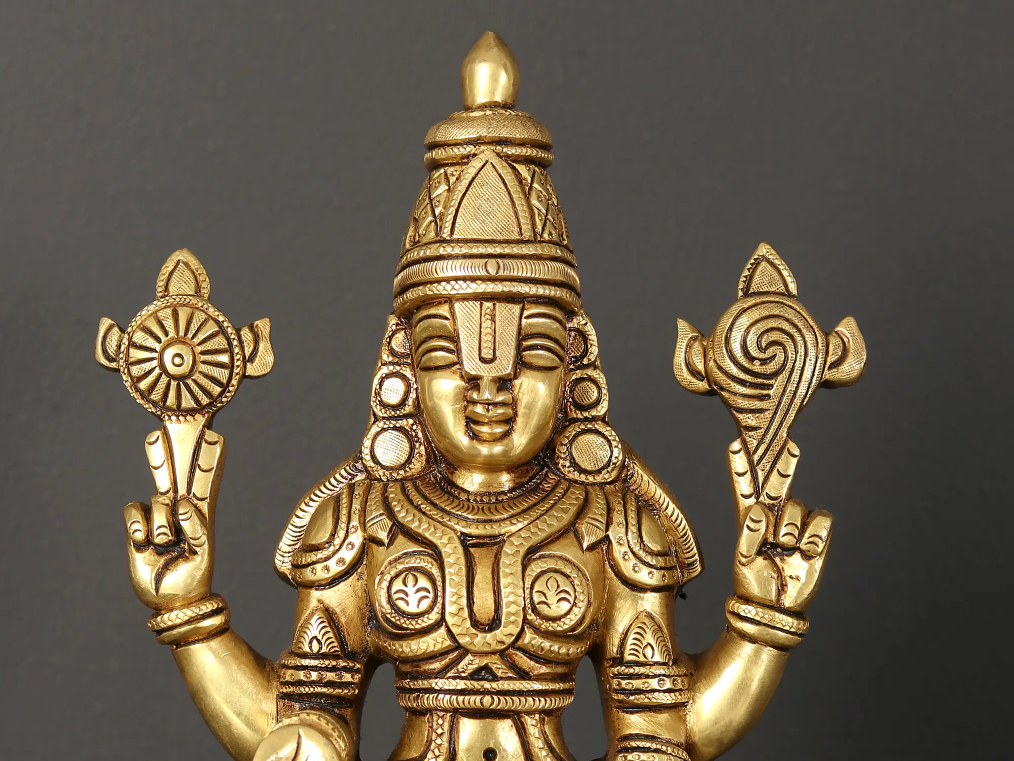 The Superfine Tirupati Balaji Statue in Brass (Venkateshvara) is a stunning depiction of Lord Venketeshwara with remarkable symmetry in its design. The pleats of the dhoti are meticulously portrayed in a perfectly balanced manner, adding to the visual harmony. Lord Venketeshwara is portrayed holding the Panchajanya conch and the Sudarshan Chakra, representing divine power and protection. The intricately designed crown showcases the regal aura of the deity. The statue captures Lord Venketeshwara in a standing position, emanating a sense of grace and majesty. With hands raised in a blessing gesture, the statue embodies benevolence and compassion. The prominent tilak on the forehead is distinctively characteristic of Lord Balaji, signifying his divine status and auspicious presence.