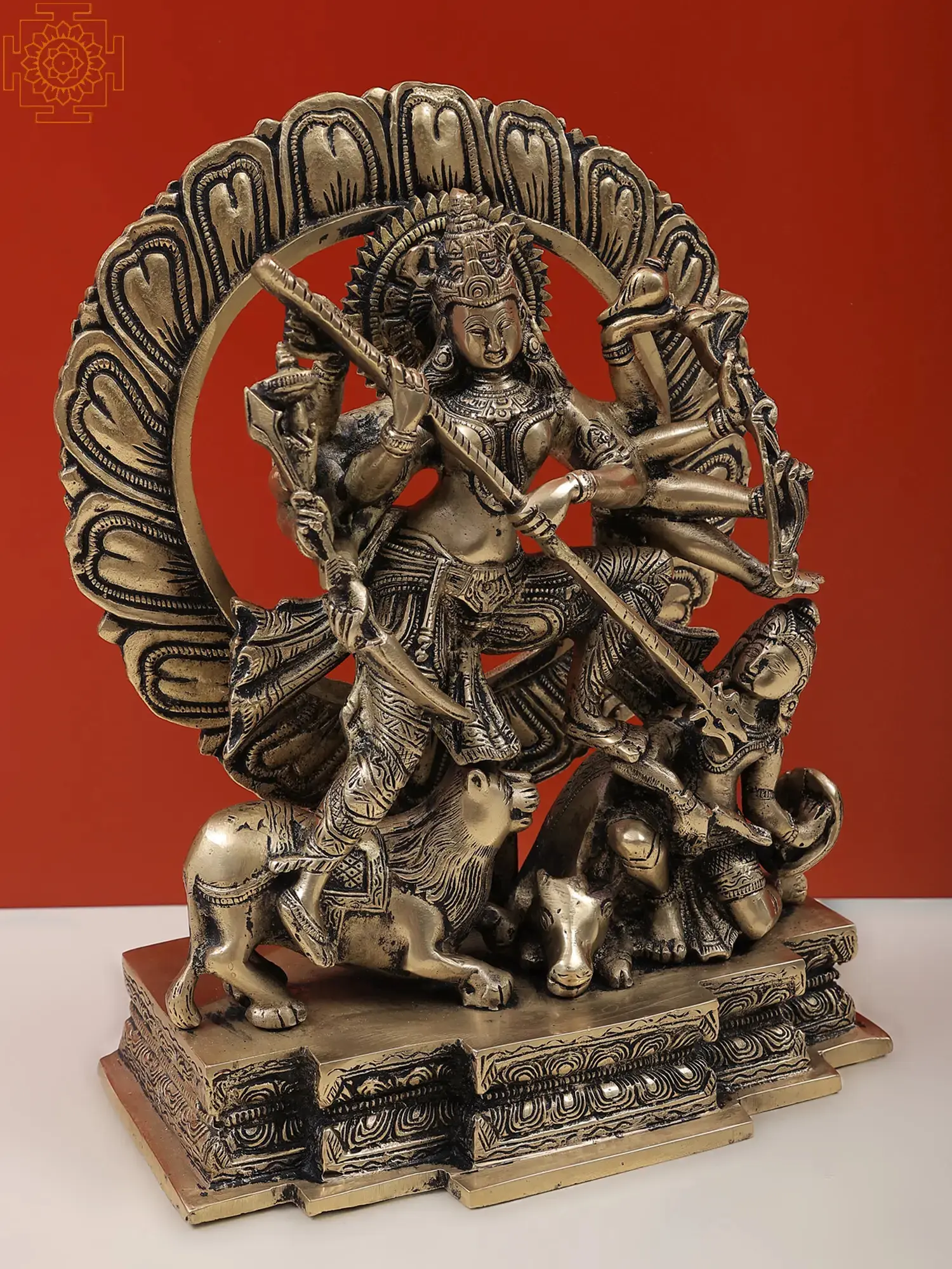 Experience the power and grace of the Ten-armed Mahishasuramardini Goddess Durga with this Handmade Brass idol. Crafted in India, this sculpture embodies the fierce and protective aspect of the goddess. Mahishasuramardini represents the victory of good over evil. Her ten arms symbolise her ability to vanquish all adversities. The intricately crafted brass statue serves as a visual reminder of the interconnectedness of strength and righteousness, echoing the core concept of divine justice. Having Mahishasuramardini in your sacred space ensures not just divine protection but also the unwavering power of righteousness, a fundamental tenet of Indian philosophy.
