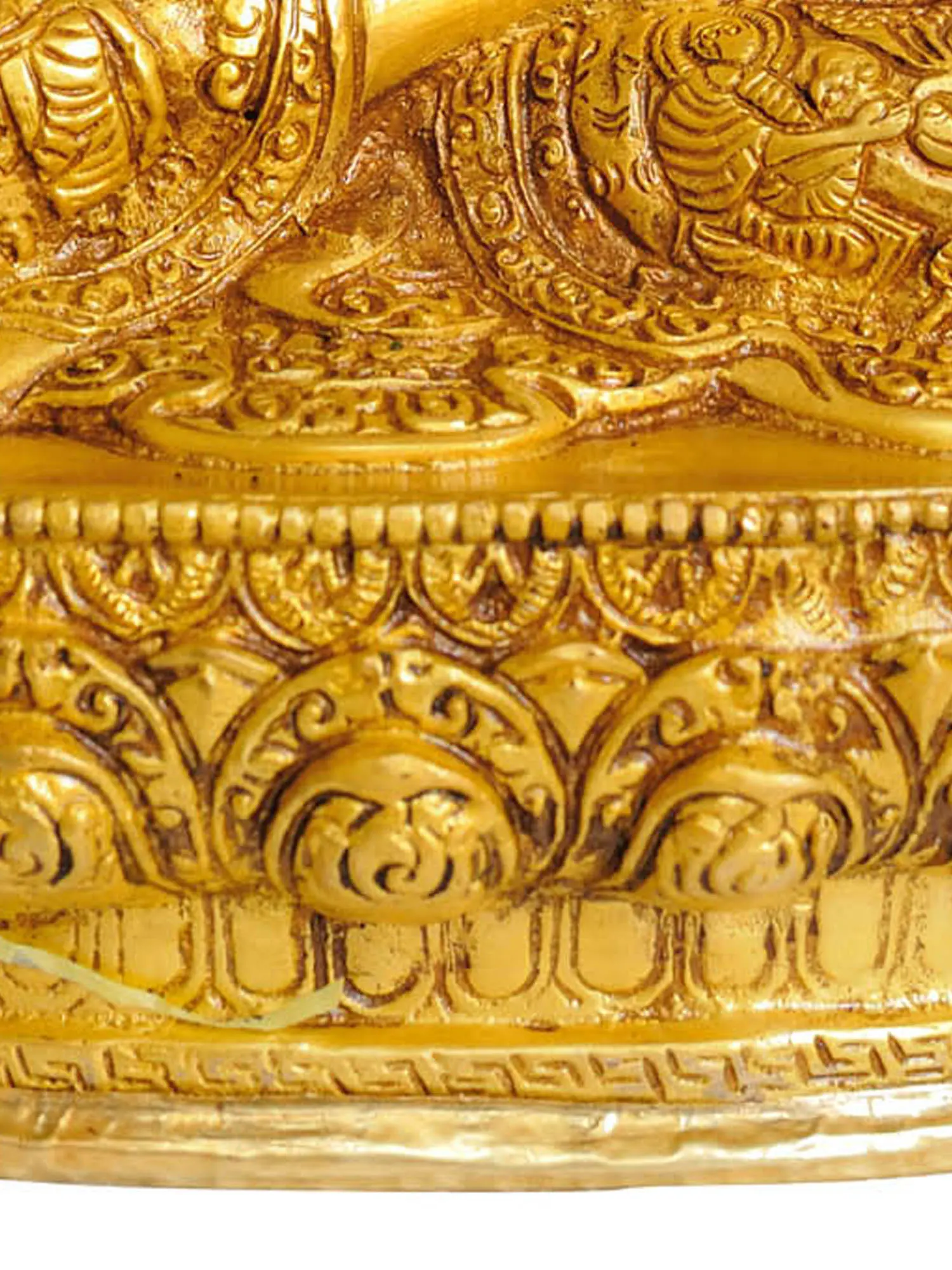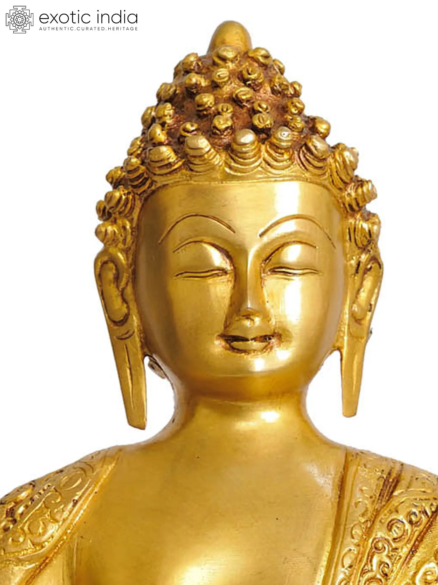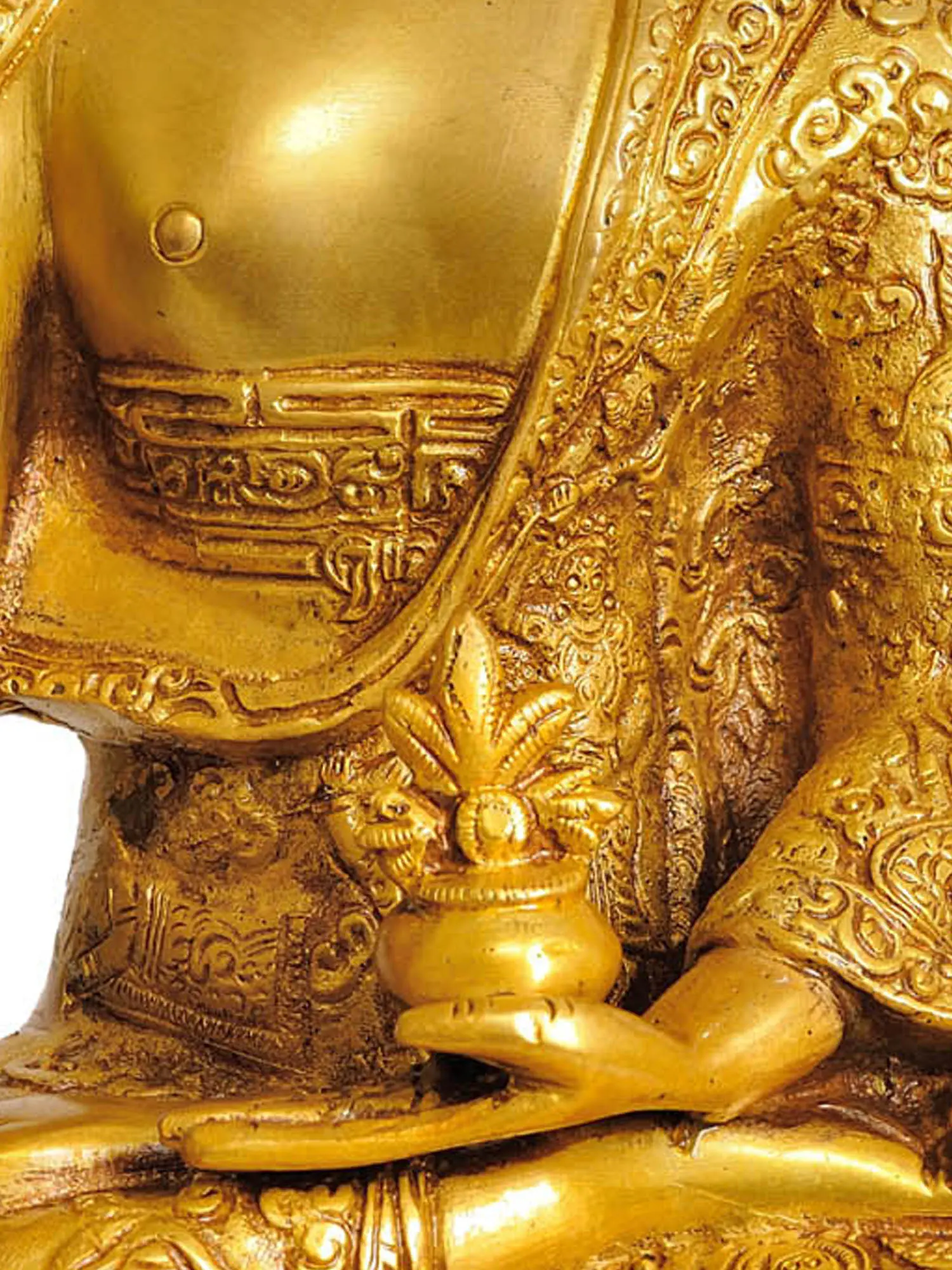 The sacred representation of the Medicine Buddha in brass embodies healing and compassion. Handmade in India, this sculpture showcases the Tibetan Buddhist deity adorned in a robe decorated with scenes from the life of Buddha. The detailed craftsmanship invites contemplation on the transformative power of healing and compassion, fostering an ambiance of spiritual well-being and peace. Each detail within this sculpture encourages viewers to explore the symbolism of healing and spiritual wellness, fostering an ambiance of divine compassion and inner peace.