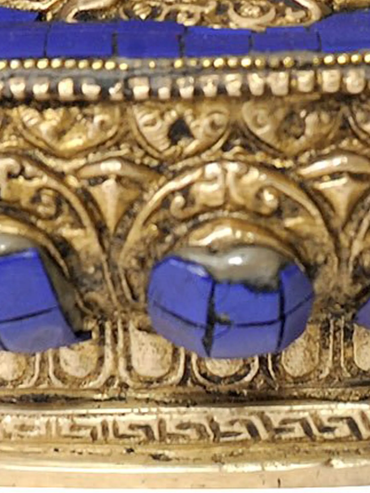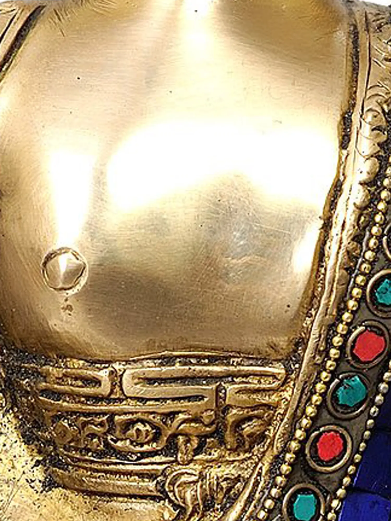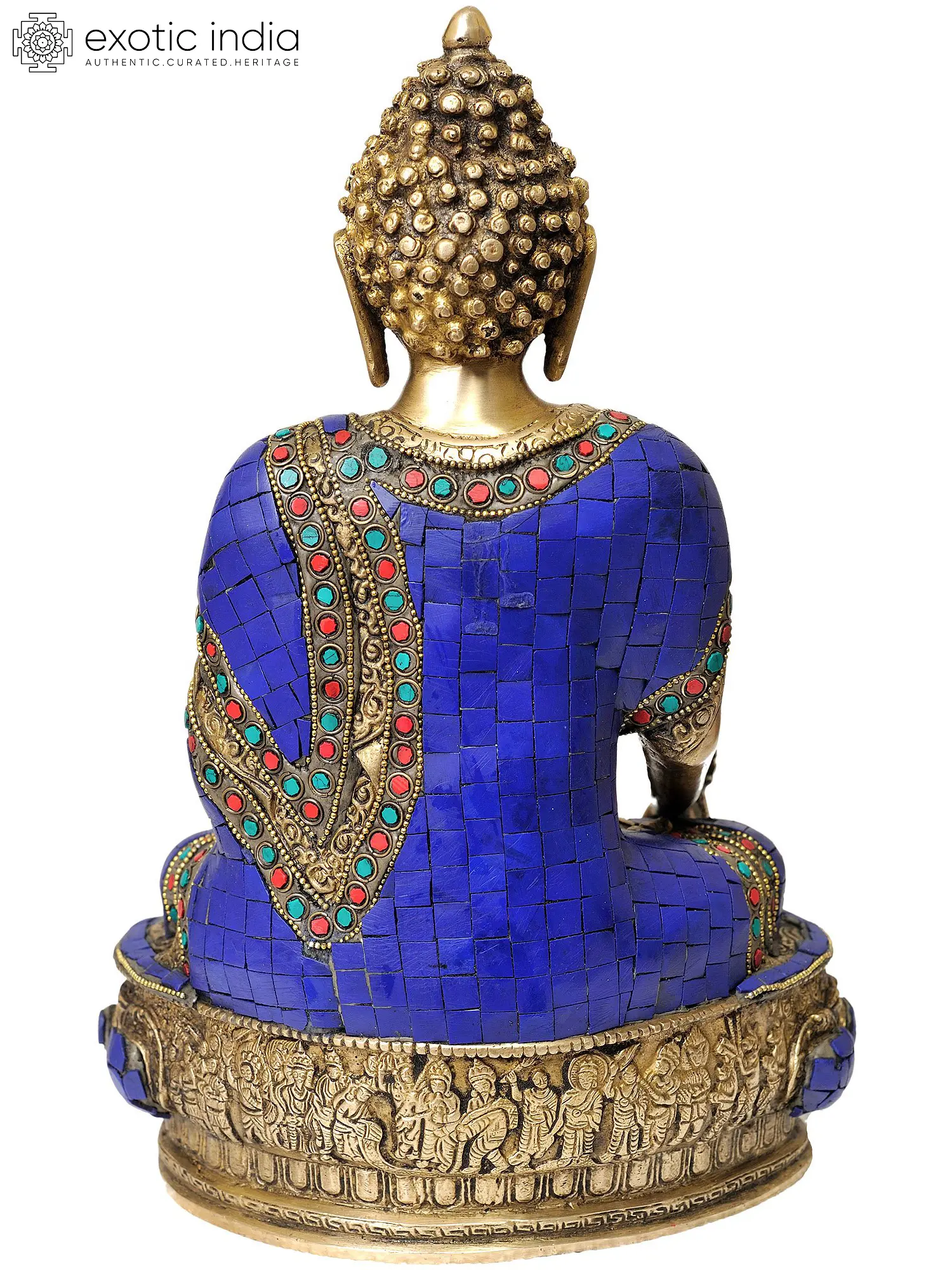 Handcrafted in India, this statue is a testament to skilled artistry and devotion. The primary material is brass, a metal associated with purity and auspiciousness in many traditions. The intricate details of the Buddha's robes, the serene expression, and the finely sculpted features speak to the meticulous craftsmanship involved. The robes are adorned with a vibrant mosaic of inlaid stones, predominantly deep blue lapis lazuli, punctuated by striking red and turquoise accents. Lapis lazuli, historically prized for its celestial hue, is believed to represent the heavens and is often associated with wisdom and enlightenment. The red and turquoise stones further enhance the visual richness and symbolic depth, suggesting vitality and the dispelling of negative energies. The base of the statue is equally ornate, featuring lotus petal motifs and decorative borders that elevate the entire piece.