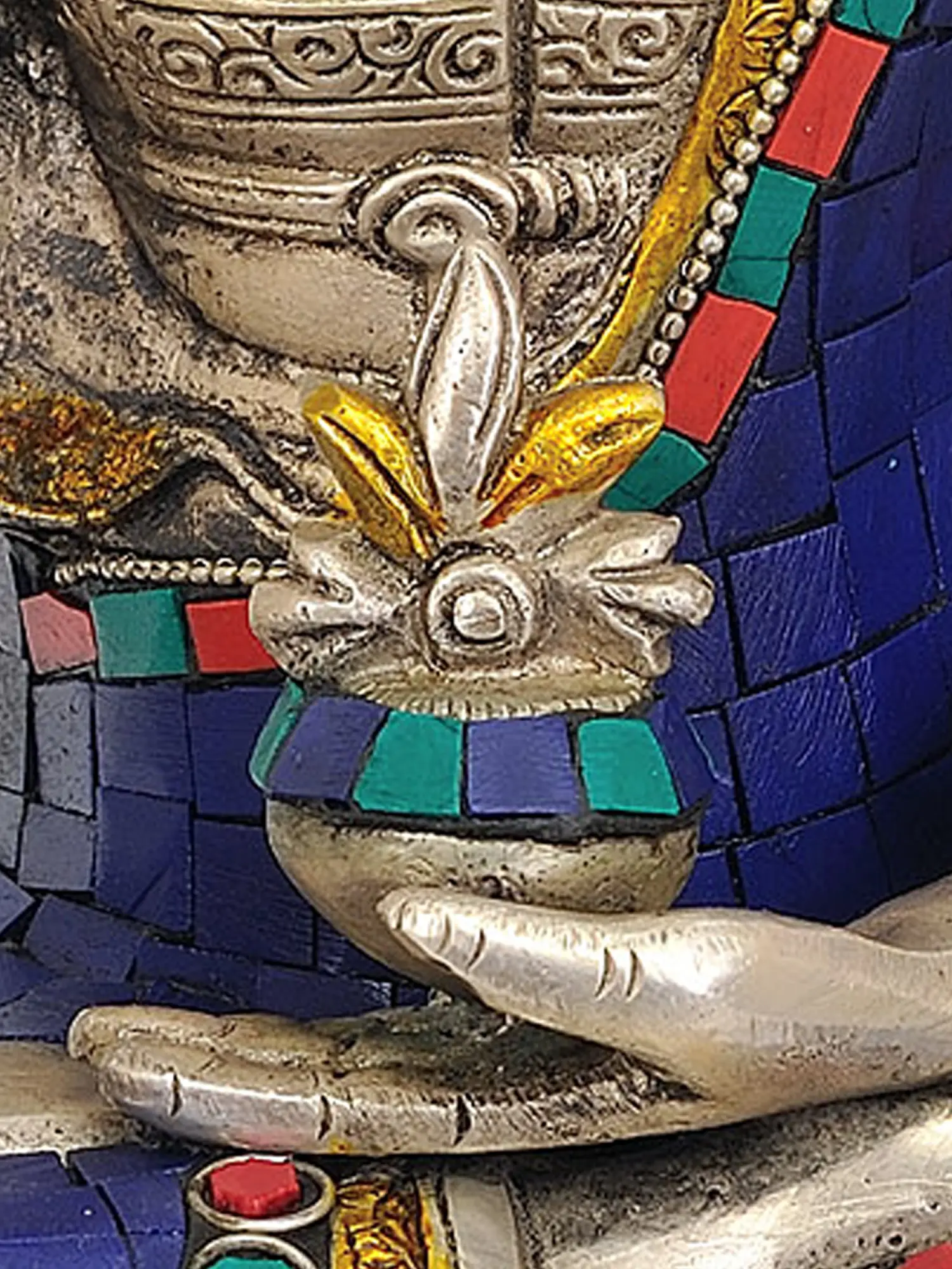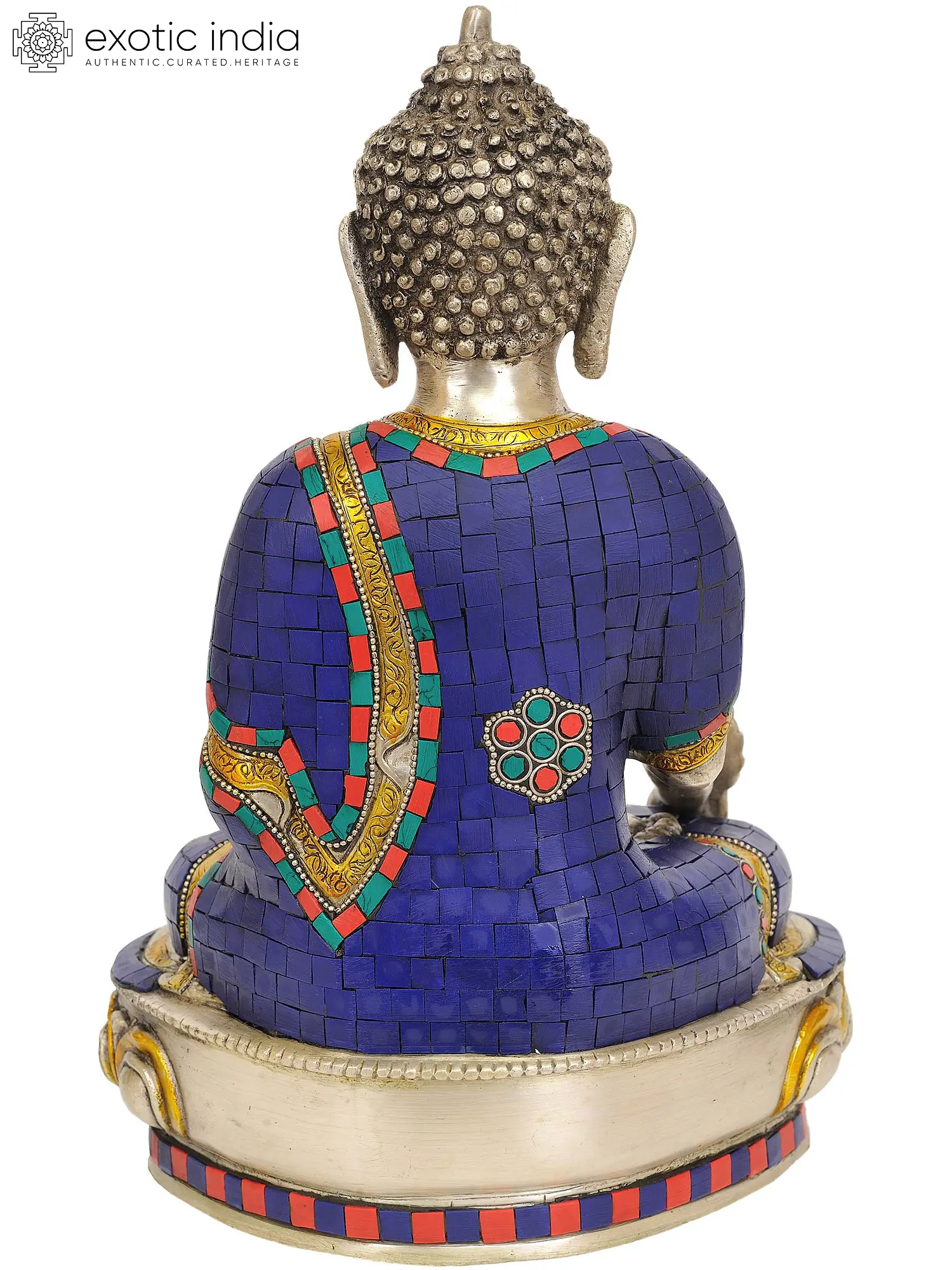 This impressive twelve-inch statue showcases the artistry of Indian craftsmanship. The shimmering brass, polished to a soft gleam, forms the serene figure of the Medicine Buddha, seated in the traditional lotus posture. His right hand rests on his right knee, palm facing outward in the gesture of blessing or granting boons, while his left hand cradles an alms bowl filled with the celestial elixir of immortality. The intricate details of his monastic robes are further enhanced by vibrant inlays of lapis lazuli, coral, and turquoise. These gemstones are not merely decorative; they hold deep symbolic meaning in Buddhist tradition. Lapis lazuli, with its deep azure hue, is associated with healing, wisdom, and spiritual enlightenment. Coral, a vibrant red, symbolizes life force, courage, and protection. Turquoise, in its rich sky-blue or greenish shades, represents wisdom, tranquility, and the power of the heavens. The vibrant mosaic of these precious stones against the polished brass creates a visually stunning and spiritually resonant artwork.