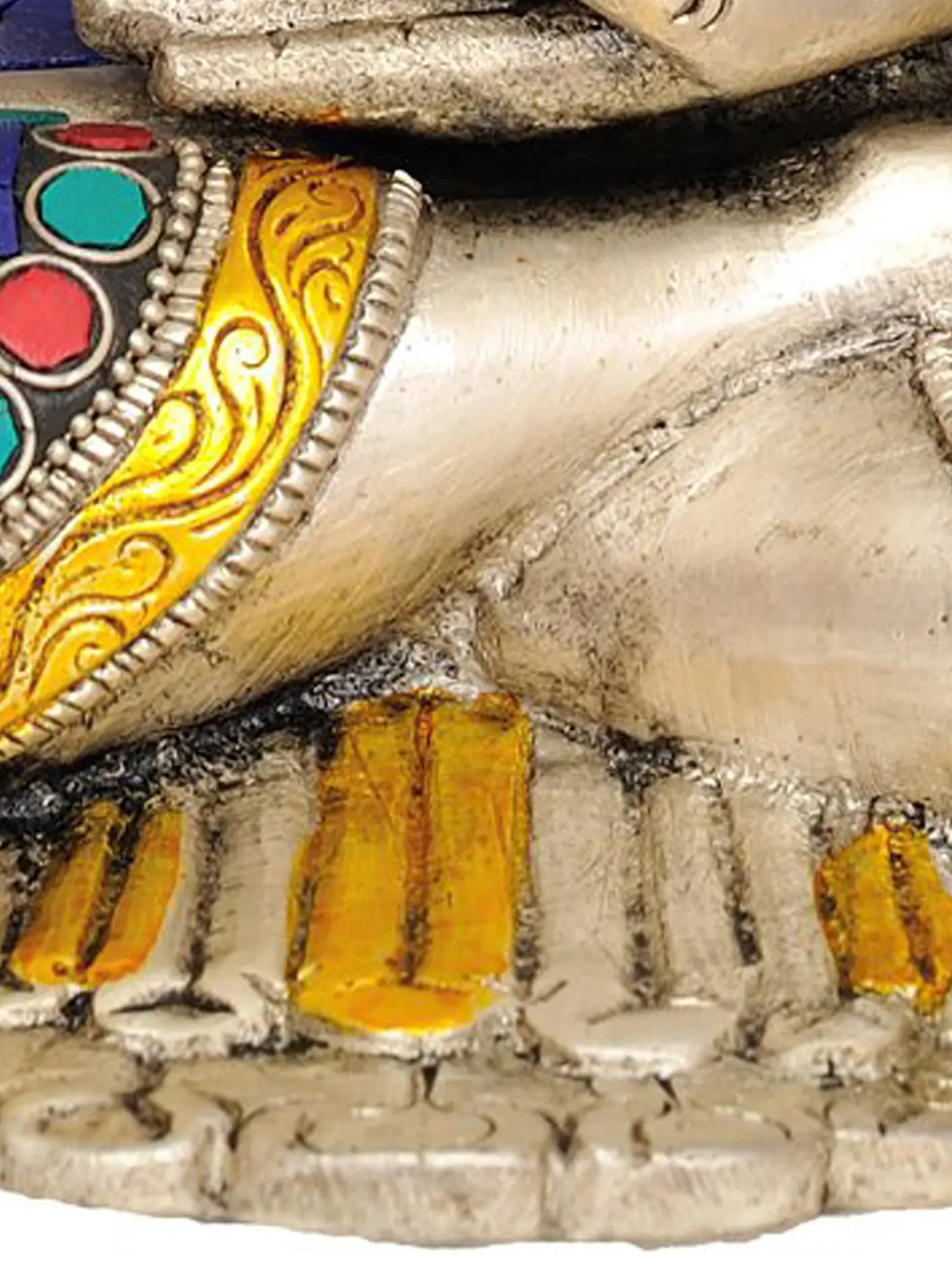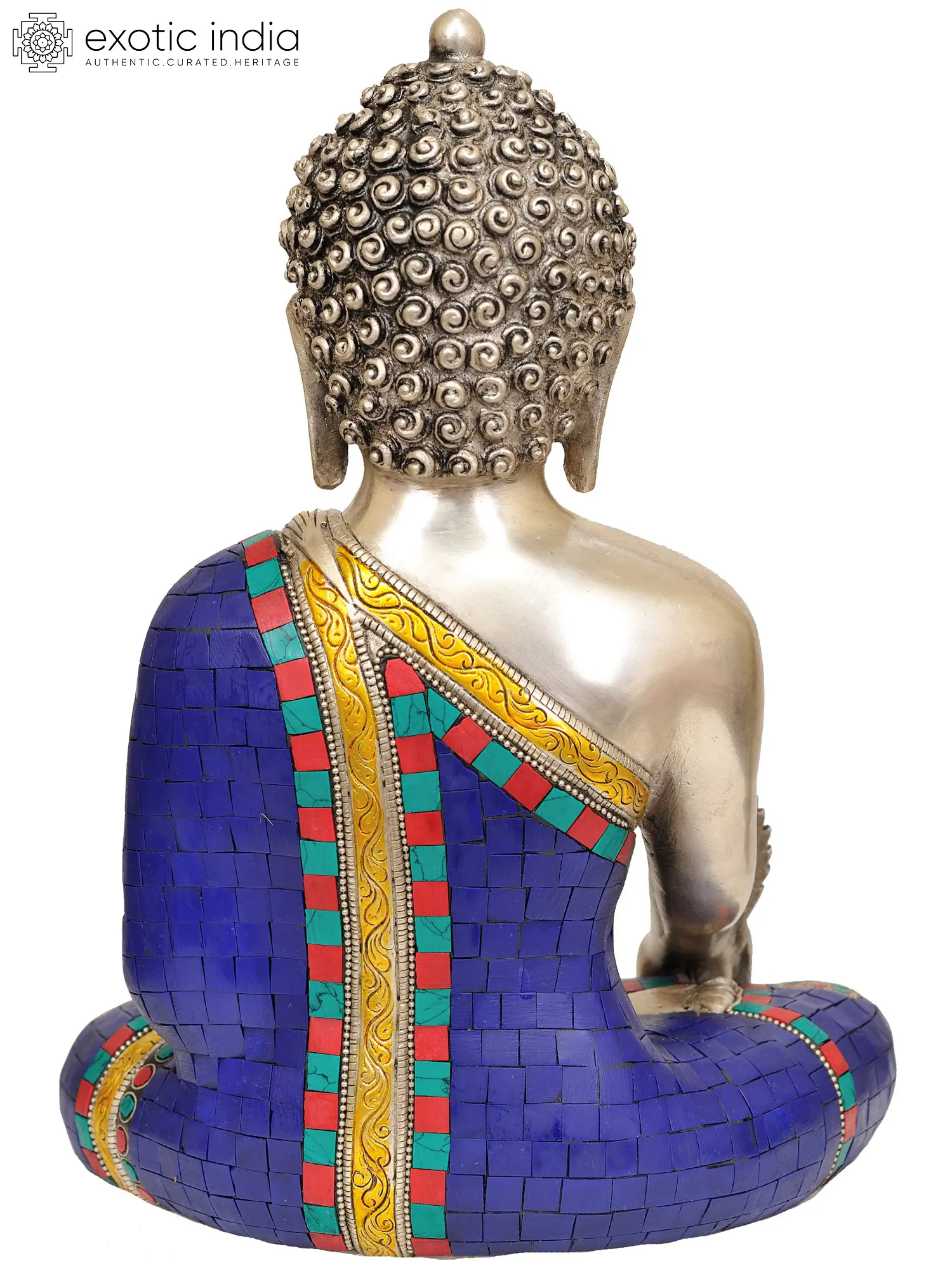 This remarkable statue is a testament to the rich artistic heritage of India, meticulously handcrafted by skilled artisans. The choice of brass lends a dignified weight and enduring quality, while the intricate inlay work elevates it to a true work of art. Vibrant blue stones, interspersed with ruby red and turquoise green accents, adorn his monastic robes, creating a dazzling mosaic that speaks of both opulence and profound spiritual symbolism. The yellow and gold detailing on the robe's trim, along with the delicate leaf-like motif held in his left hand, showcase the artisans' attention to even the finest details. Each element is thoughtfully rendered, reflecting a deep understanding of Buddhist iconography and a commitment to preserving traditional craftsmanship.