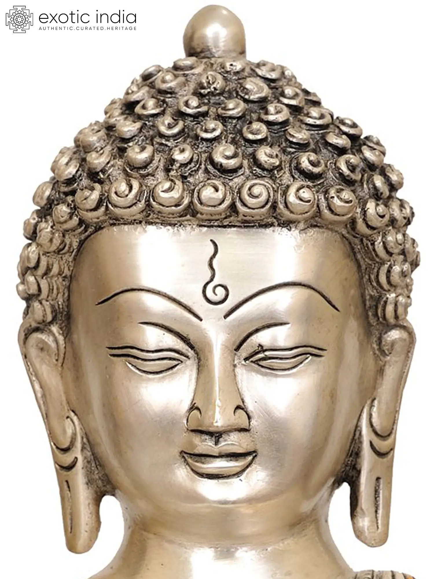 In the heart of Buddhist traditions, the Medicine Buddha, known as Bhaisajyaguru, embodies the pinnacle of healing and compassion. This exquisite brass statue captures his serene essence, offering a powerful symbol of well-being and spiritual solace. Seated in the lotus posture, the Buddha's gentle gaze radiates tranquility, inviting peace into any space. His right hand is held in the gesture of granting boons, palm facing outwards, while his left hand cradles a medicine bowl, from which the nectar of healing flows. This iconography is deeply rooted in ancient Buddhist lore, where the Medicine Buddha is believed to possess the power to dispel suffering, cure illness, and guide beings toward enlightenment.