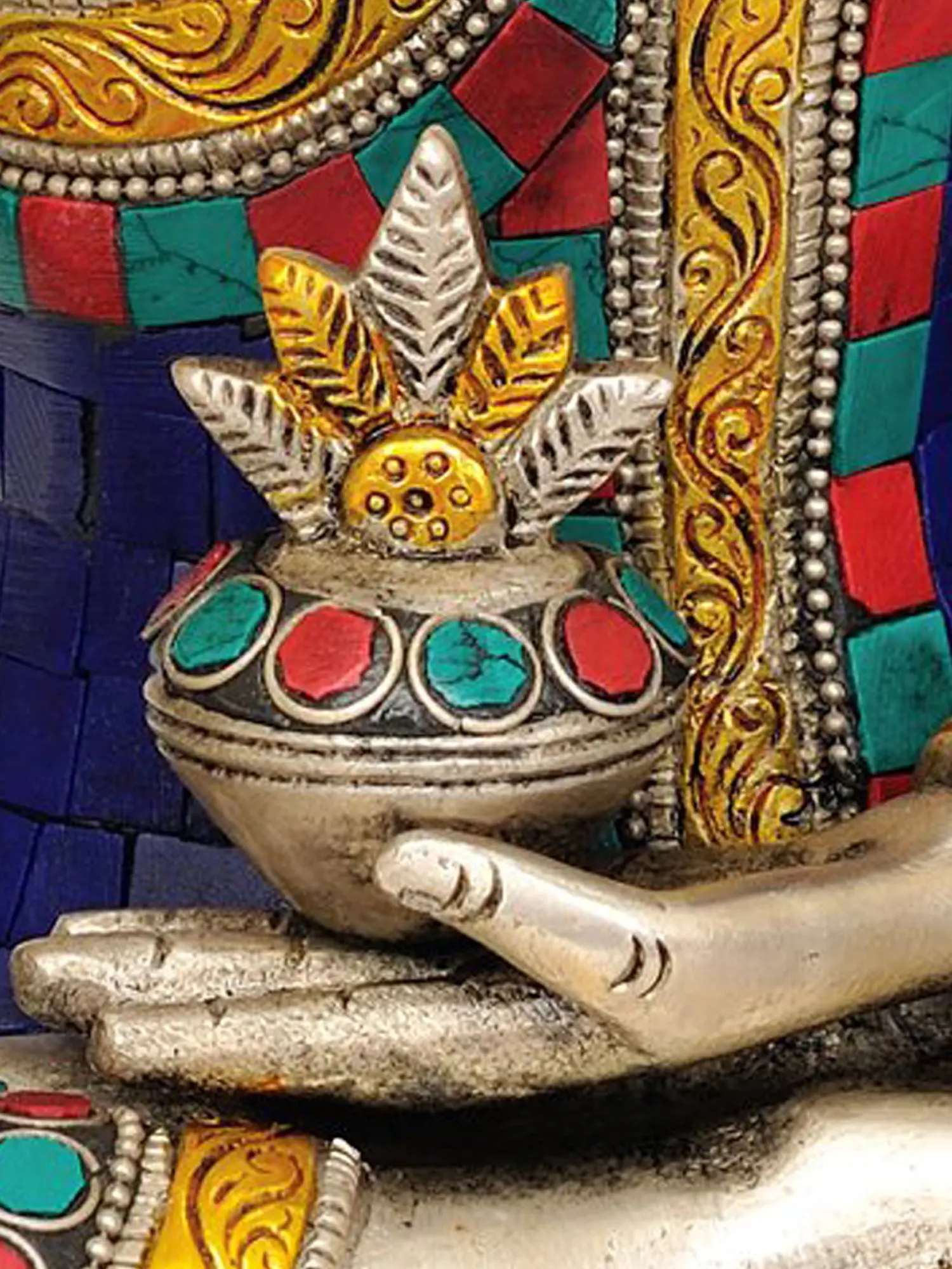 Whether placed in a personal meditation corner, a living room, or a sacred shrine, this Medicine Buddha statue serves as a powerful focal point for devotion and contemplation. Its significant size and the lustrous finish of the brass, combined with the striking gemstone inlays, ensure it will be a treasured centerpiece. The presence of the Medicine Buddha is believed to purify the environment, bring good fortune, and offer protection from harm. This handmade brass statue, originating from India, is an invitation to embrace the healing energy and profound compassion of the Medicine Buddha, bringing a sense of calm and spiritual enrichment to your home.
