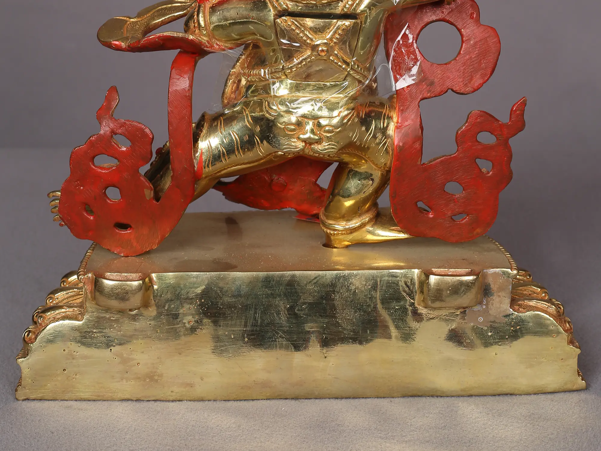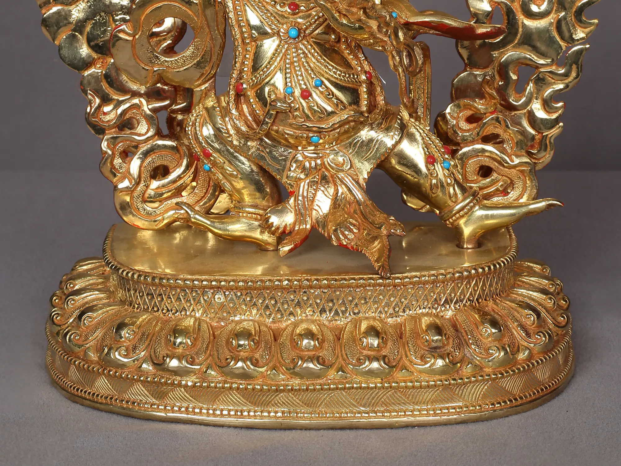 This magnificent statue captures the awe-inspiring presence of Vajrapani, a principal deity in Mahayana Buddhism, renowned as the "Lord of Secrets" and the embodiment of the power of all Buddhas. Crafted from copper and lavishly gilded with gold, this piece radiates an inner luminosity, reflecting Vajrapani's radiant and potent energy. The intricate detailing speaks to the profound spiritual significance of this powerful protector. The fierce yet compassionate expression on Vajrapani's face, with its bared teeth and third eye, signifies his unwavering vigilance against ignorance and the forces that obscure enlightenment. His dynamic posture, poised for action, conveys his readiness to overcome obstacles and destroy all negativity. The blazing aura of fire that surrounds him symbolizes the purifying flame of wisdom, burning away all illusions and spiritual impurities. Each element of this statue, from the powerful musculature to the dynamic adornments, is meticulously rendered to evoke the divine power and protection that Vajrapani offers. In Buddhist cosmology, Vajrapani is often depicted as a wrathful manifestation of the Buddha's power, descended to protect the Dharma and guide sentient beings towards liberation. He is the spiritual heir of the Buddha and, along with Manjushri (wisdom) and Avalokiteshvara (compassion), forms a powerful trinity of bodhisattvas. Legends tell of Vajrapani's role in subduing powerful demons and negative forces, ensuring the safety of the spiritual path for practitioners. His association with the vajra, the thunderbolt scepter, represents the indestructible and ultimate truth that he wields. The very name "Vajrapani" translates to "vajra in hand," underscoring his mastery over this symbol of power and enlightenment. This statue serves as a powerful reminder of the inner strength and protective qualities that are available to all who seek them.