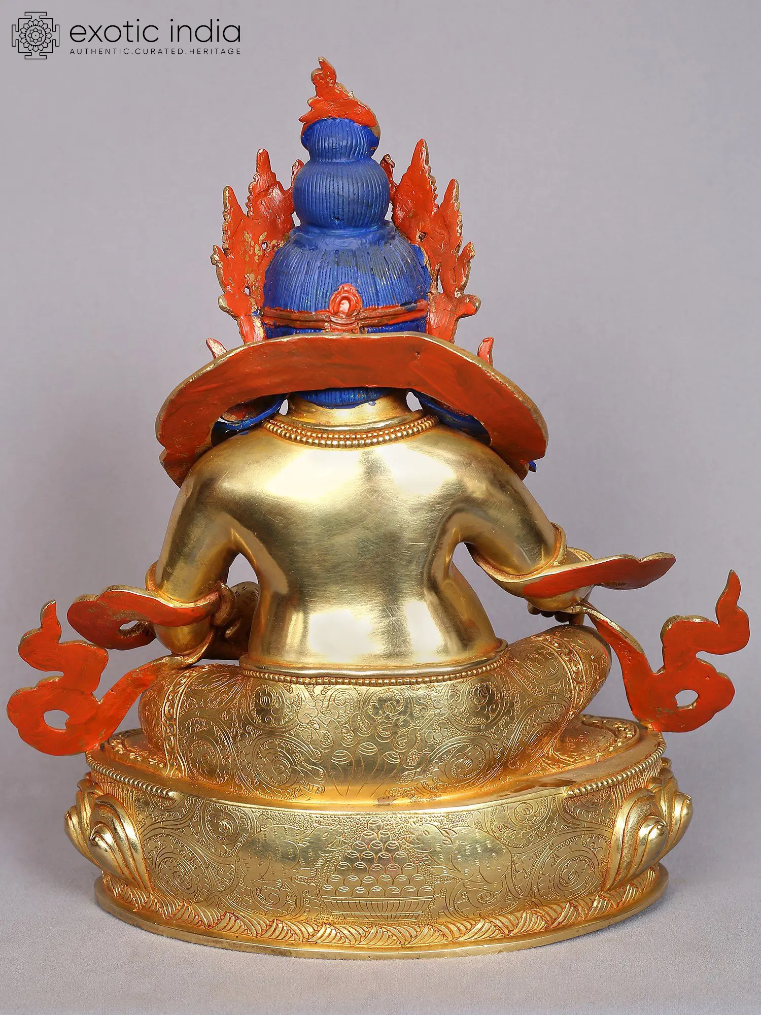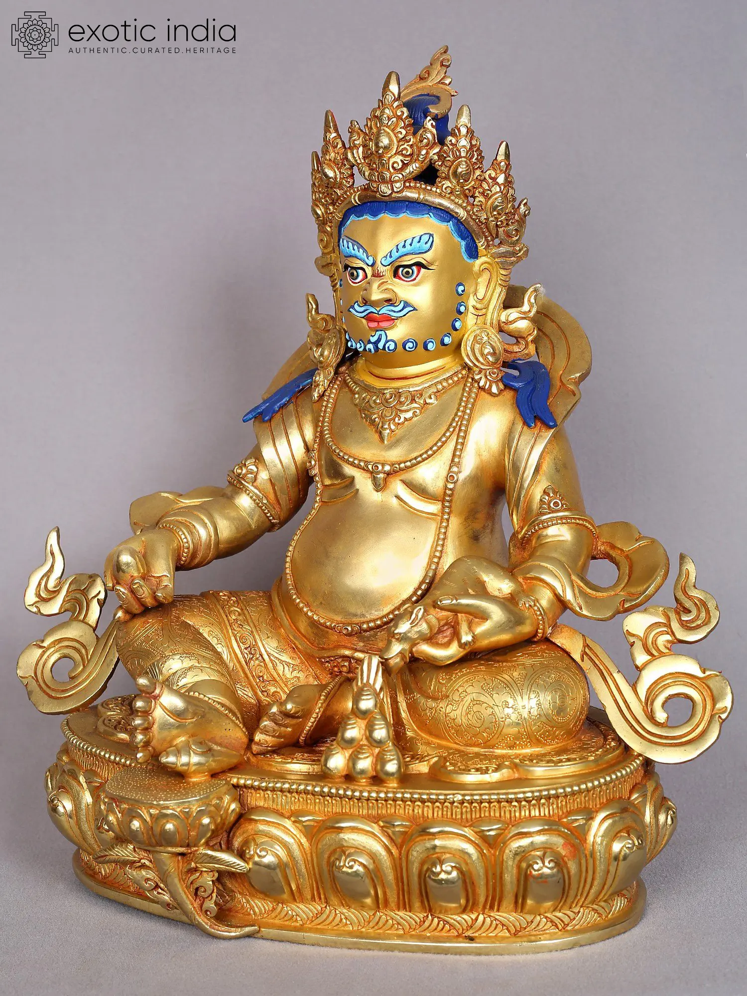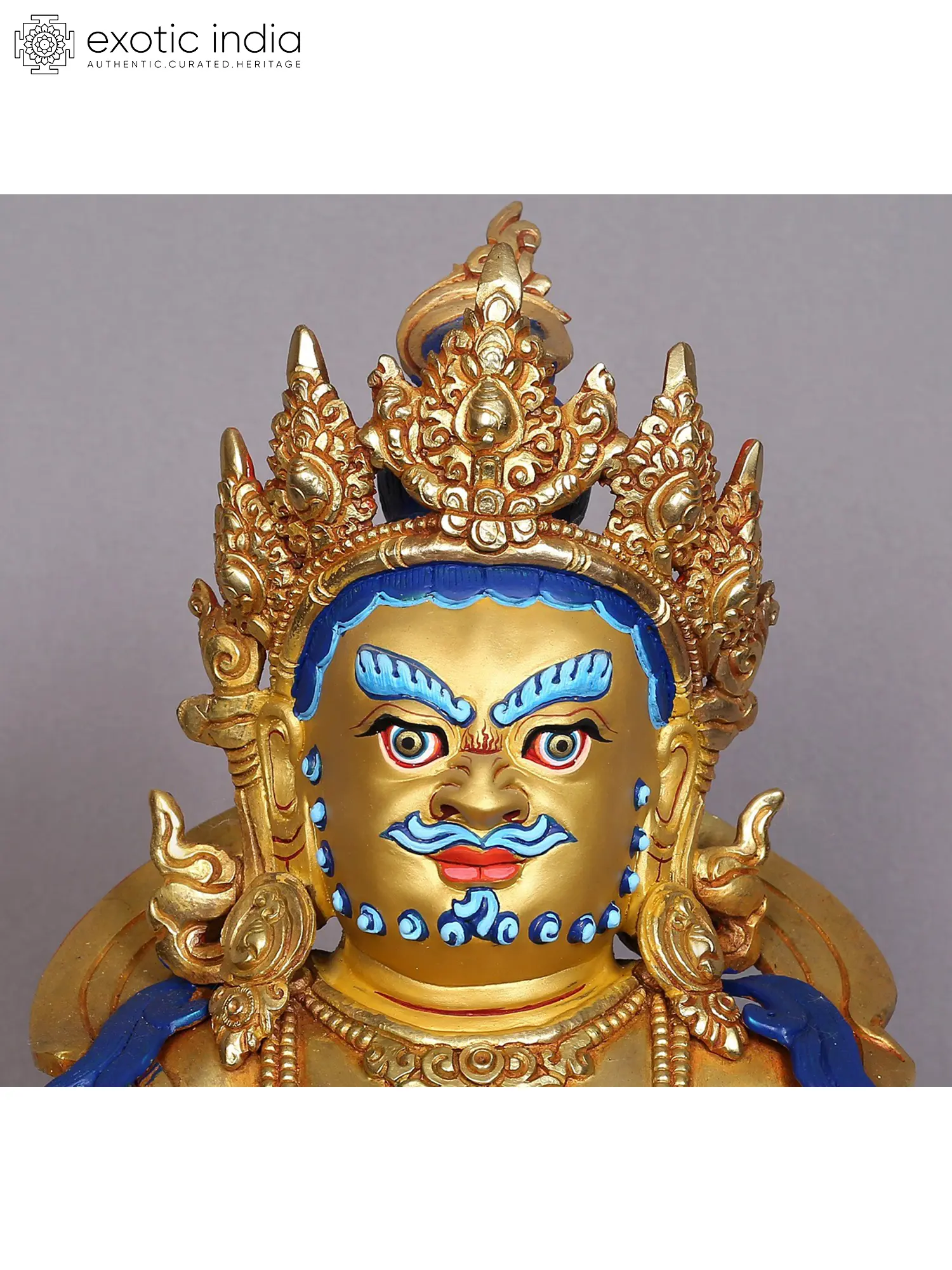 Kubera, known as Vaishravana in Buddhism, is revered as the God of wealth and the guardian king of the north direction, associated with Mount Sumeru. He boasts a golden-yellow complexion and a plump torso adorned with opulent gold ornaments. His five-pronged crown symbolizes the five transcendental Buddhas and his distinct features include large, expressive eyes, upturned lips, and a unique mustache and beard.