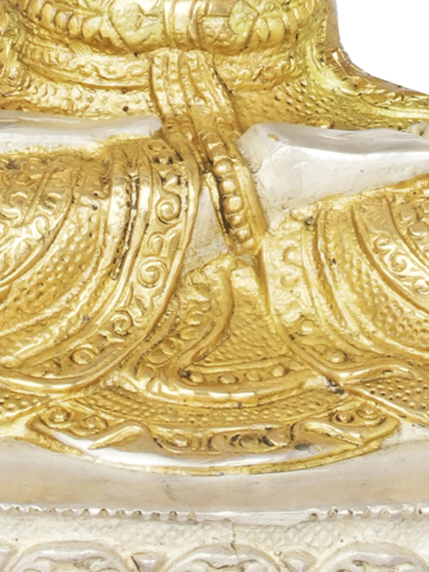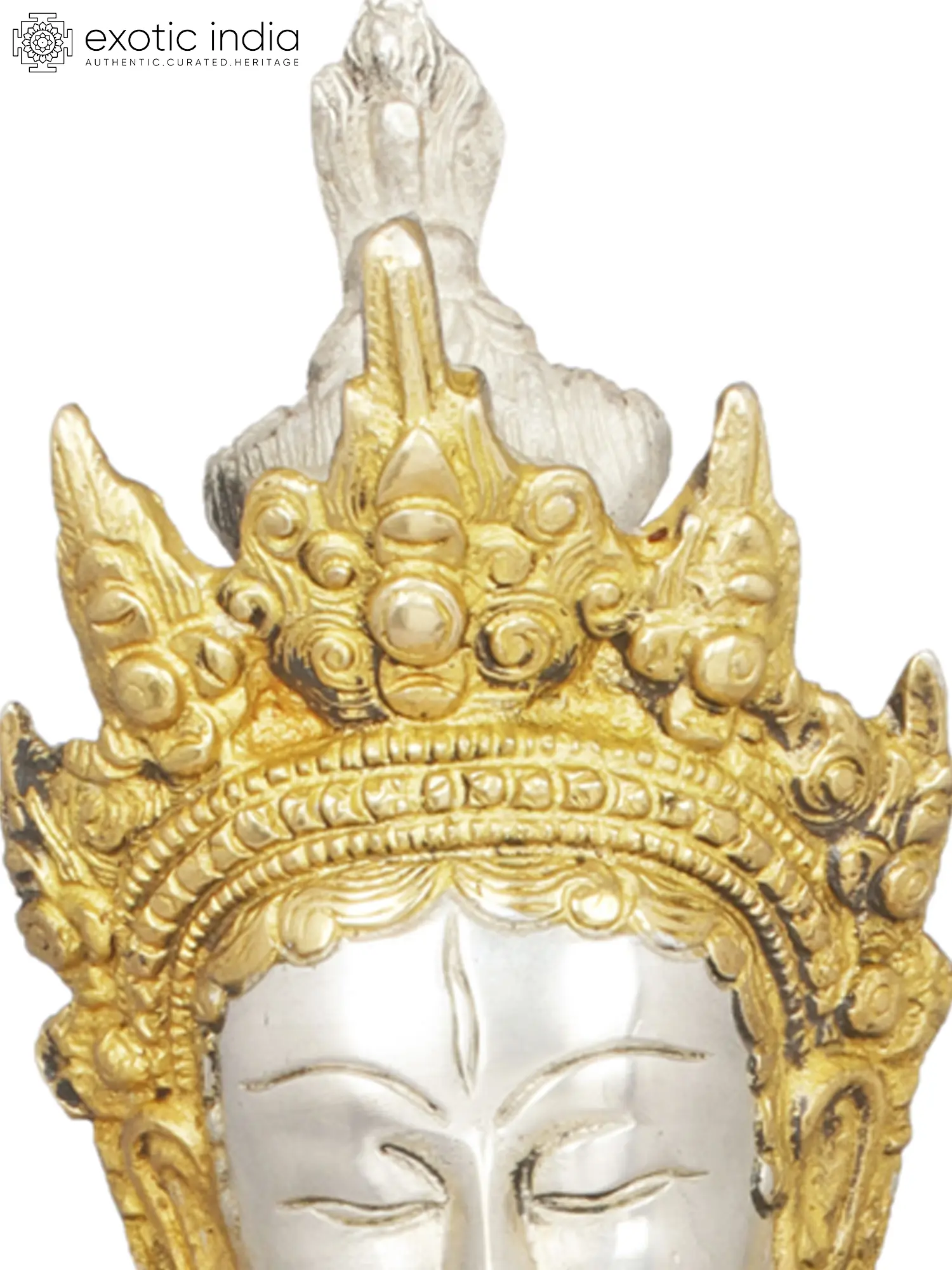 This exquisite brass sculpture captures the serene presence of White Tara, a revered deity in Tibetan Buddhism, celebrated for her compassion, healing powers, and longevity. With her eyes gently closed in meditation and a benevolent smile gracing her lips, she emanates an aura of profound peace and tranquility. Her posture, seated in the lotus position on a beautifully detailed pedestal, signifies spiritual attainment and inner stillness. Each element of this meticulously crafted statue speaks of ancient artistry and deep spiritual significance, making it a powerful focal point for any sacred space or a cherished art piece.